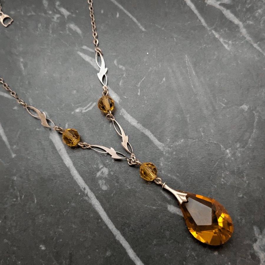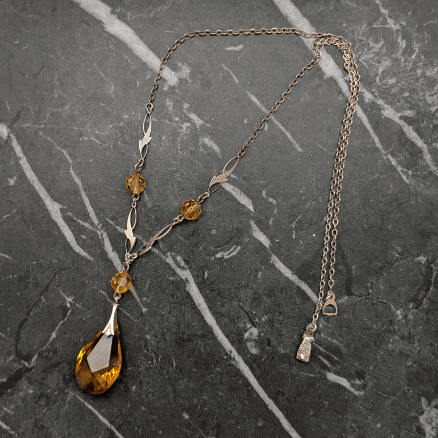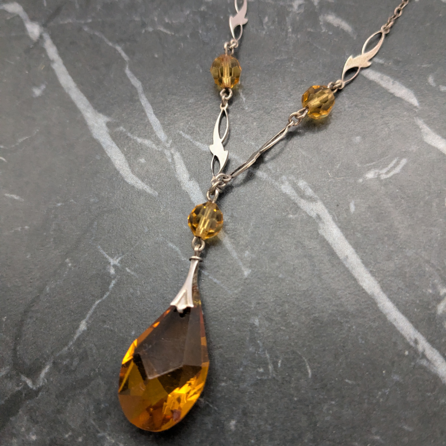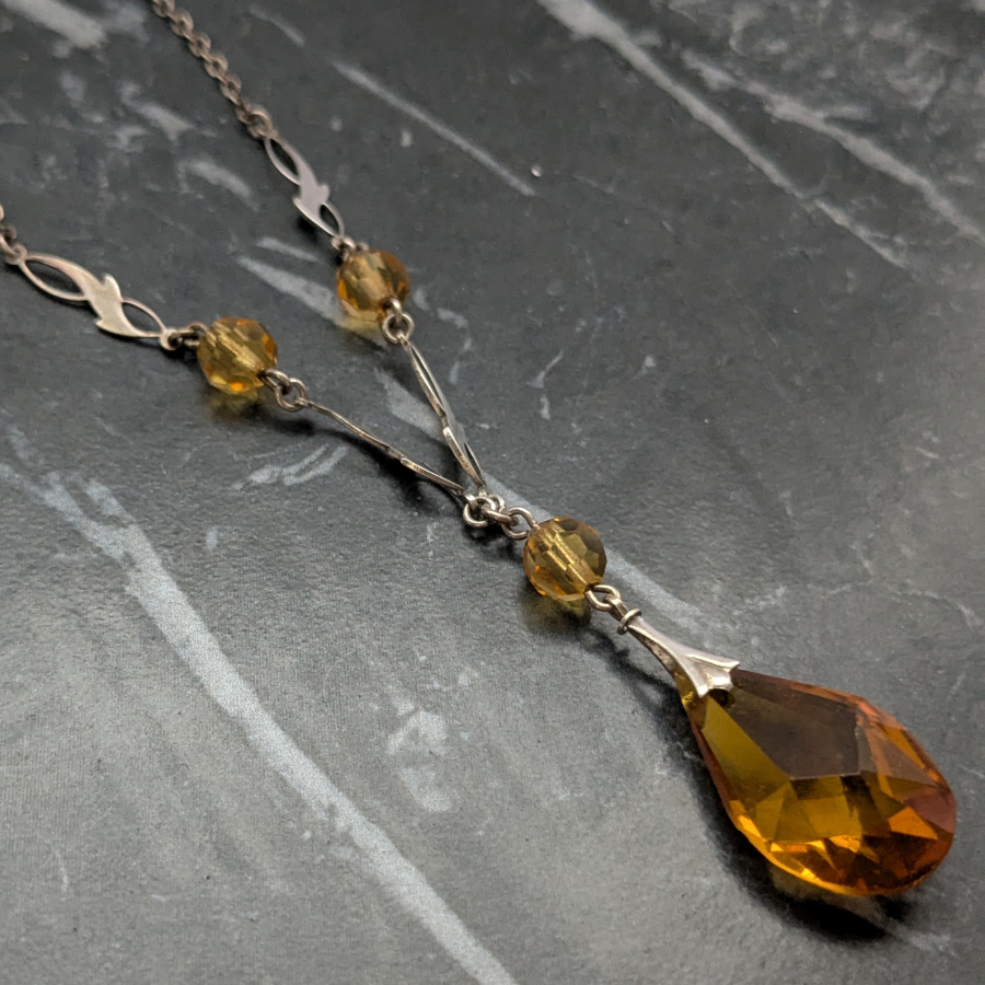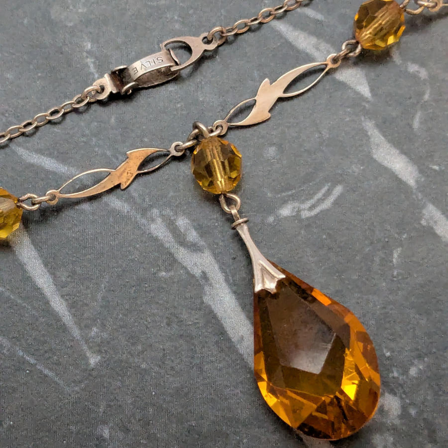 Beautiful Art Deco necklace featuring amber coloured glass beads and pendant drop. The necklace is made from sterling silver and the word silver can be found on the back of the clasp.
