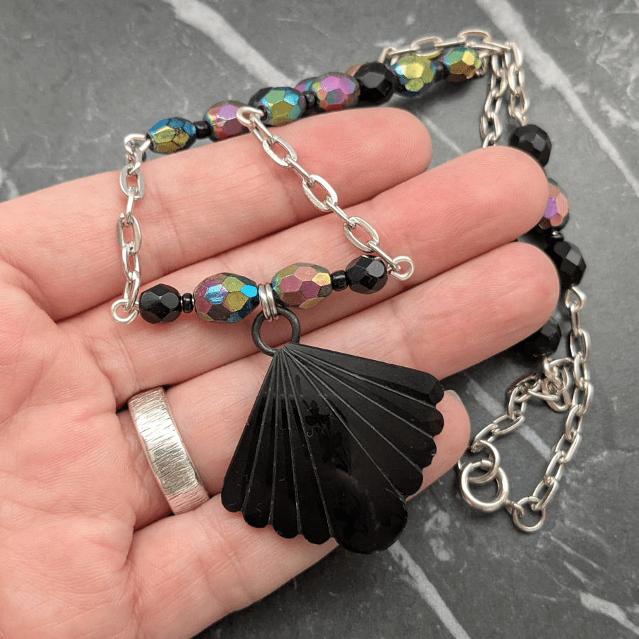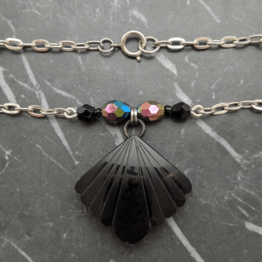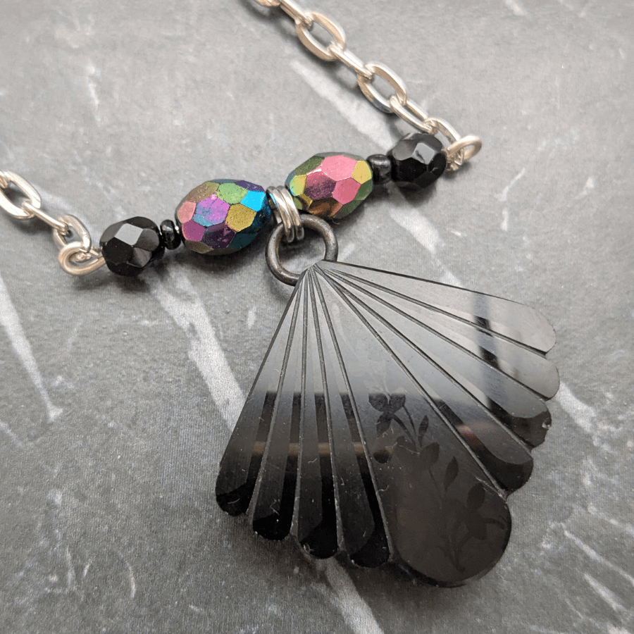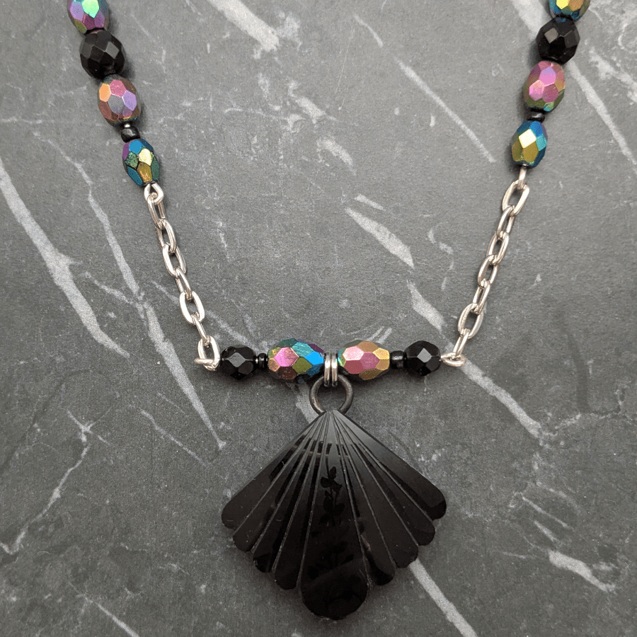 The necklace is finished with glass beads chosen to complement the colours of the buckle, creating a harmonious and eye-catching piece that feels both vintage and contemporary.