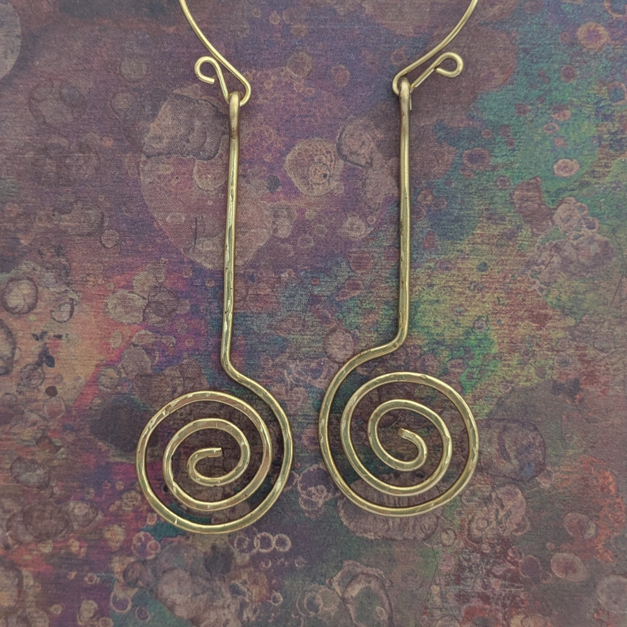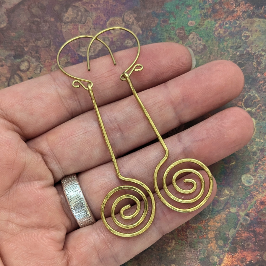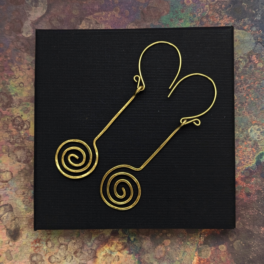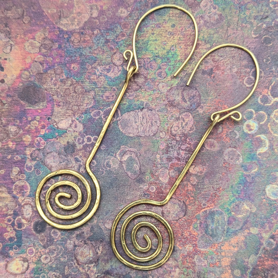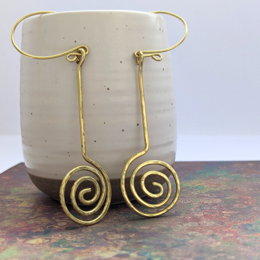 Handcrafted Brass Spiral Drop Earrings With Hammered Finish