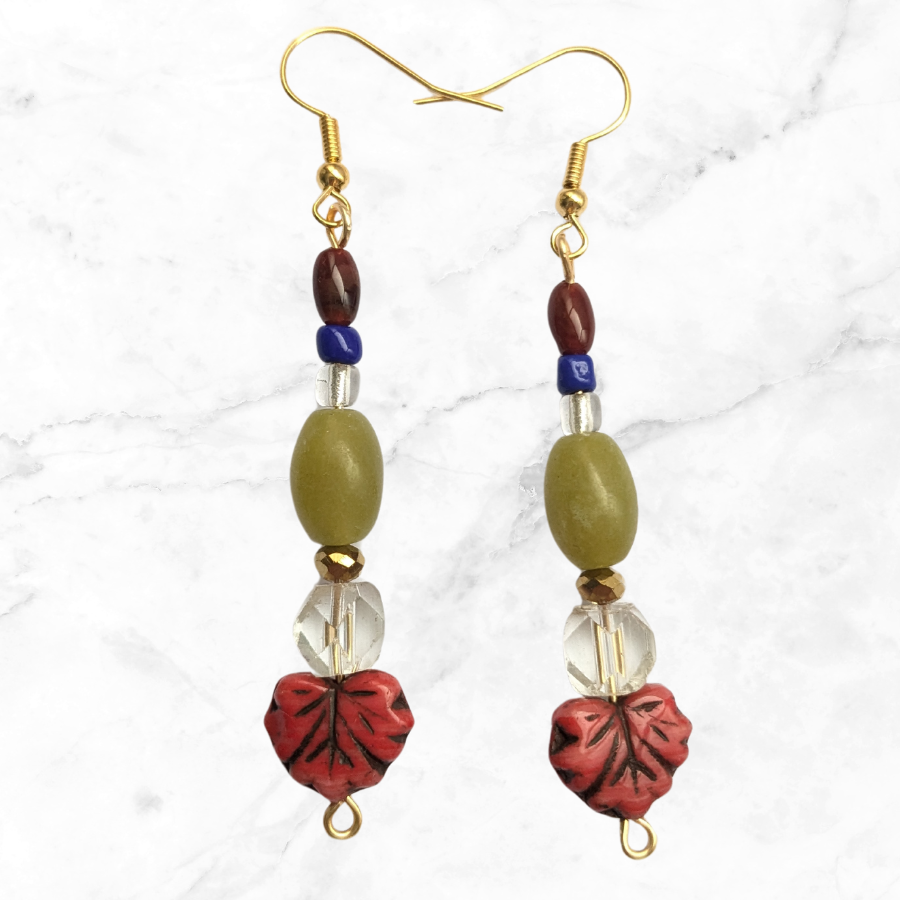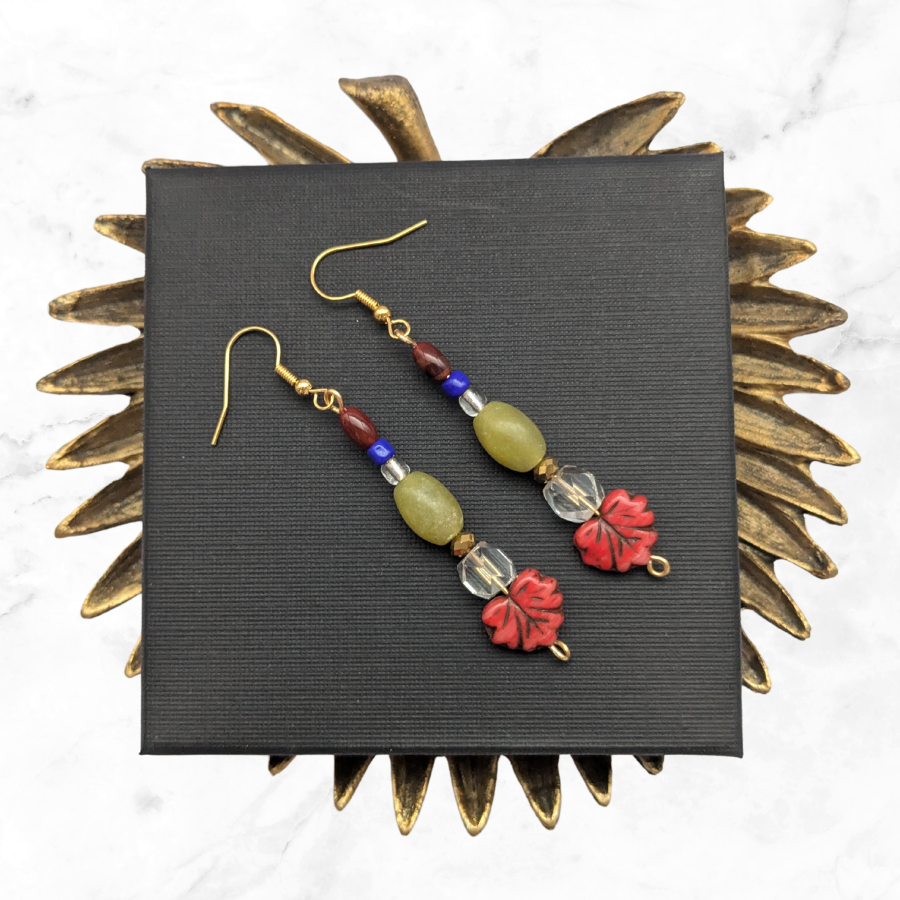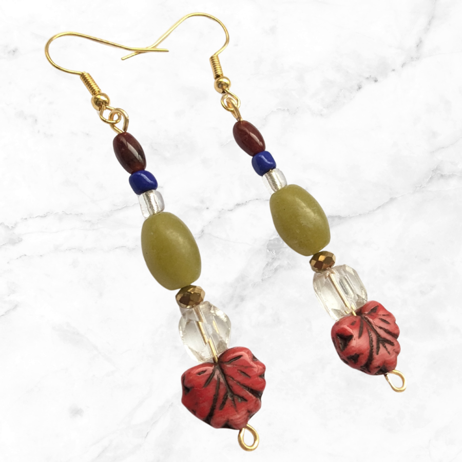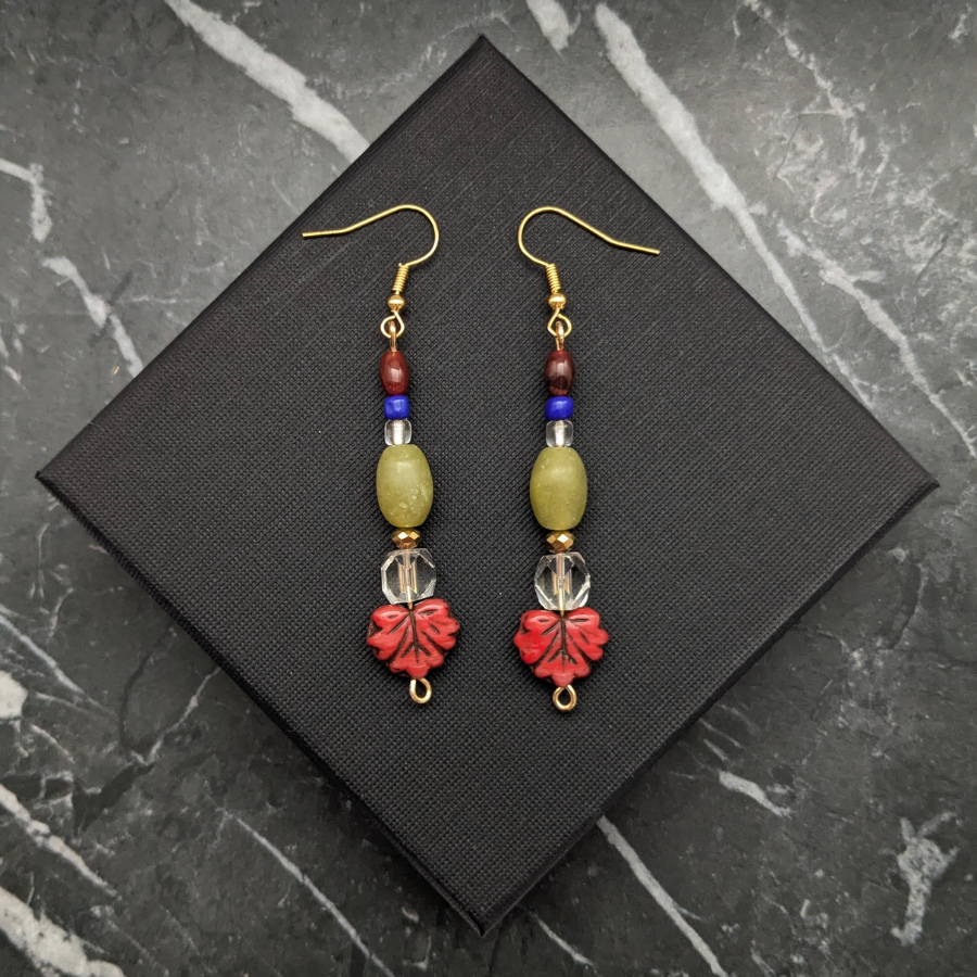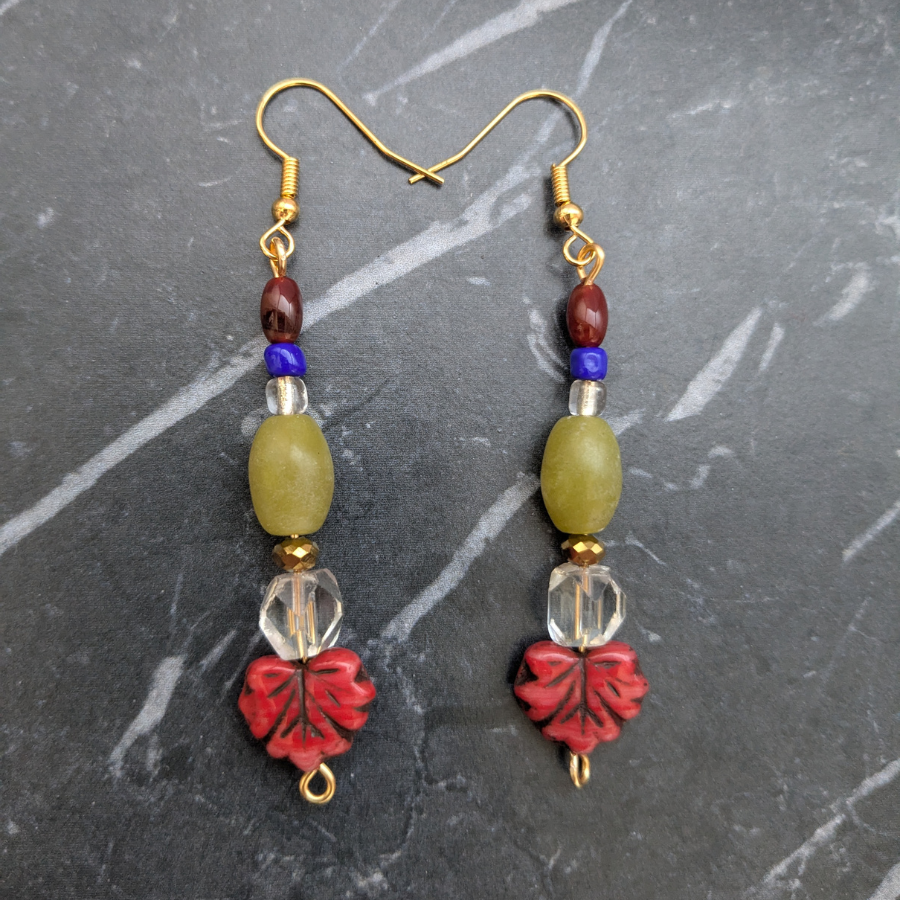 This pair features a blend of modern and vintage elements, rescued from broken and discarded jewellery. They include Art Deco glass beads, red leaf beads, carnelian and nephrite jade beads.