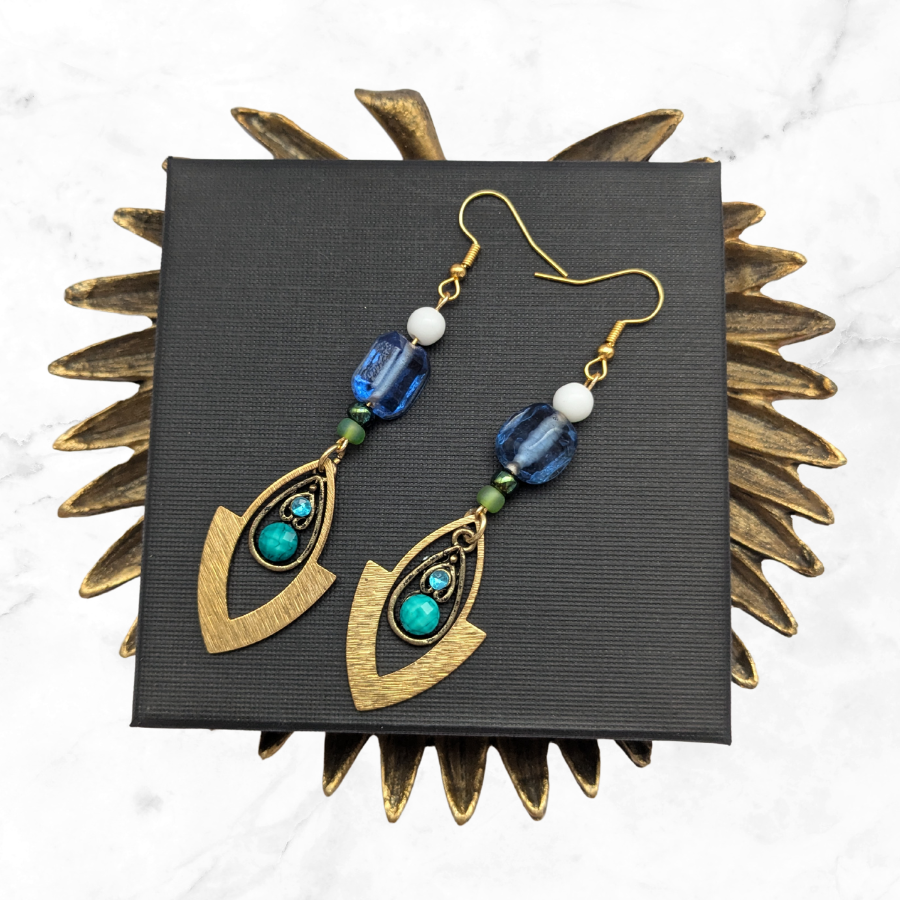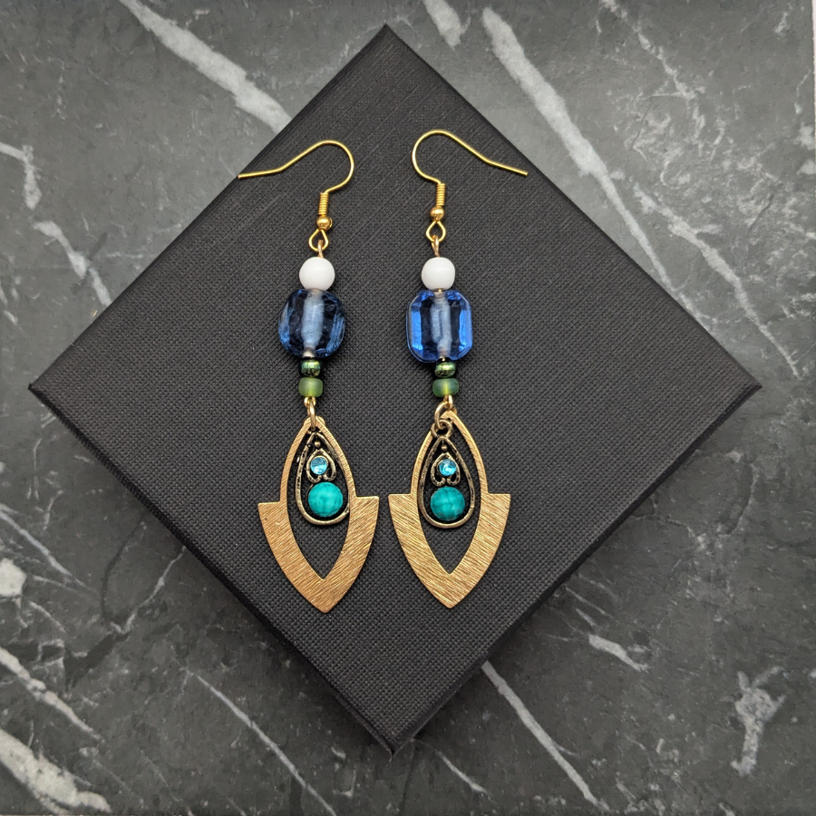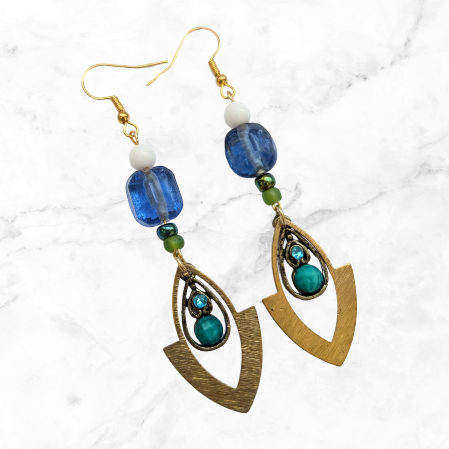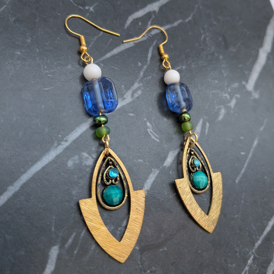 This pair features a blend of modern and vintage elements, rescued from broken and discarded jewellery. They include Art Deco glass beads, milk glass beads and brass drops.