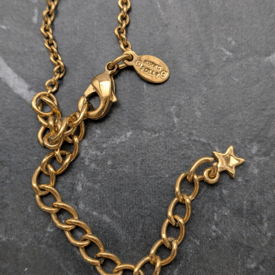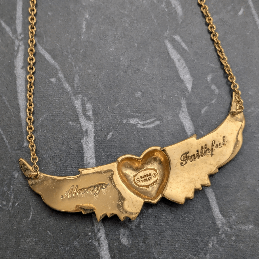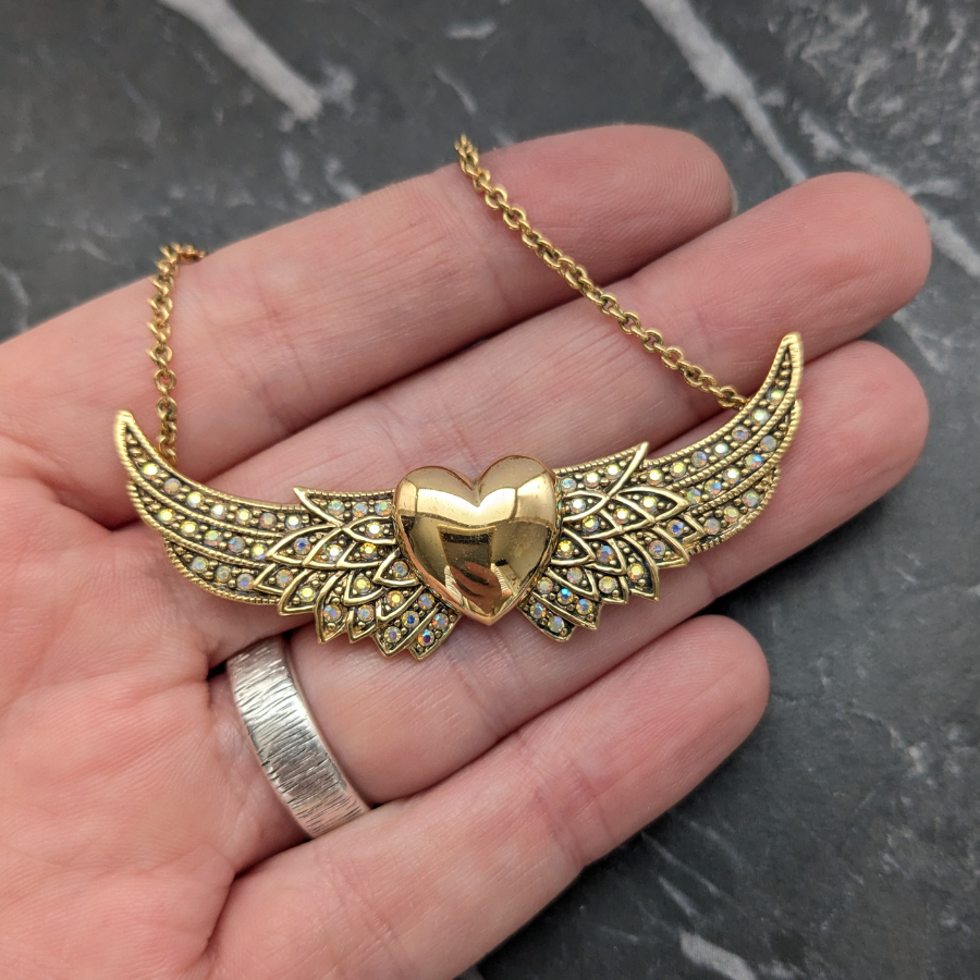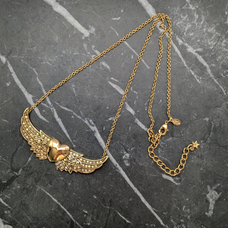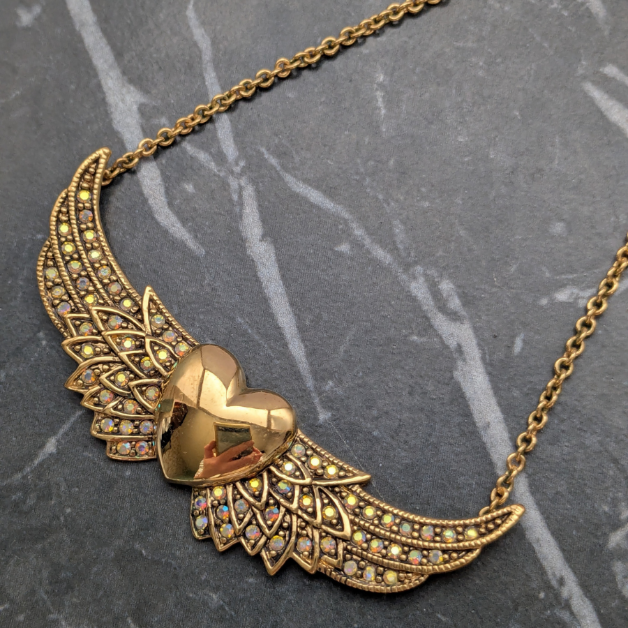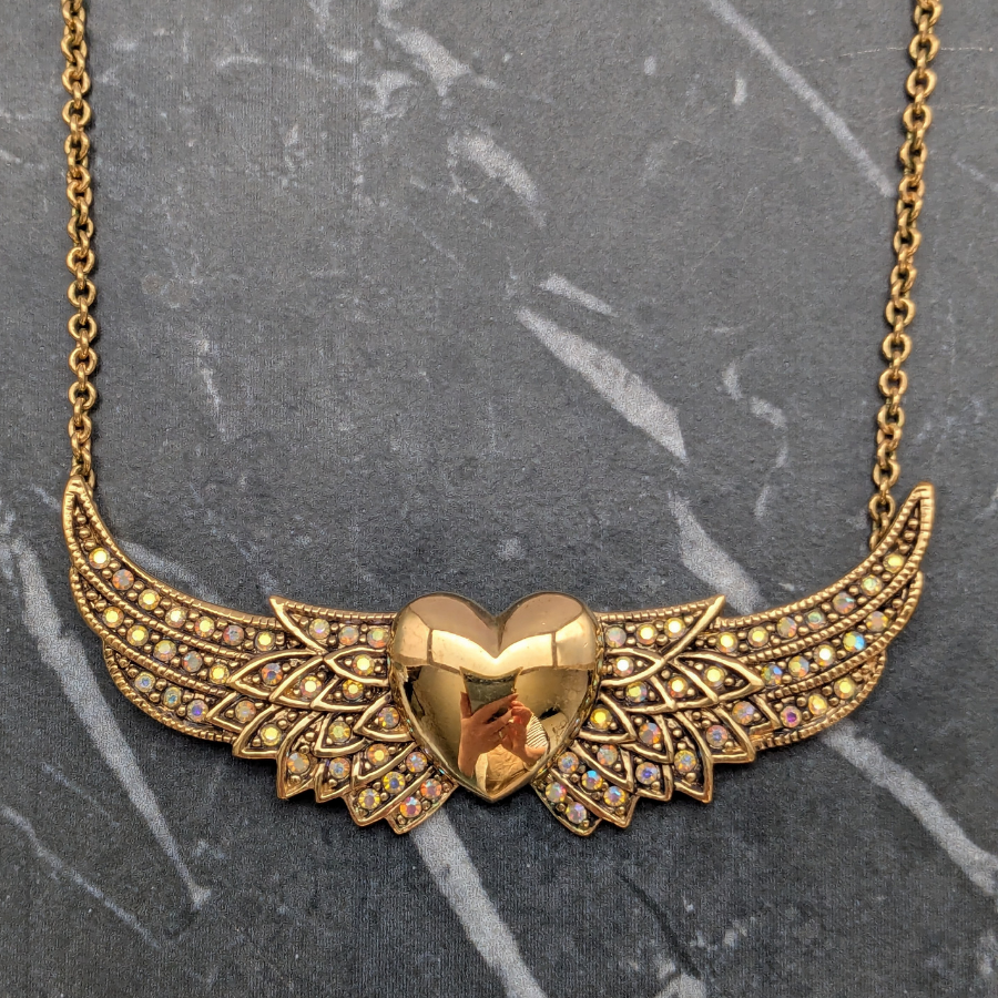 Beautiful necklace by Kirks Folly. It features a gold tone chain and pendant. The pendant section is of a heart with wings and has aurora borealis rhinestones set into the wings.