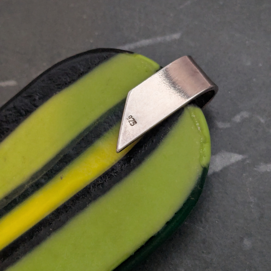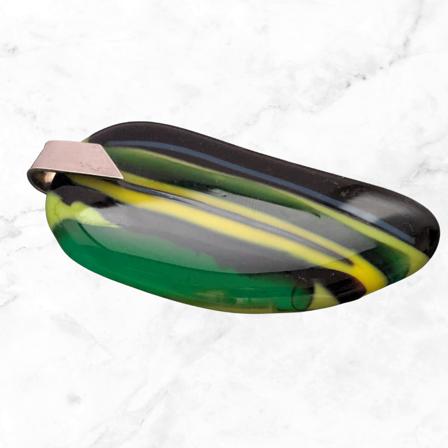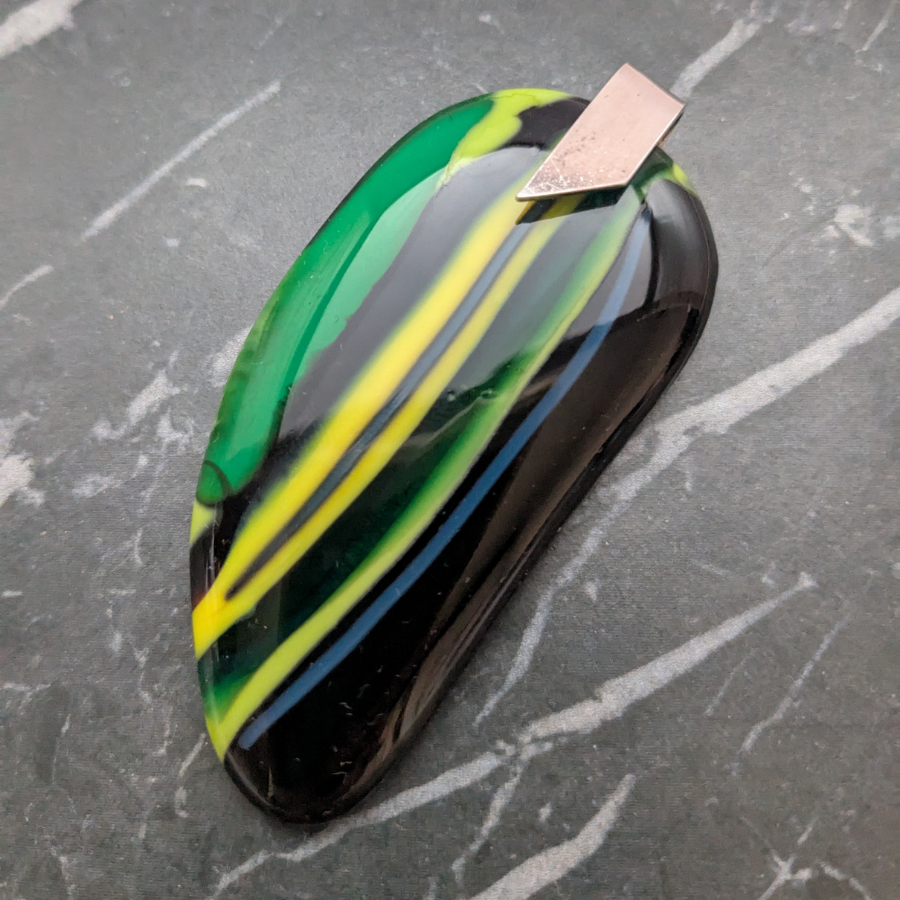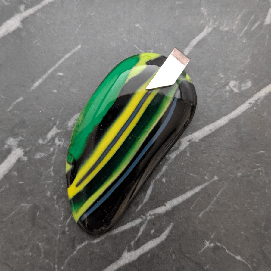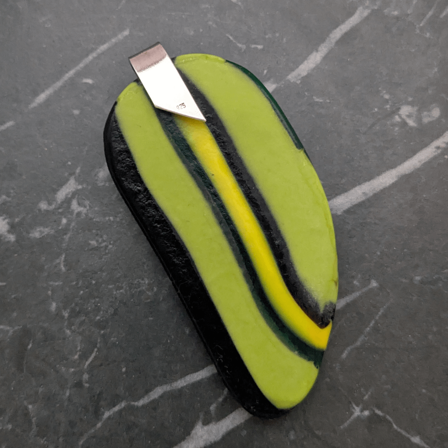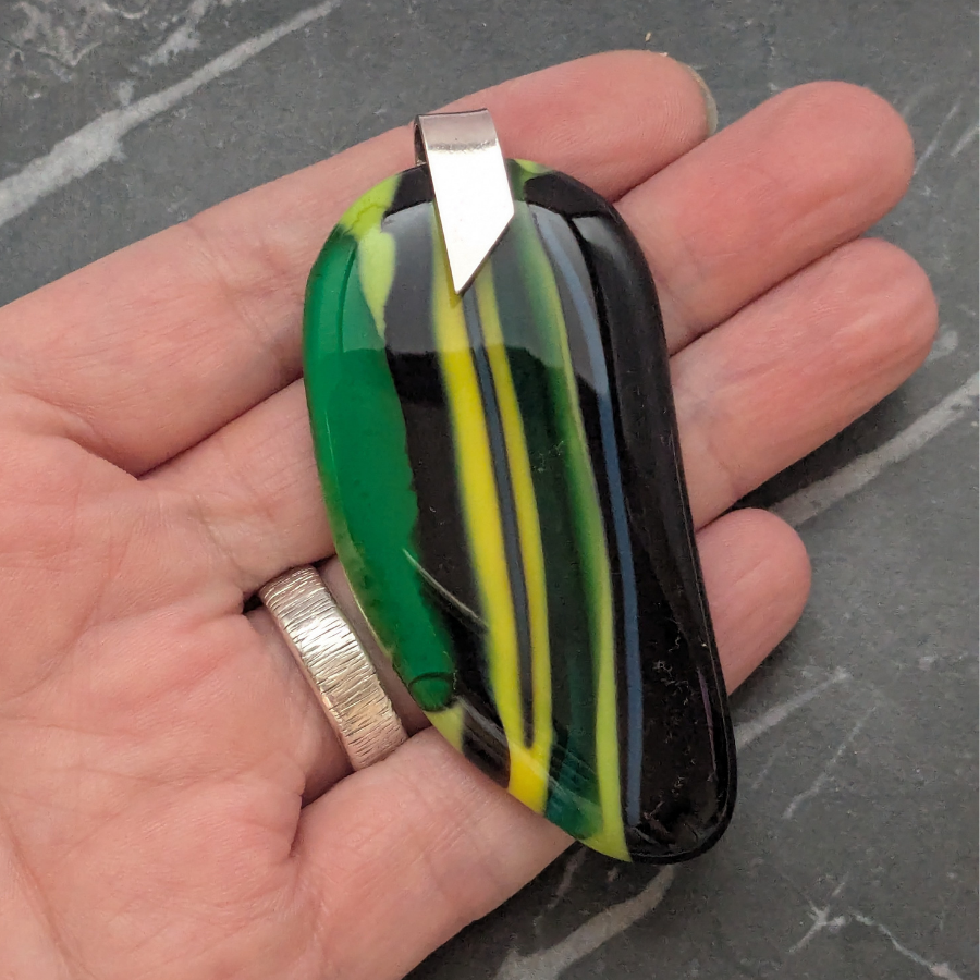 Large handmade glass pendant with a striped design. The pendant is a combination of green, yellow, blue and black glass and has a polished finish. It has a sterling silver bail, stamped 925.