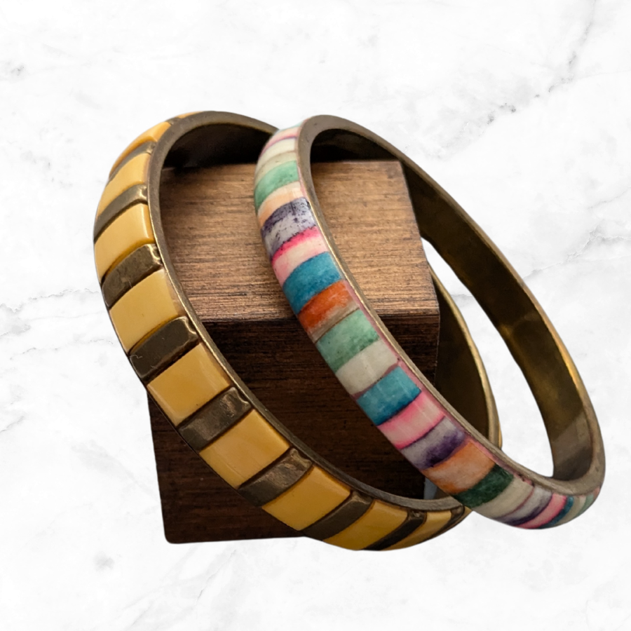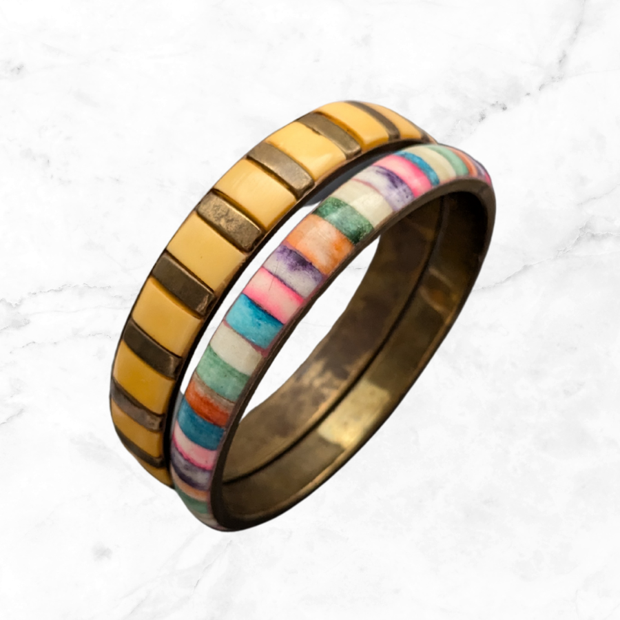 Great pair of vintage stacking bangles. These are both made from brass and have inlayed panels. Ideal for everyday wear and festivals.