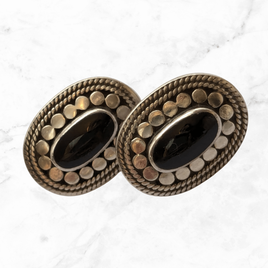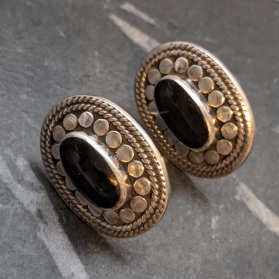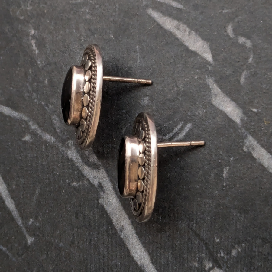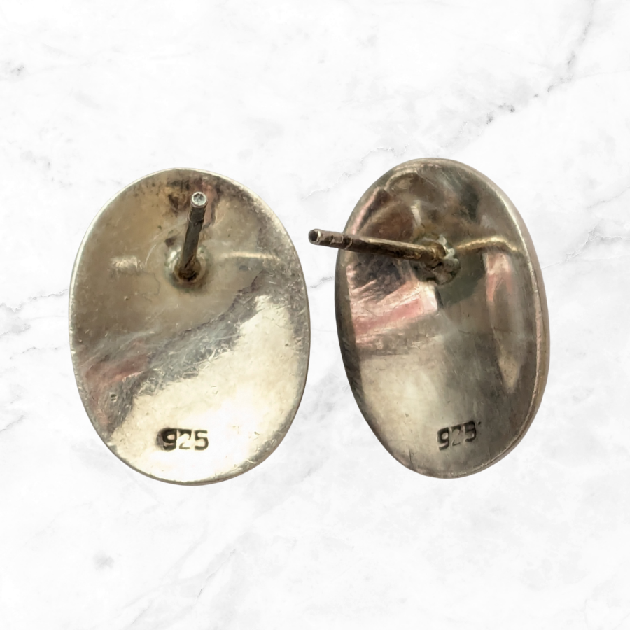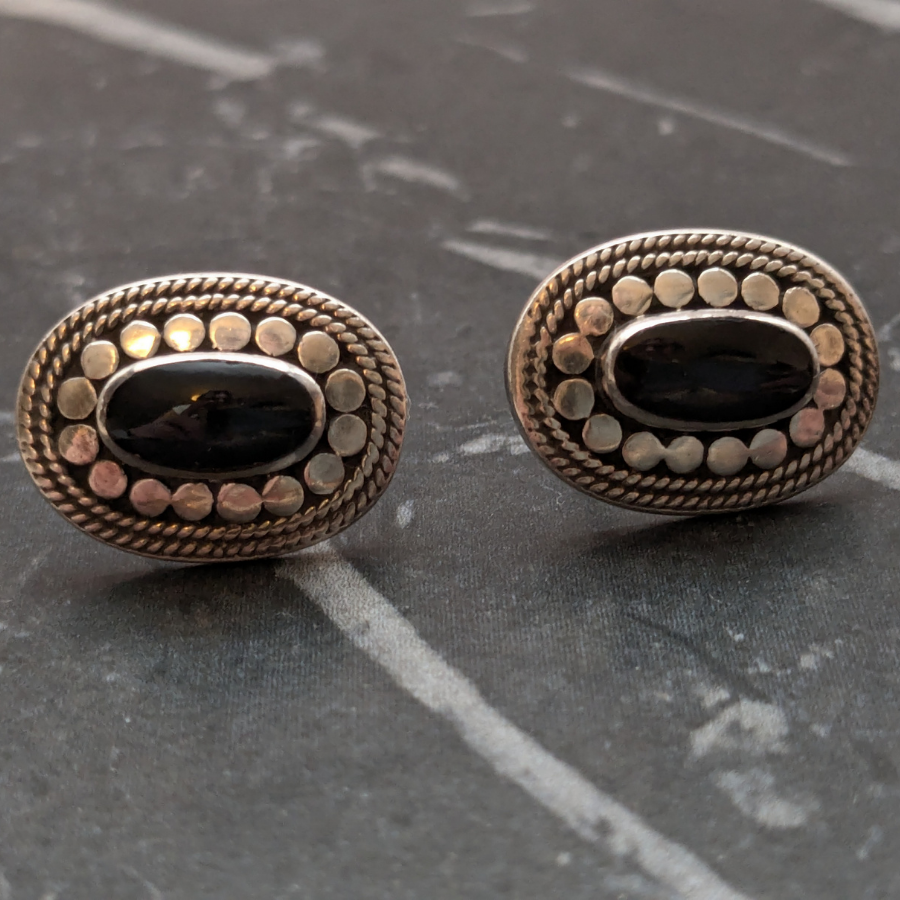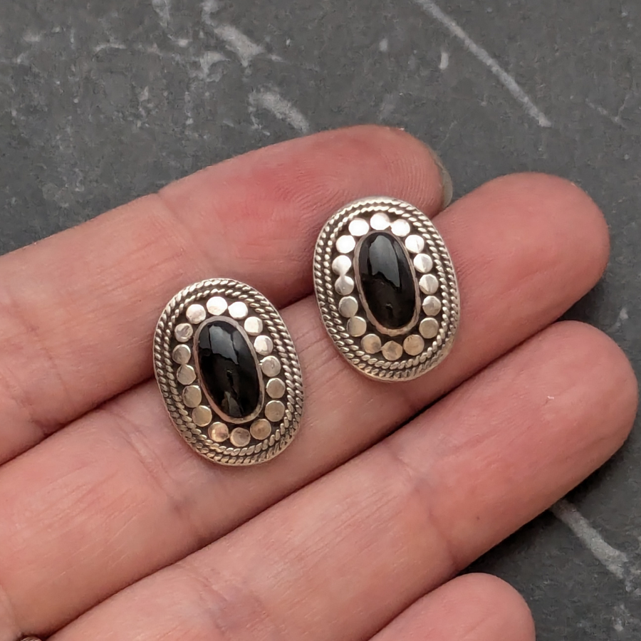Solid sterling silver stud earrings in an oval shape. These are stamped 925 for silver on the back and have a piece of black onyx gemstone in the centre. These have a good weight to them and are in great condition.
