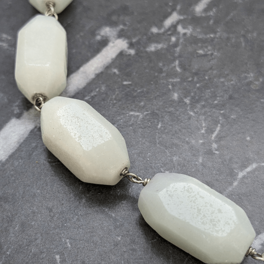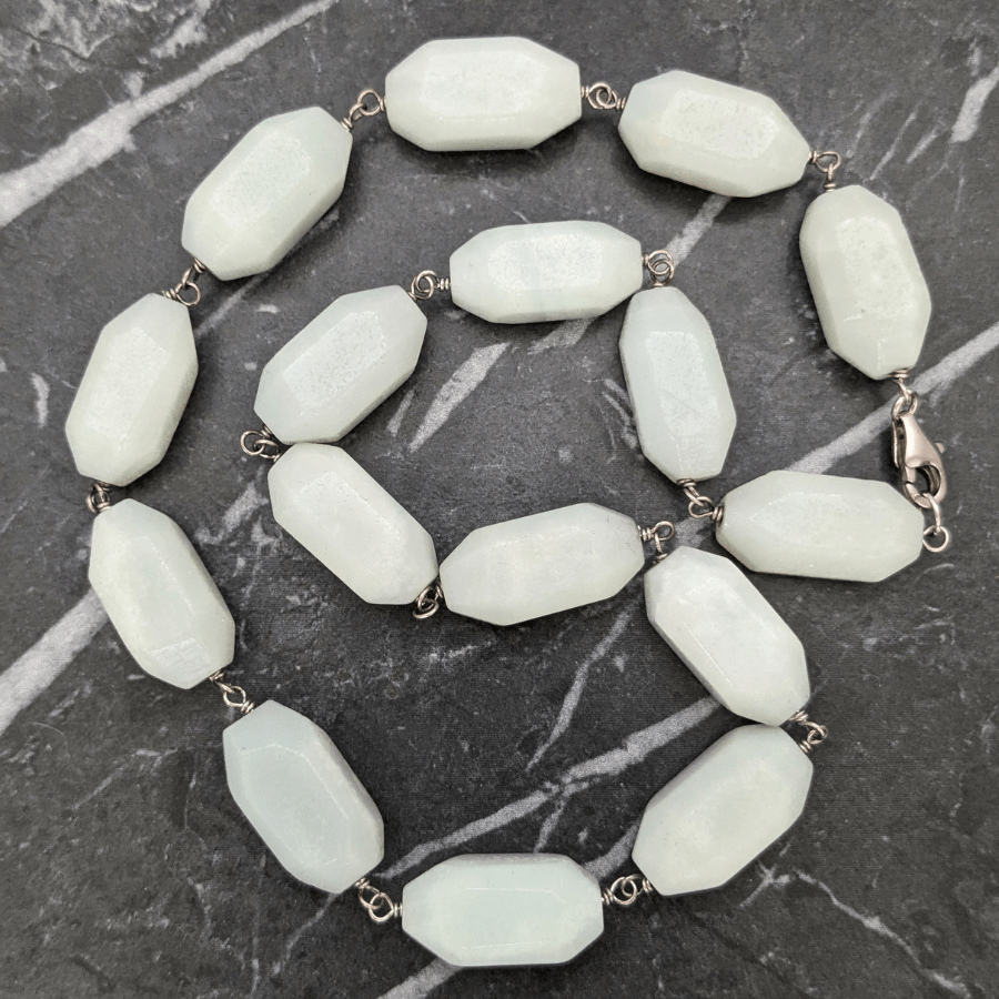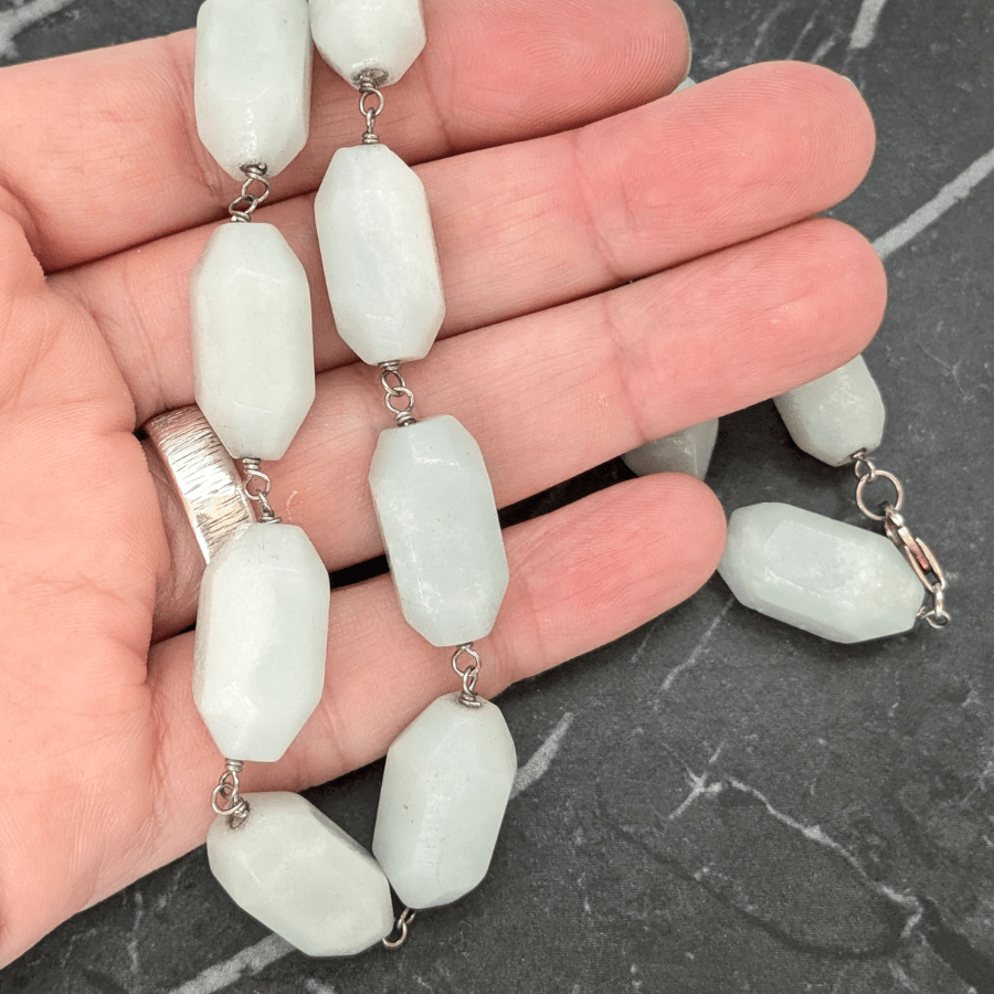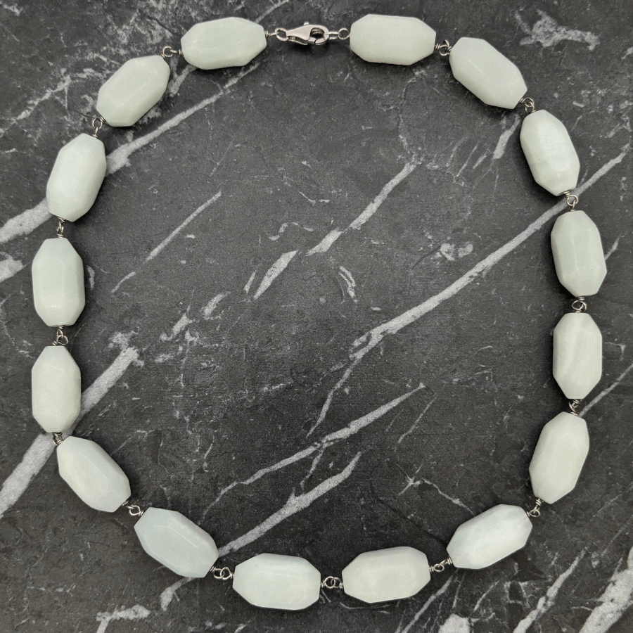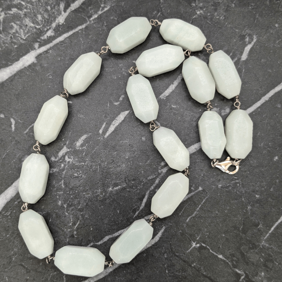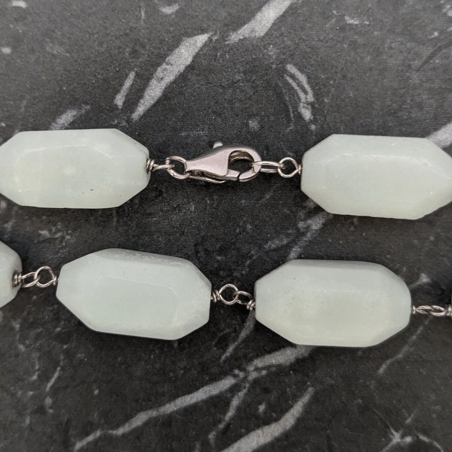 This is a stunning gemstone necklace – which I believe is aquamarine. The stones are an unusual shape and pale blue/green in colour.