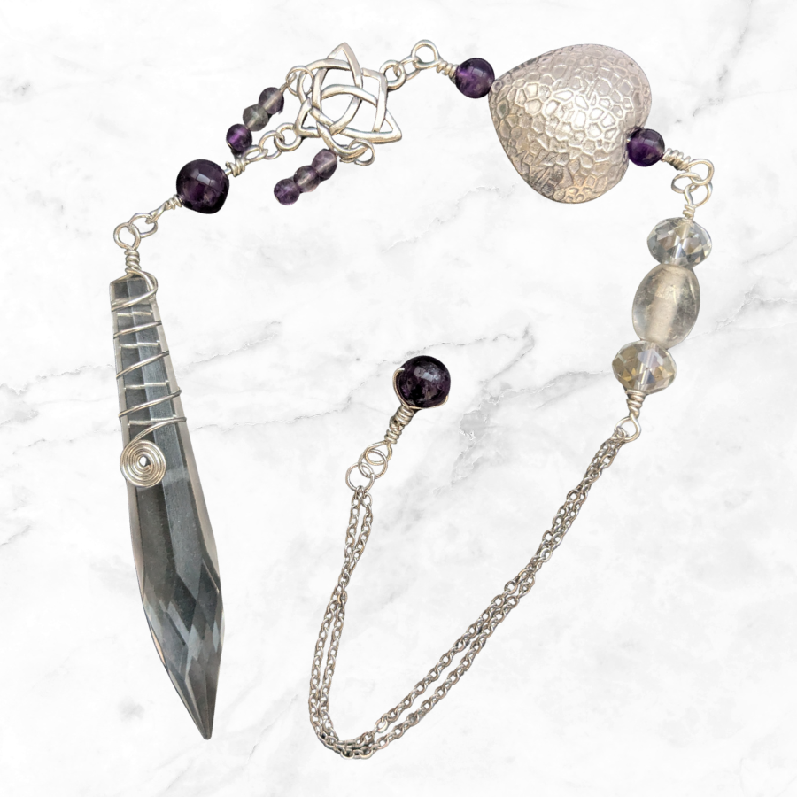 Handmade pendulum, created using a variety of rescued and upcycled elements. This particular pendulum features: