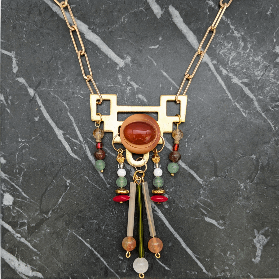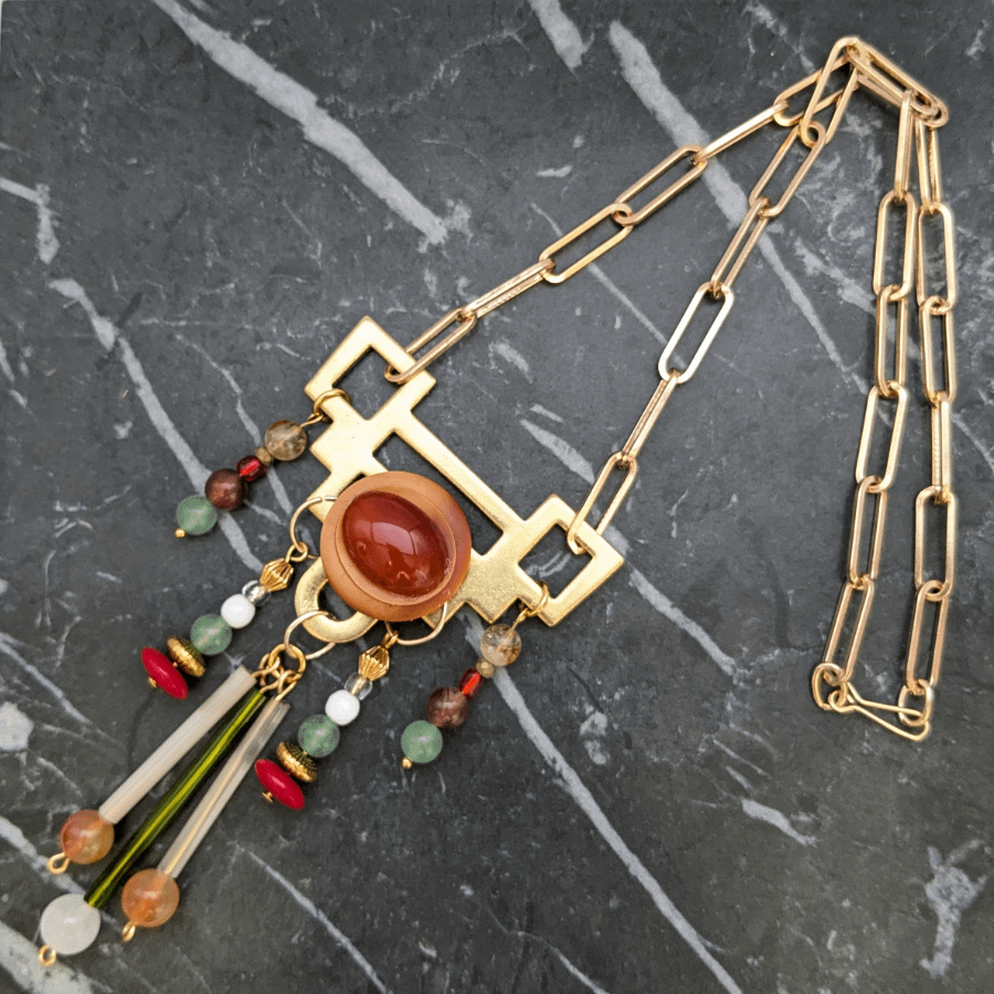 Featuring a unique blend of vintage and modern materials all rescued from broken jewellery. This particular necklace contains Art Deco glass beads, carnelian, aventurine and quartz beads, brass picture frame fixing and modern paperclip chain. It also has a vintage button with a stunning carnelian cabochon in the centre.