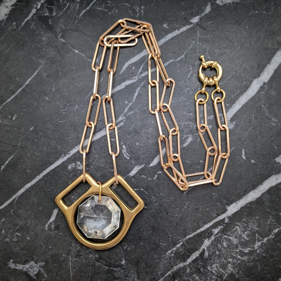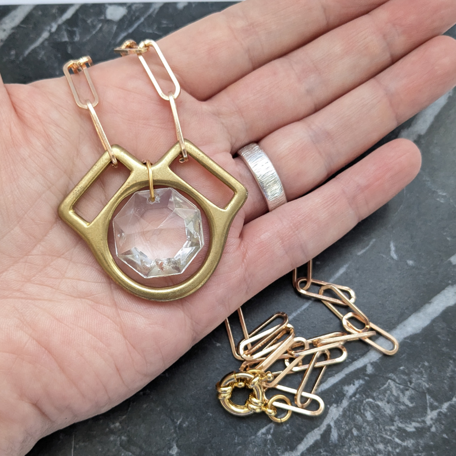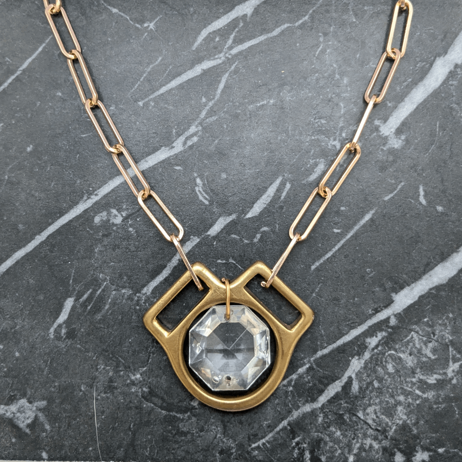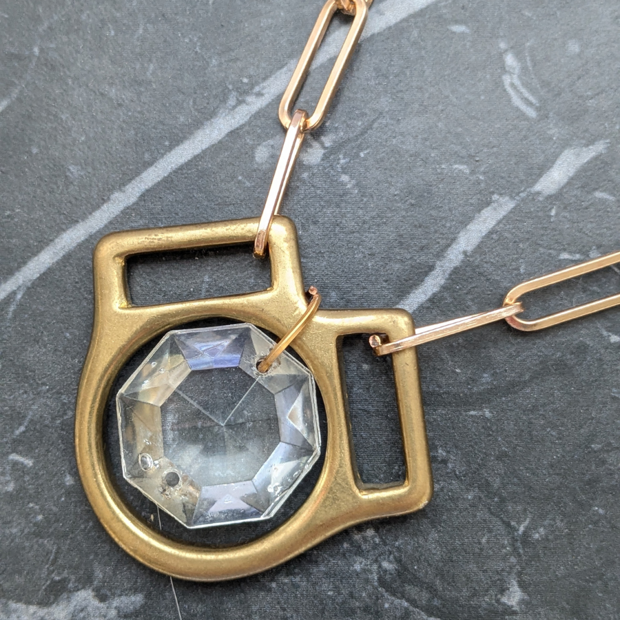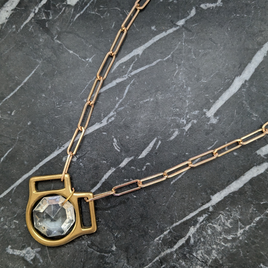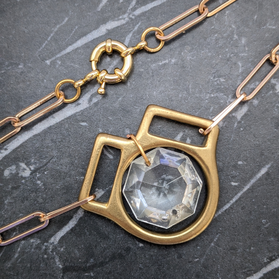Beautiful handmade necklace featuring upcycled elements and a modern paperclip chain. The clear glass drop was rescued from a vintage chandelier and fits perfectly as a pendant.
