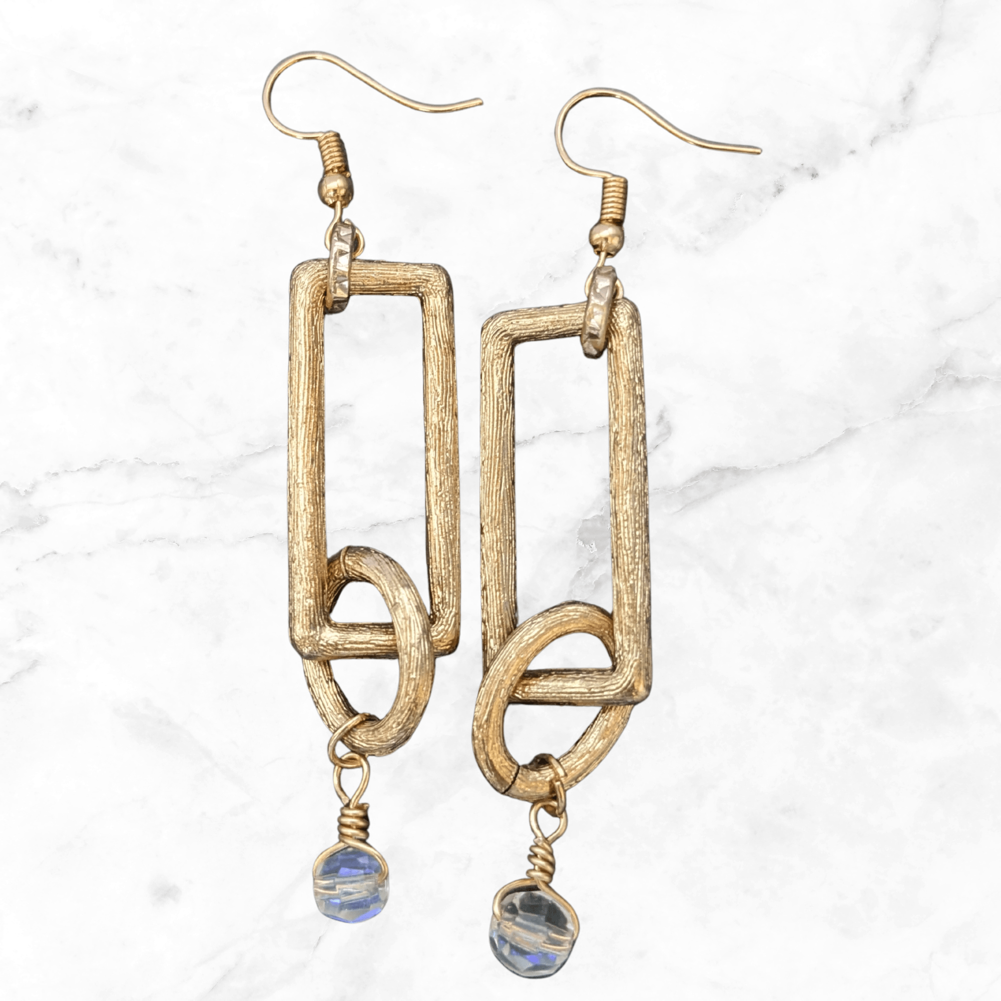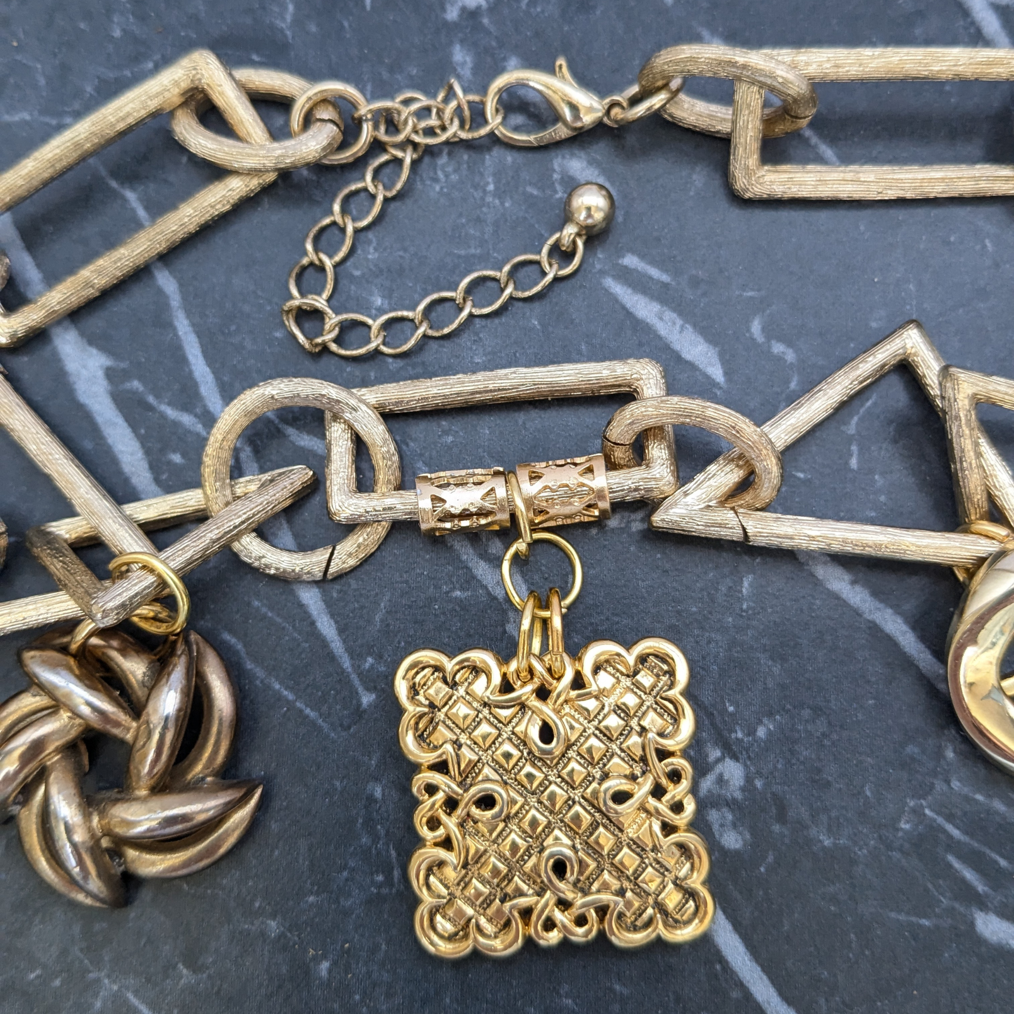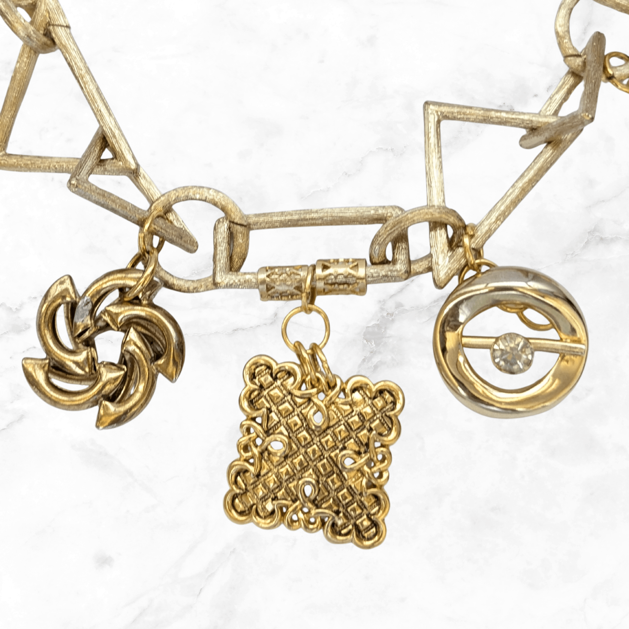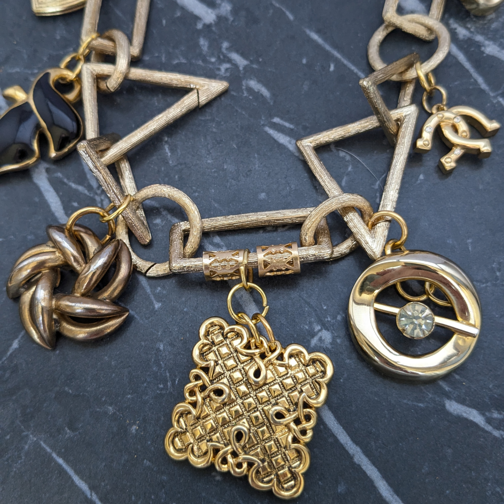 This particular necklace has an array of gold tone charms, once single earrings bound for the bin! The various shades of gold really bring the piece together. Guaranteed to turn heads!