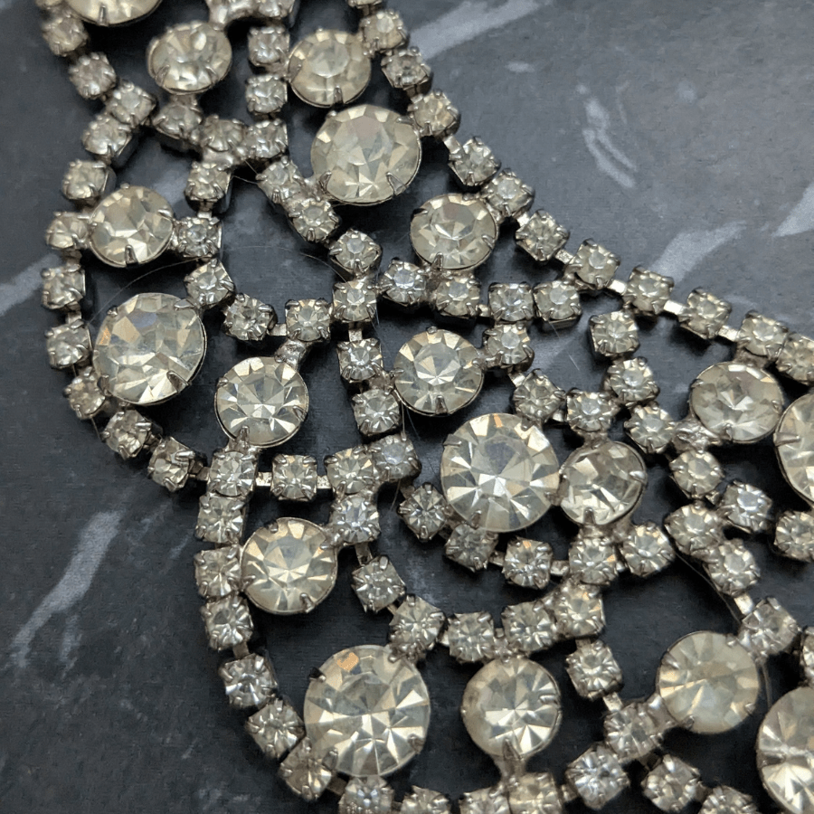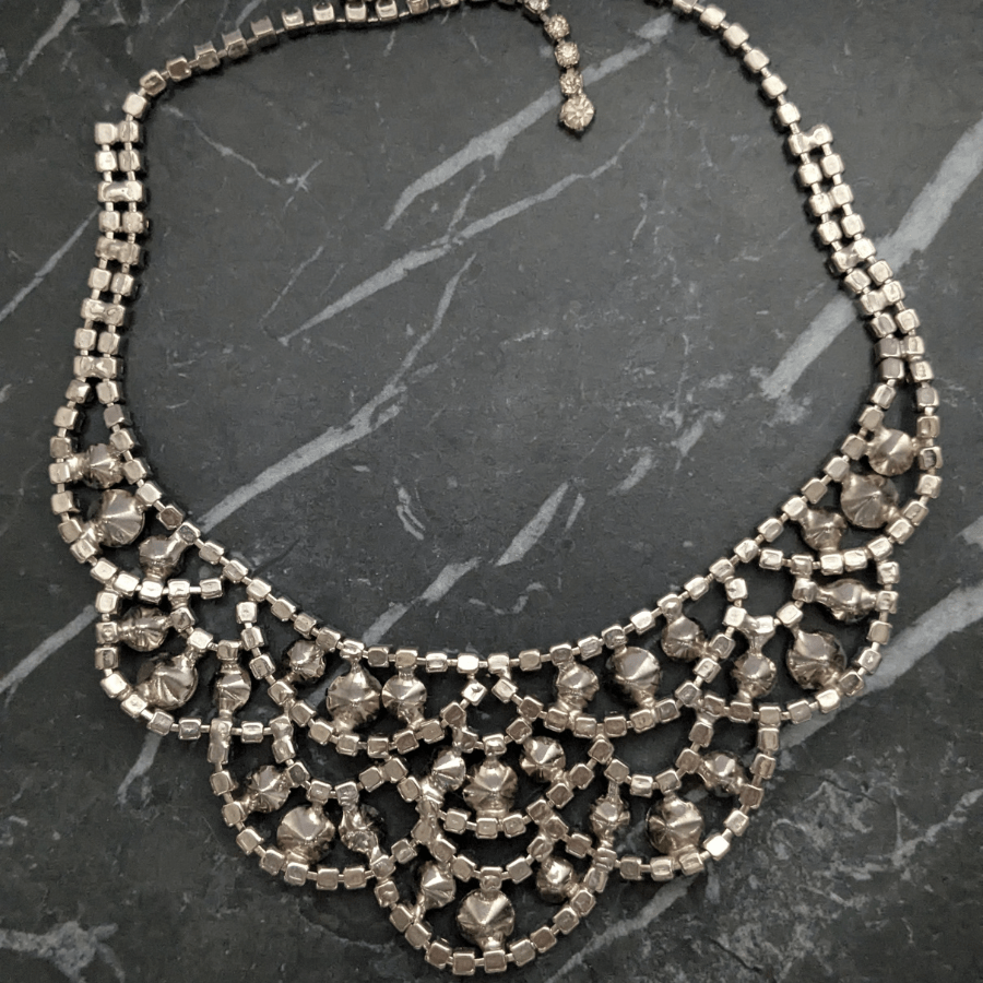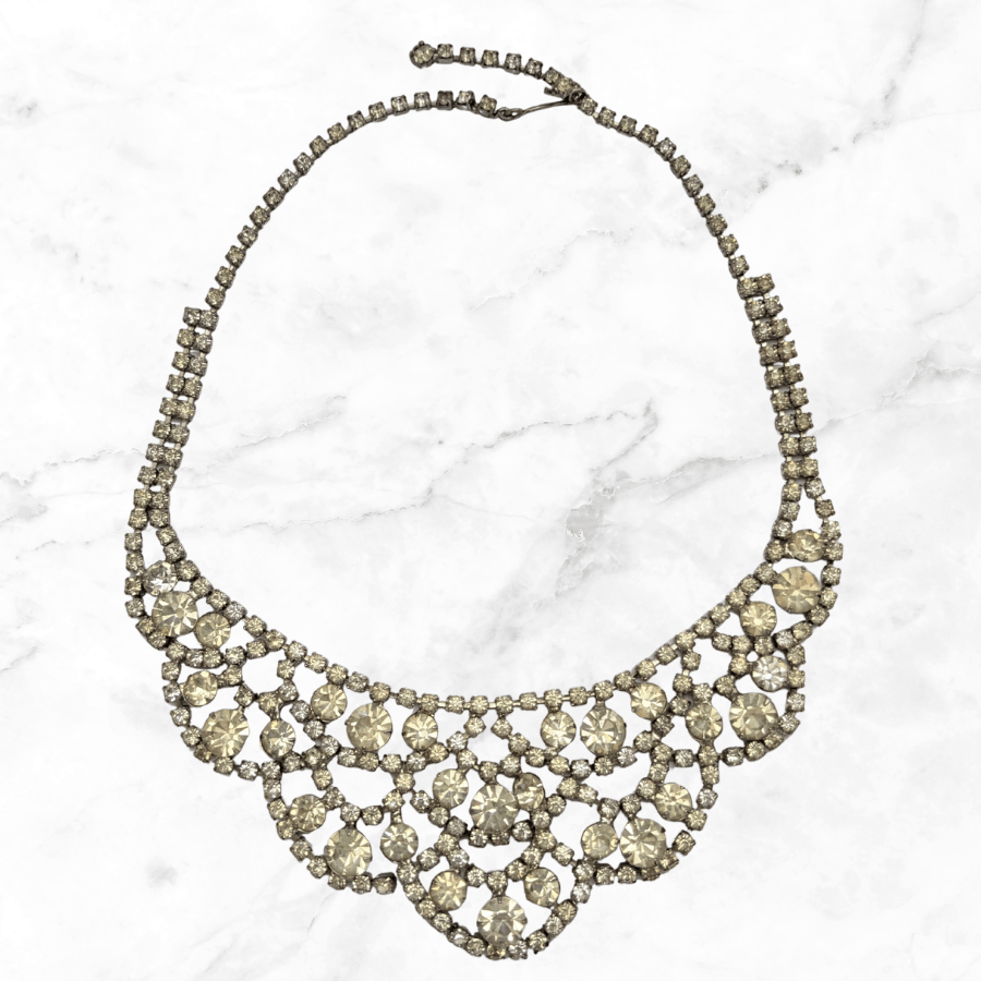 Vintage rhinestone necklace from the 1950s. Set with sparkling clear glass rhinestones, in a bib design. Fastens with hook and is articulated.