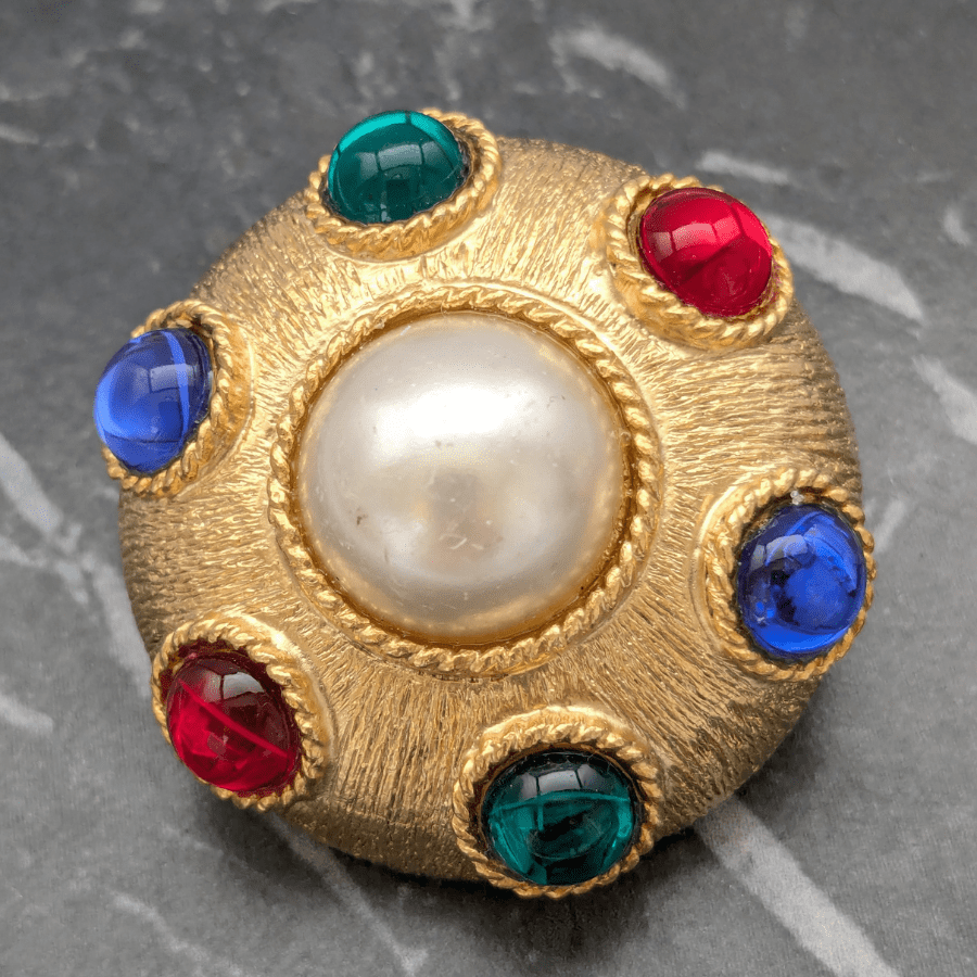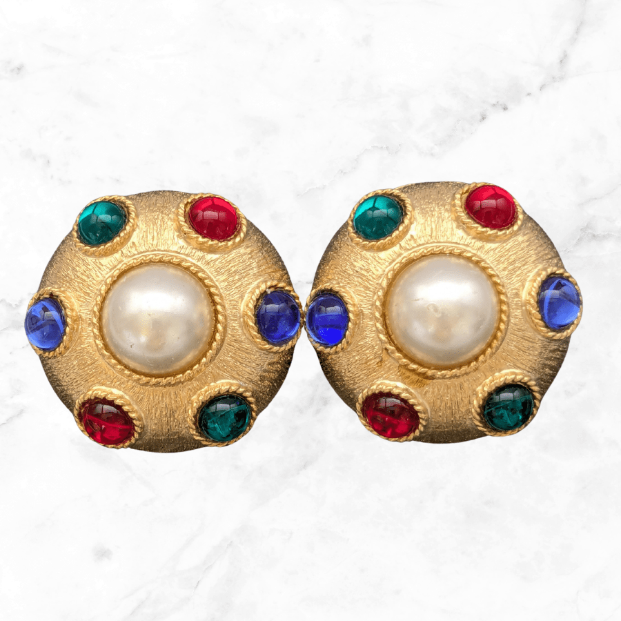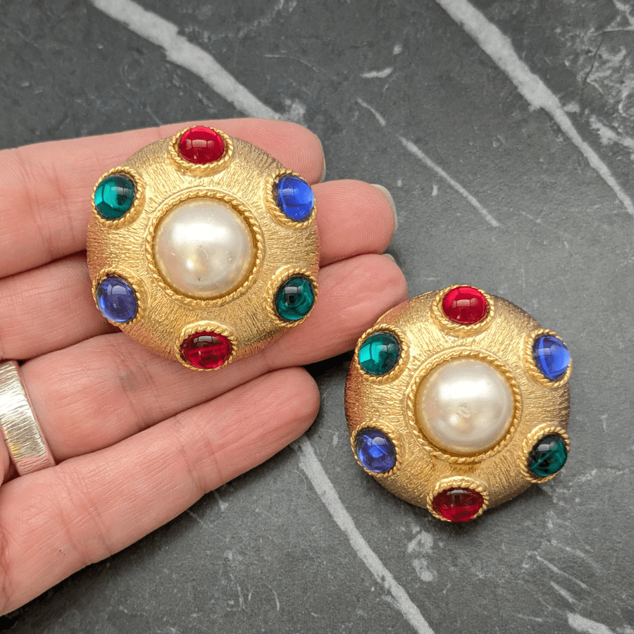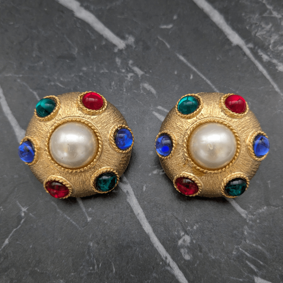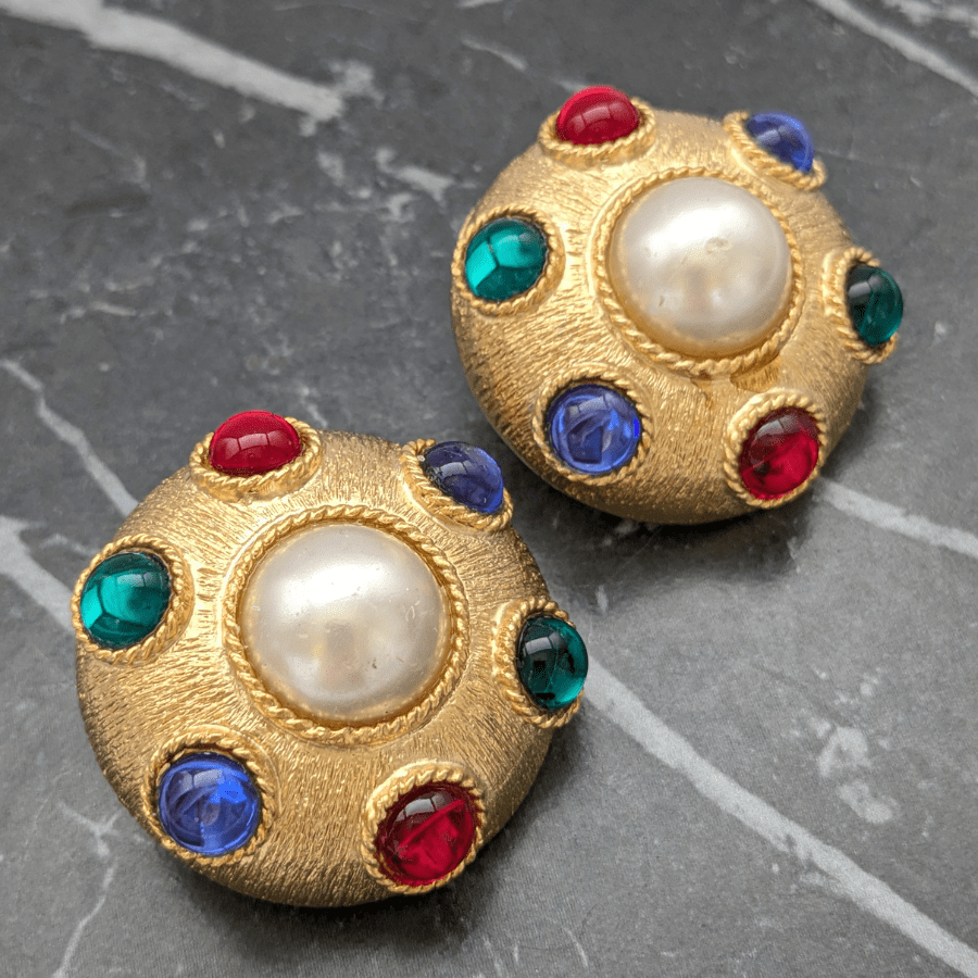 These are fantastic statement earrings from the 1980s. Very big and bold in design, made from a gold tone metal and set with colourful cabochons. Finished with a faux pearl cabochon in the centre.