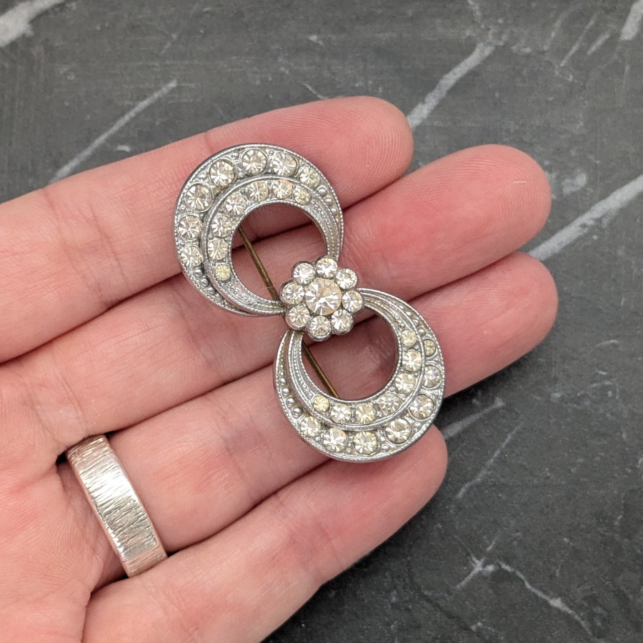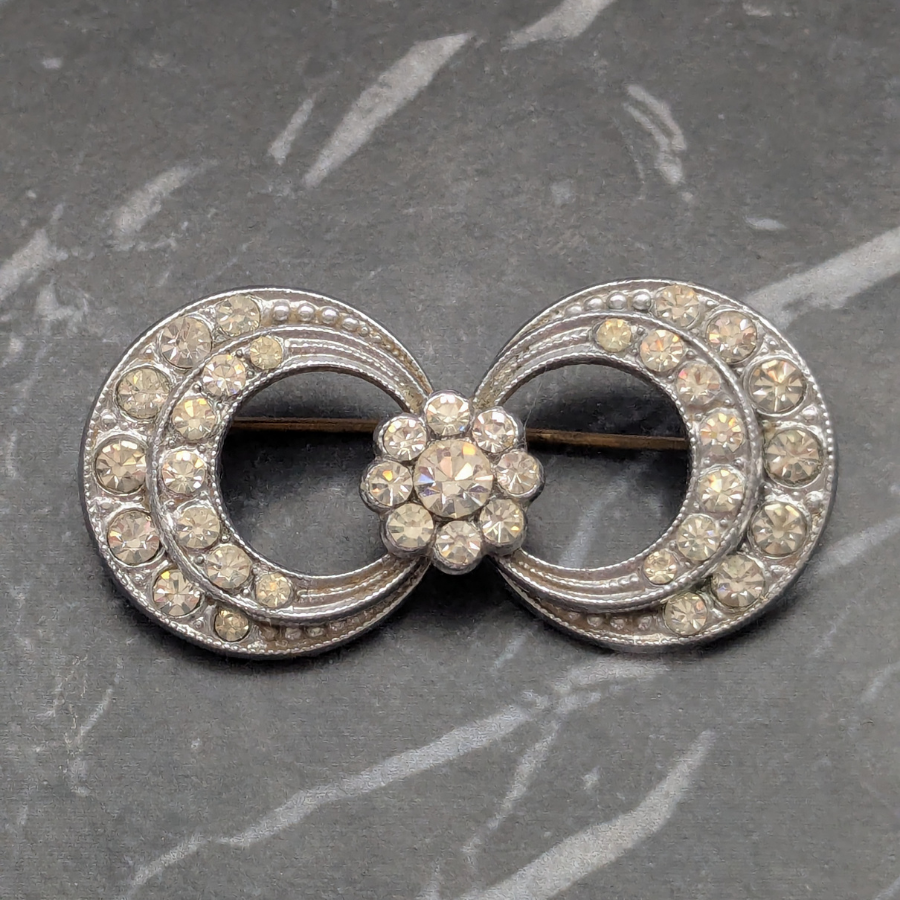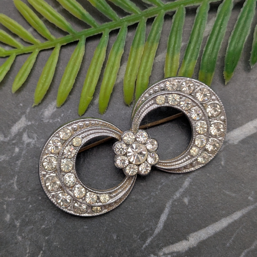 Vintage Art Deco 1930s brooch set with clear sparkling rhinestones. The design features layered circles connected by a rhinestone flower in the centre. Fastens with a ‘C’ clasp and pin.