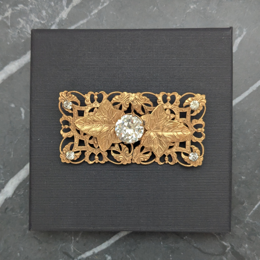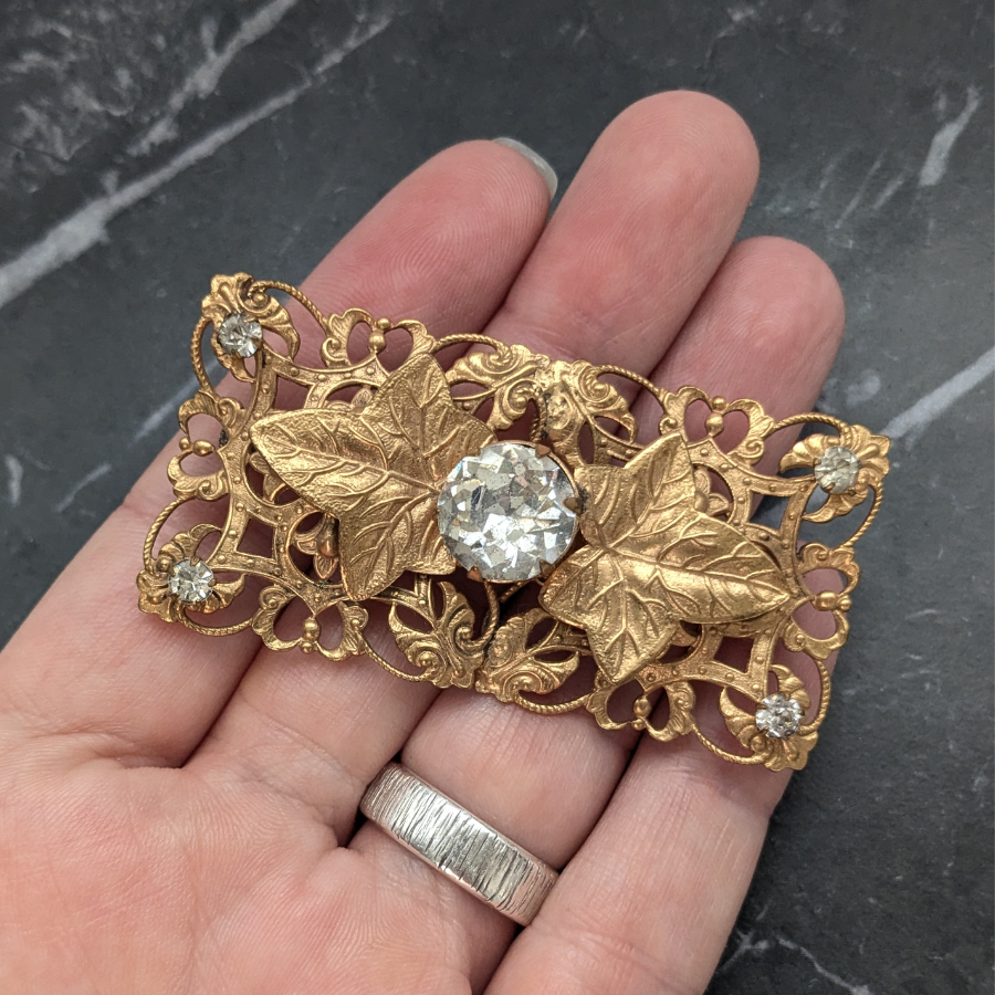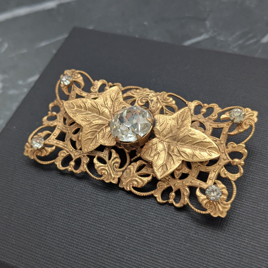 Stunning Art Deco brooch. Made from light gold tone metal and featuring clear glass rhinestones. The brooch is layered and has two ivy leaves on the top with a large clear glass stone in the centre. It is rectangular in shape.