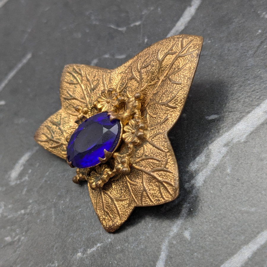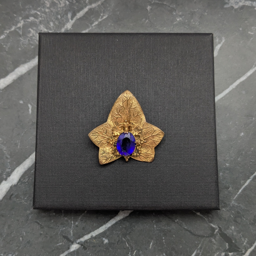 Art Deco 1930s ivy leaf brooch. Made from a gold tone metal and finished with a cobalt blue glass cabochon in the centre. Fastens with a ‘C’ clasp and pin.