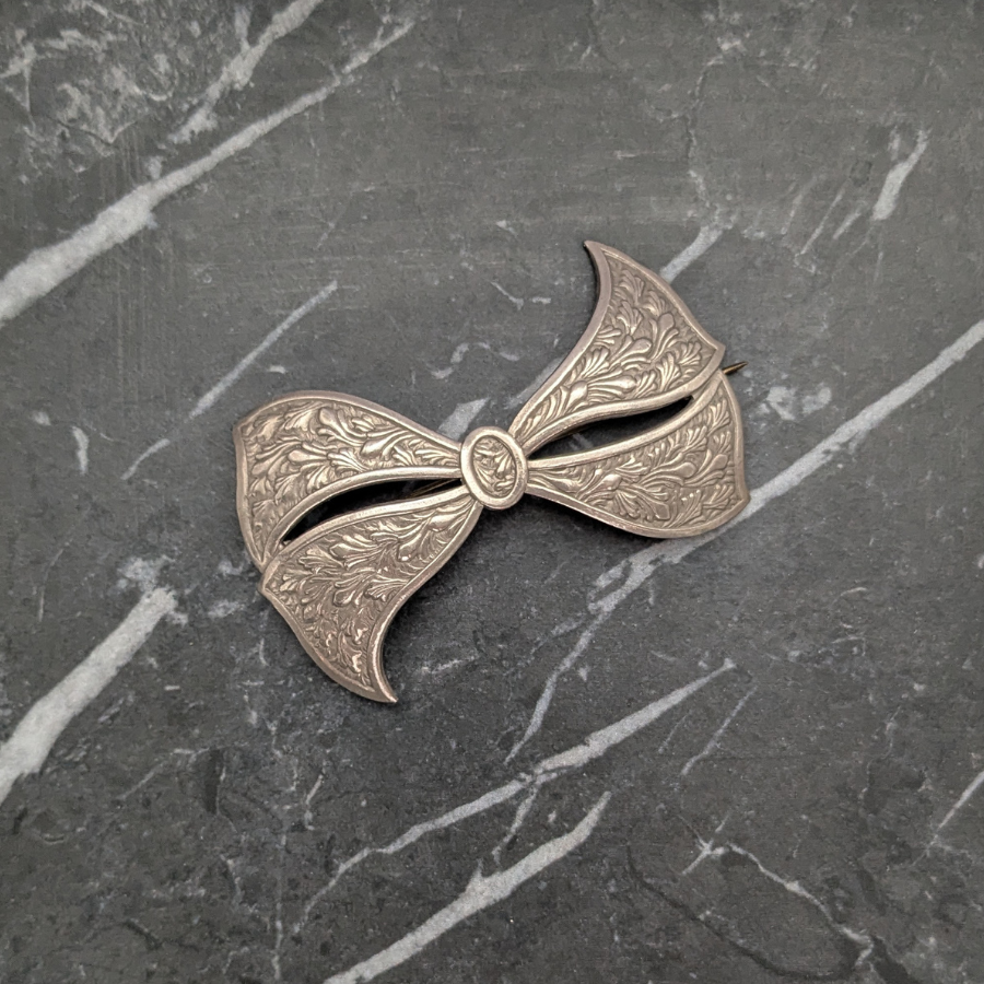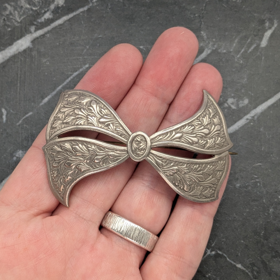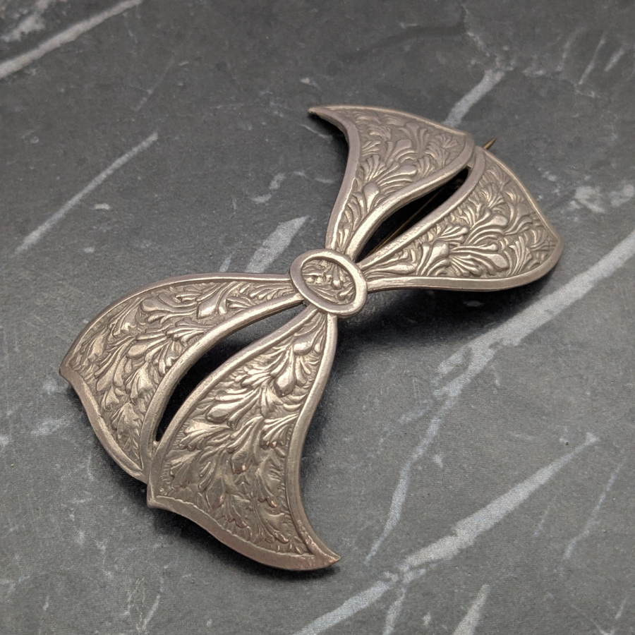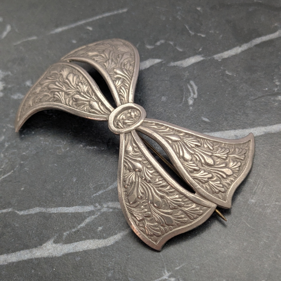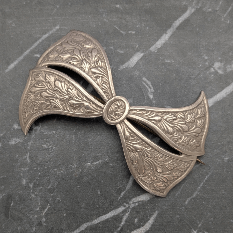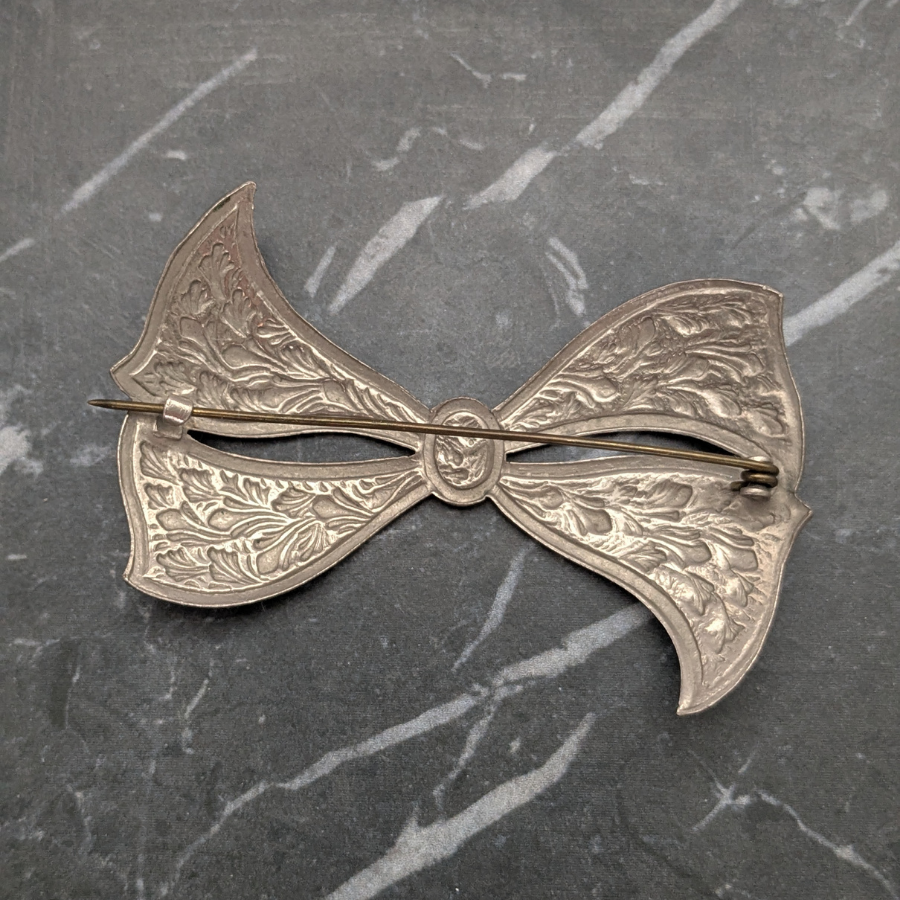 Stunning silver tone Art Deco bow brooch. The metal has a pressed design on it and fastens with a ‘C’ clasp and pin.