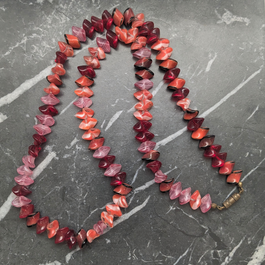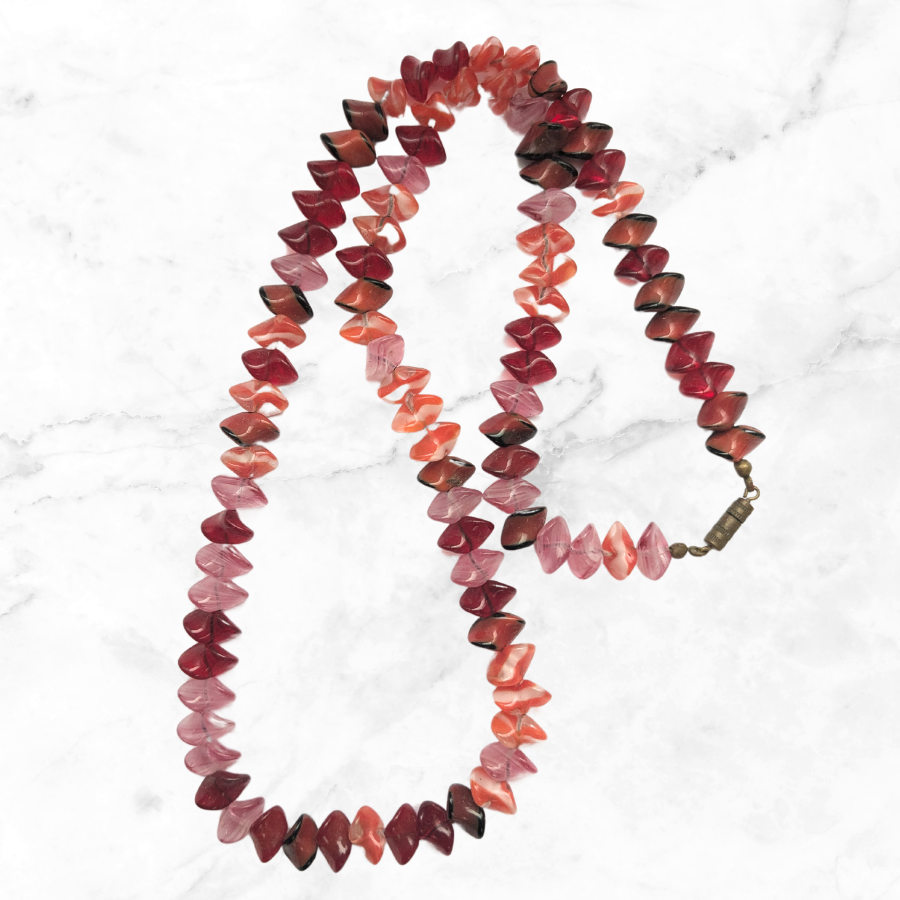 Vintage Art Deco Pink and Red Glass Beaded Necklace. The beads have a twist effect to them and are very vibrant in colour – pinks, reds and oranges. Each bead really is unique.