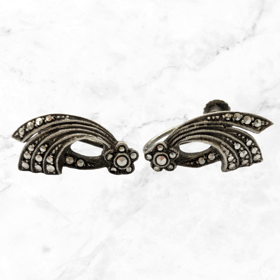 Stunning vintage Art Deco earrings. These are made from sterling silver and set with tiny sparkling marcasite stones. All stones are present and these earrings have screw back fastenings.