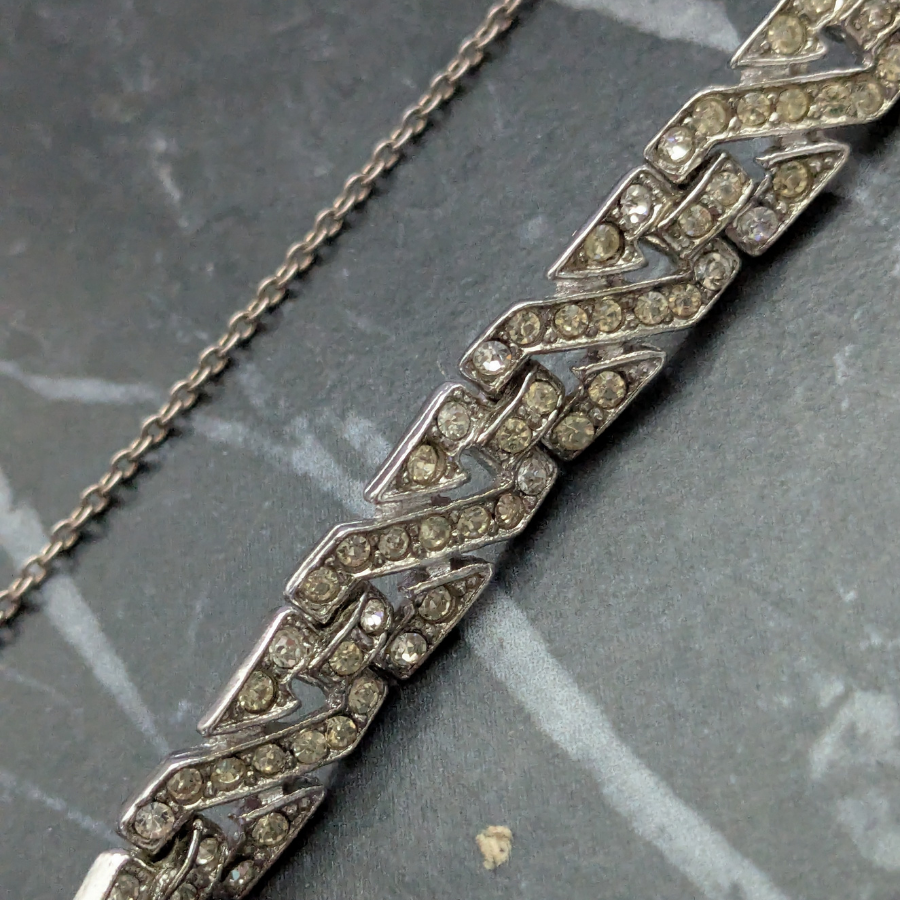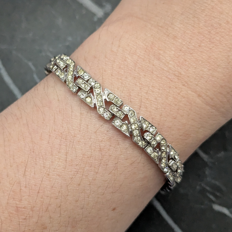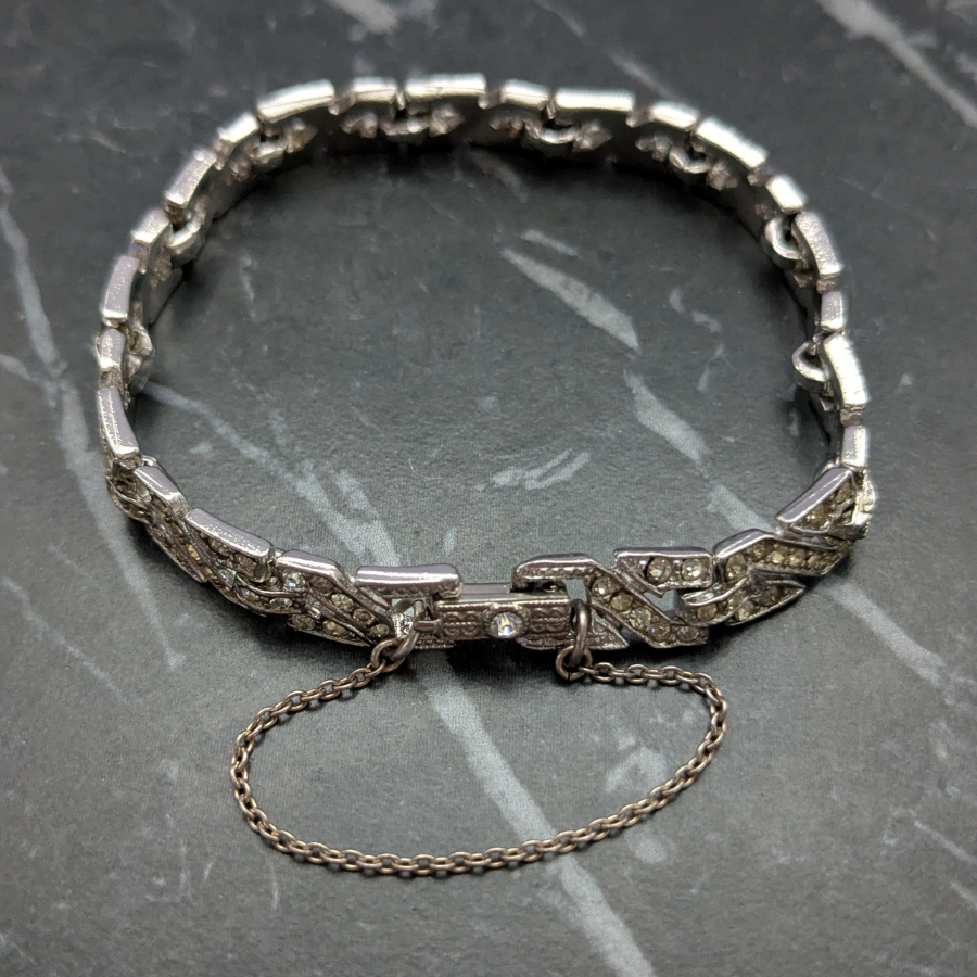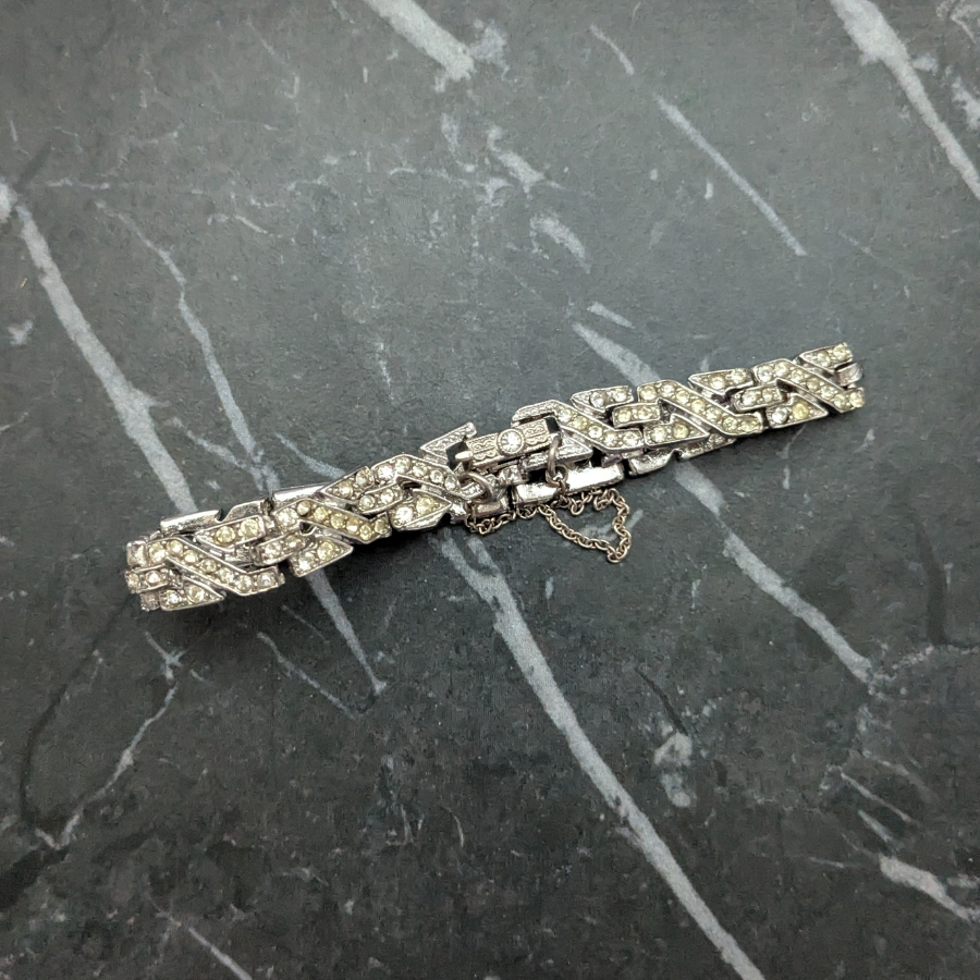 Vintage bracelet in the Art Deco style. Made from a silver tone metal and set with small clear rhinestones. Still lots of sparkle to this bracelet. It has a box clasp and safety chain.