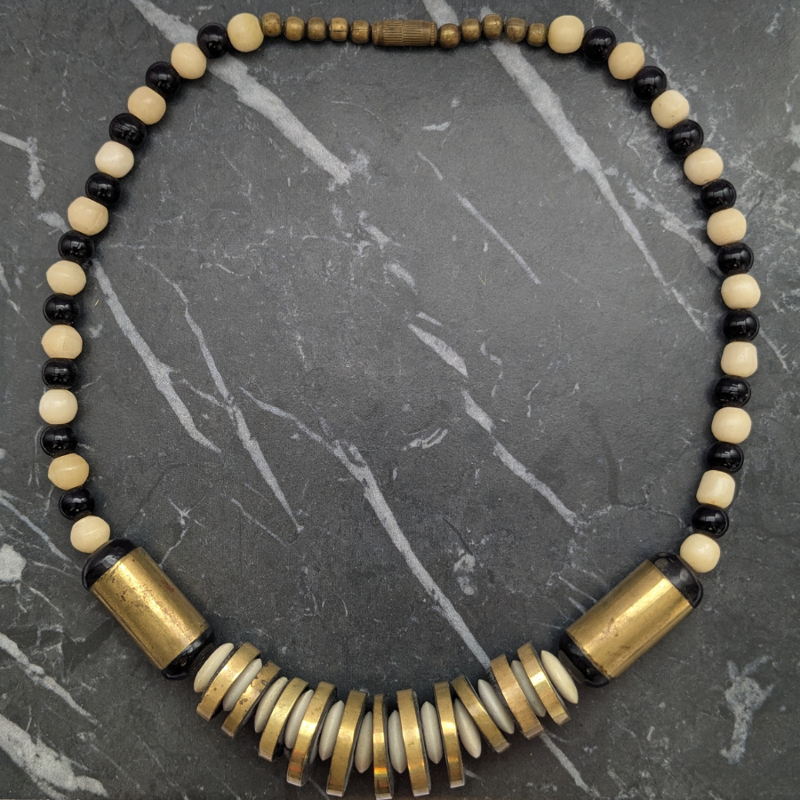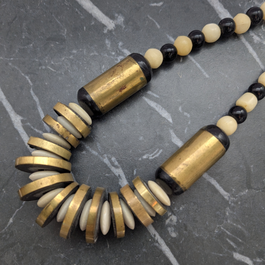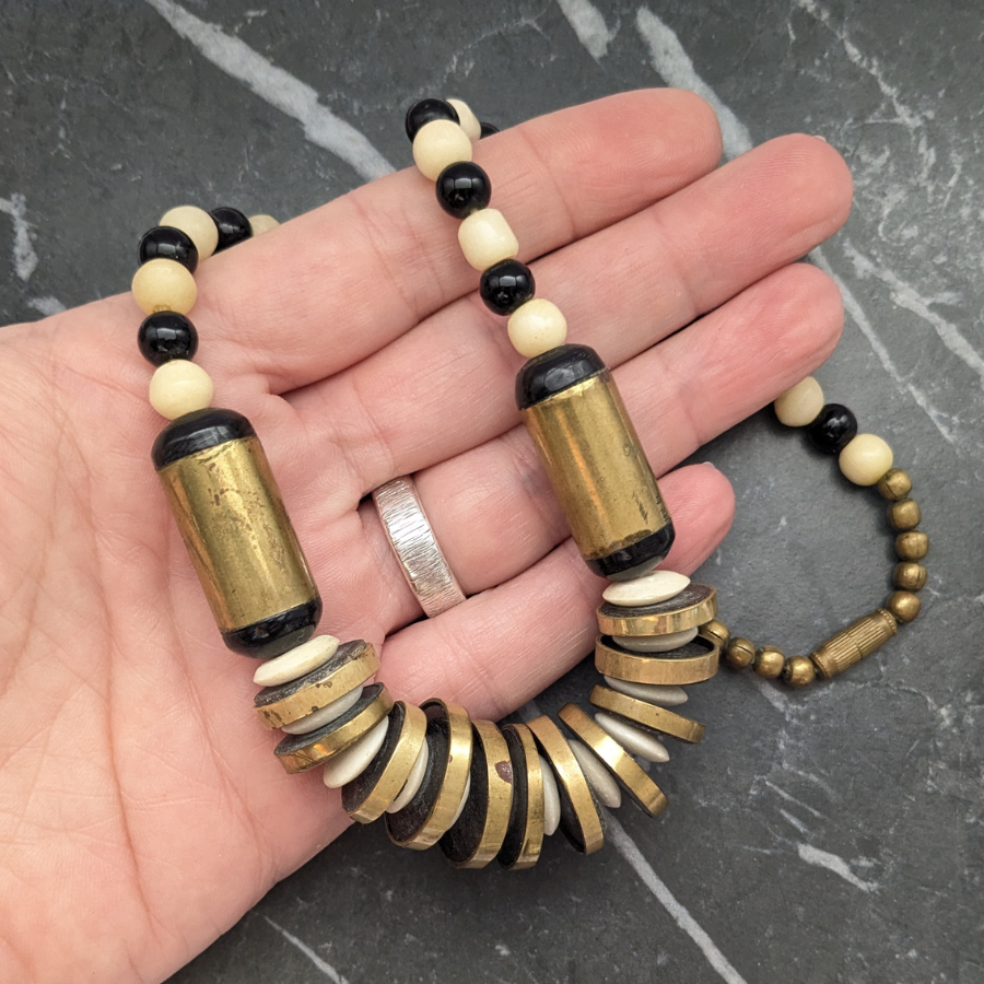 Vintage necklace featuring black and off white beads. It also has some brass beads and detail, including a brass barrel clasp.