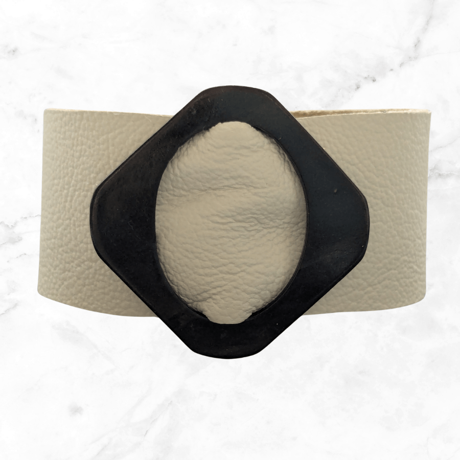 Colour: Cream leather and a black/brown plastic buckle.