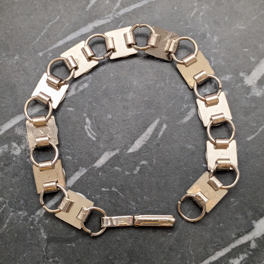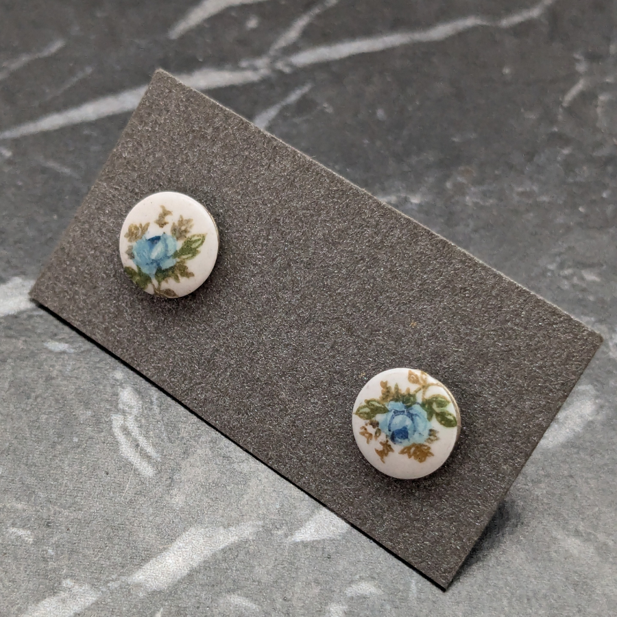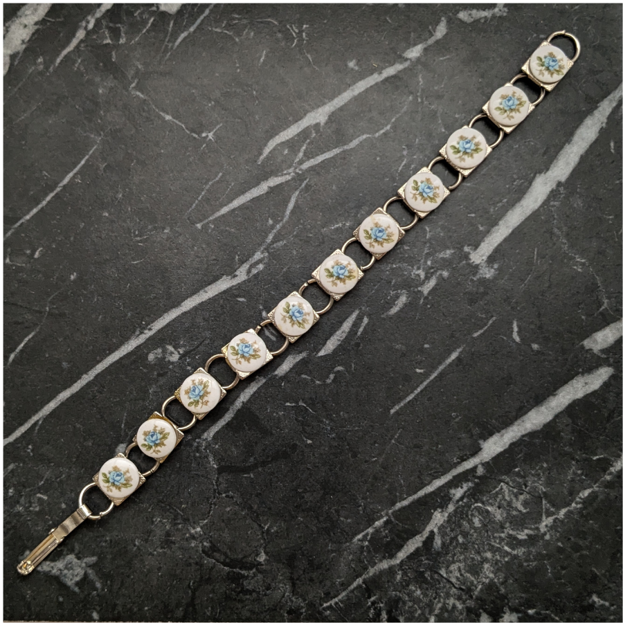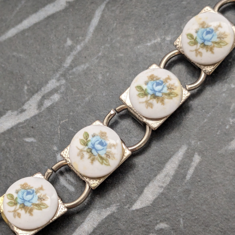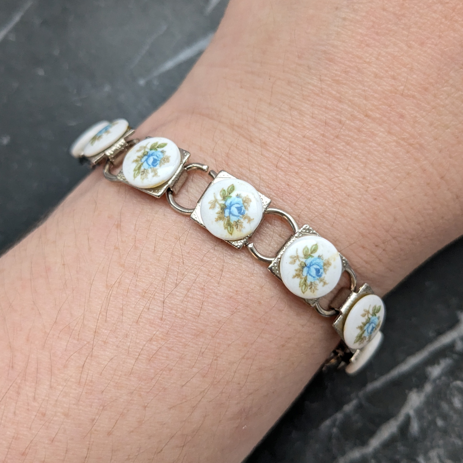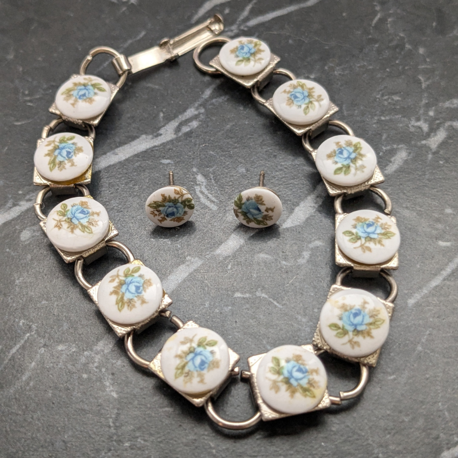 Lovely vintage jewellery set consisting of a panel bracelet and matching stud earrings. The bracelet and earrings feature small white glass cabochons with blue rose transfers on.