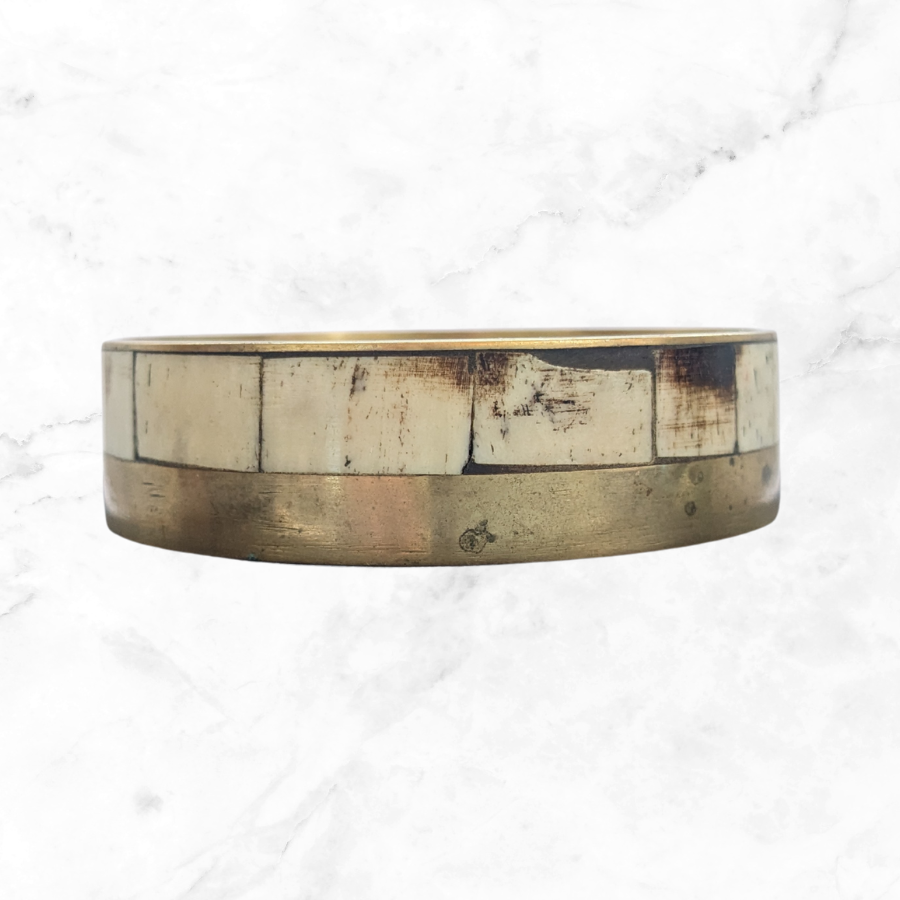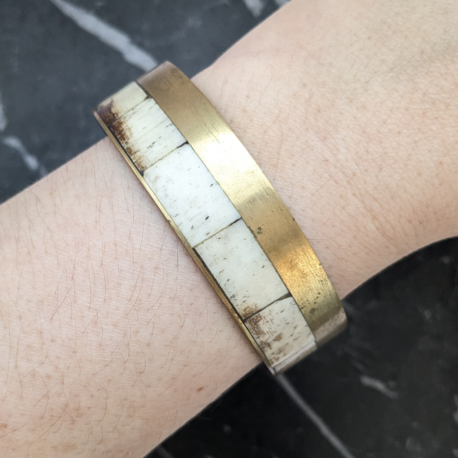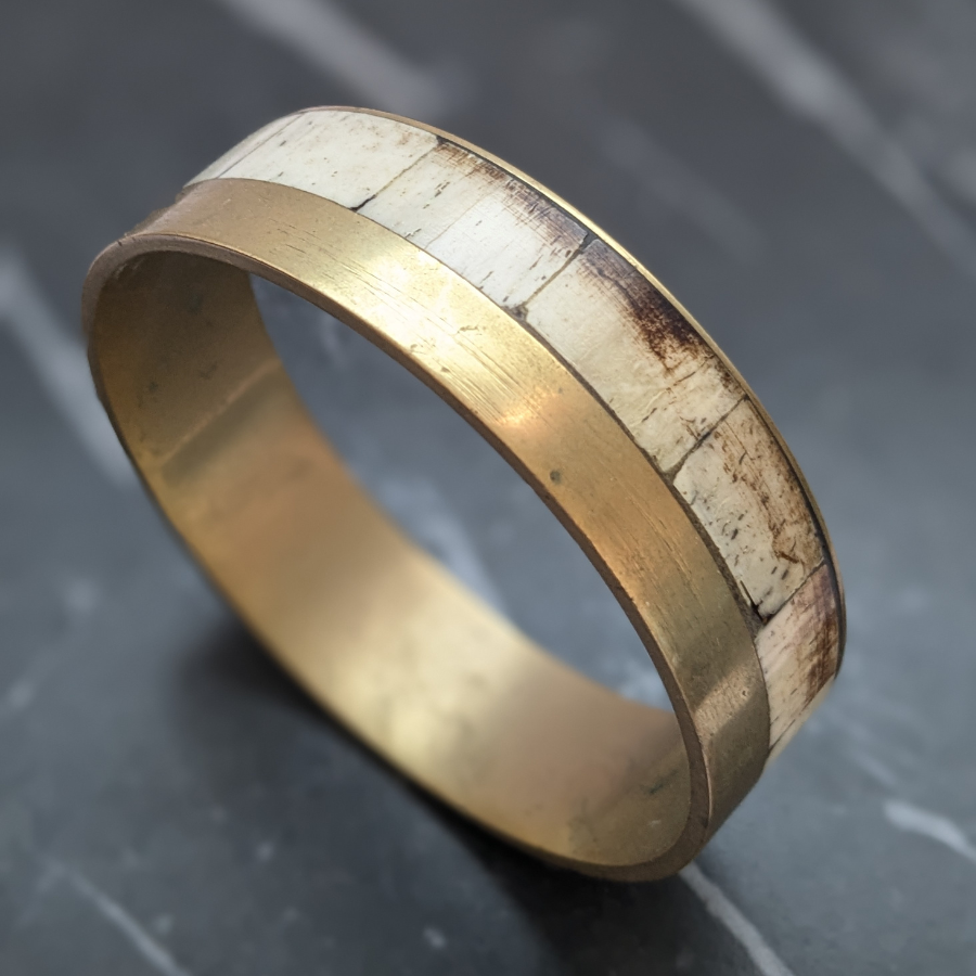 This is a chunky brass stacking bangle which would look great worn alone or stacked with other bangles. The brass has a lovely pale gold tone and is set with panels of bovine bone.