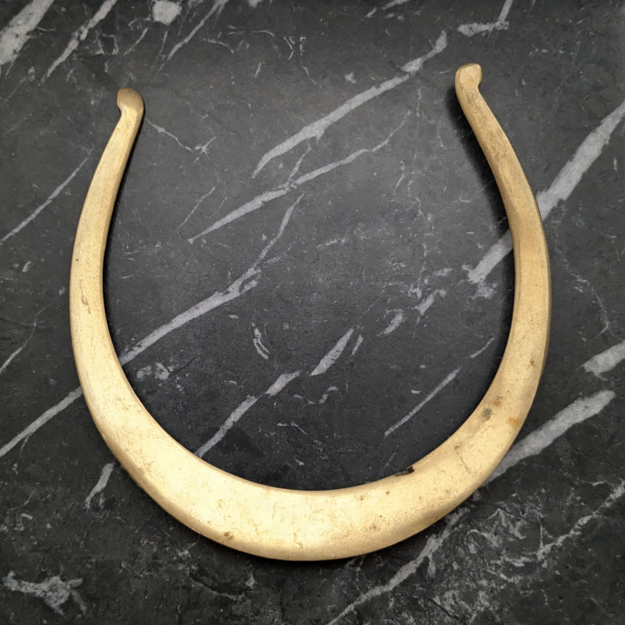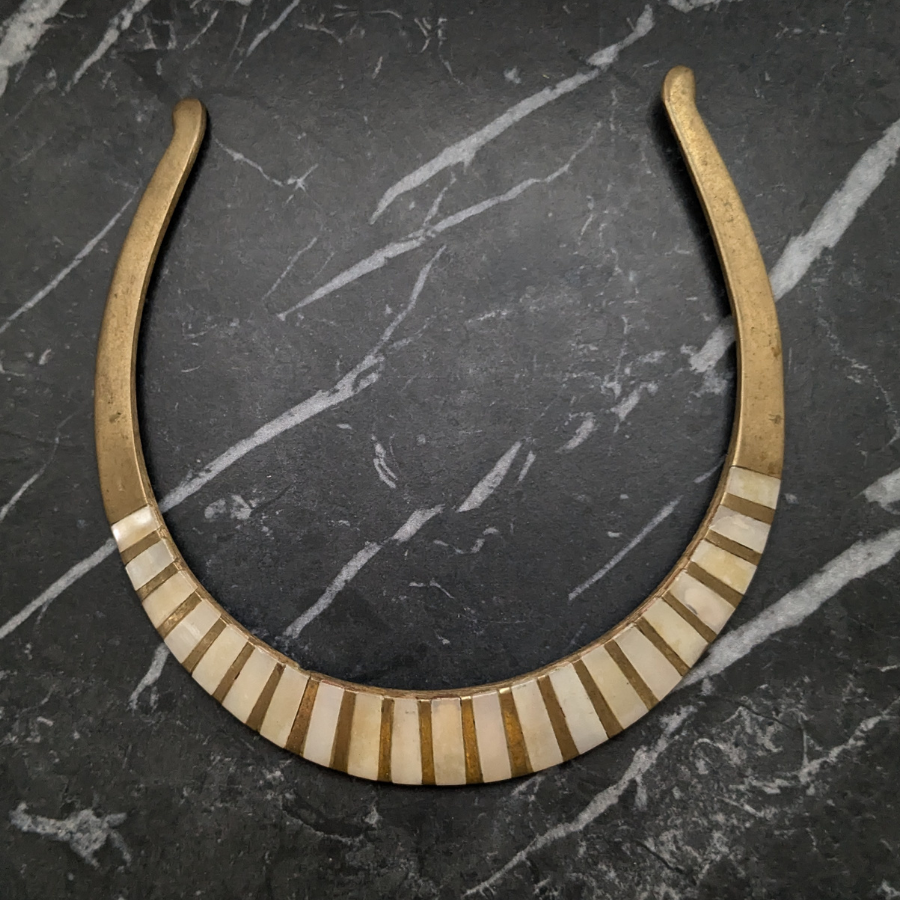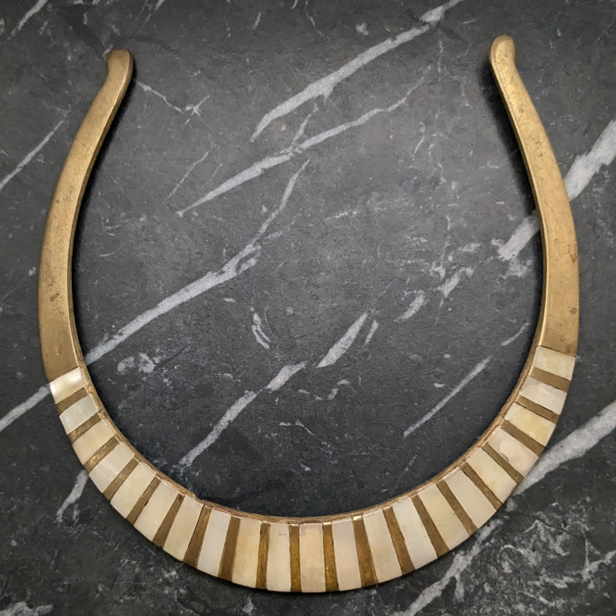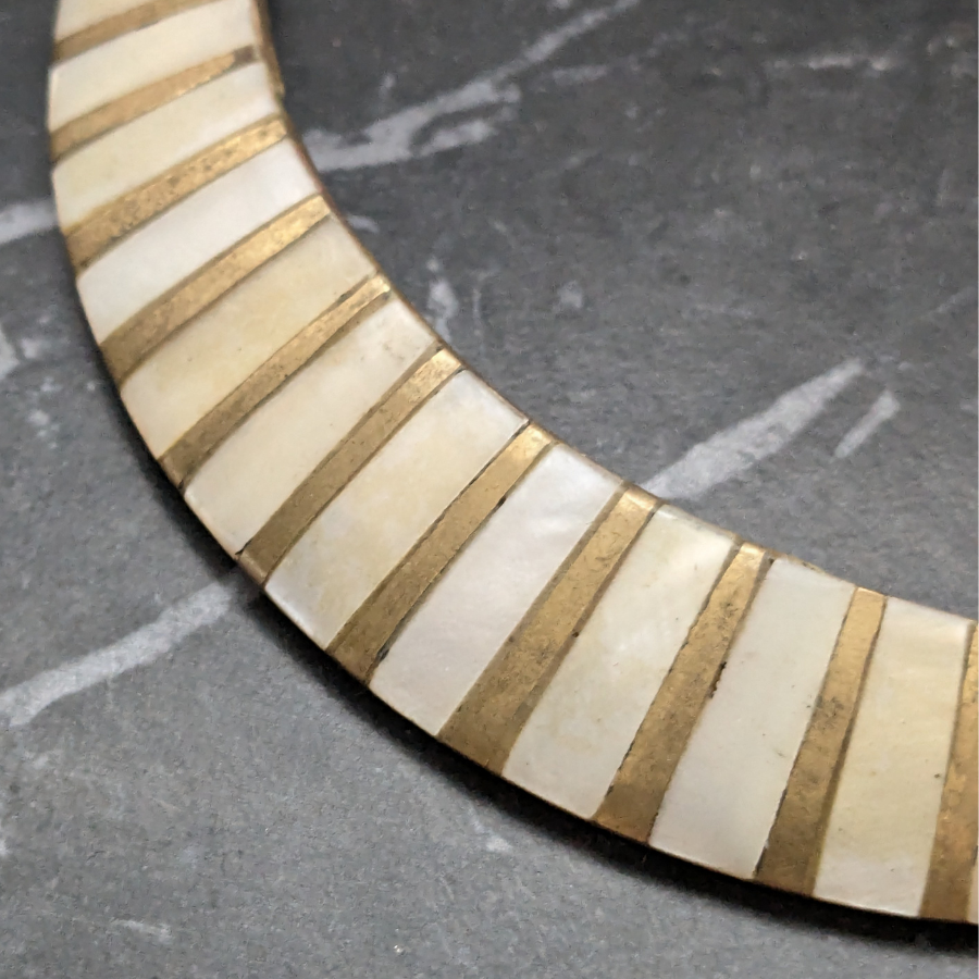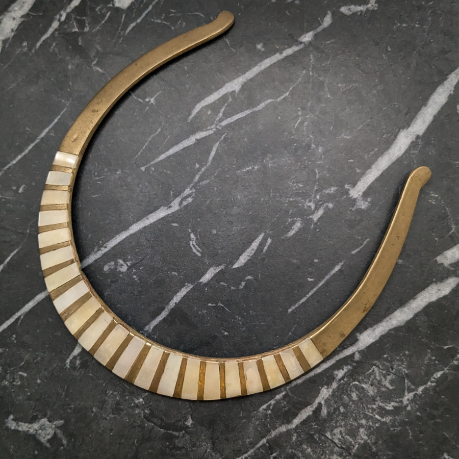 Vintage torque style choker necklace made from solid brass. It is gold in colour and has thin slices of Mother of Pearl set into the brass.