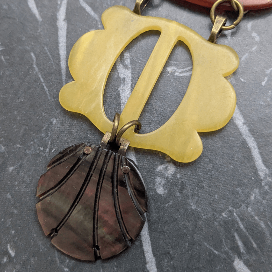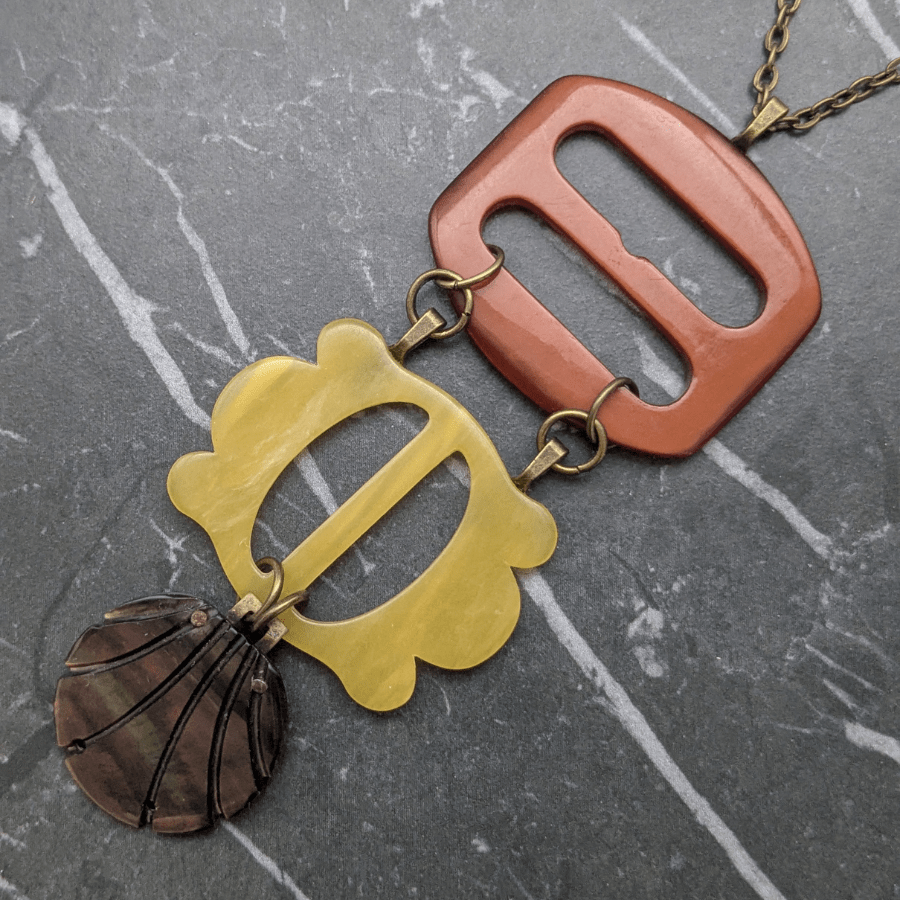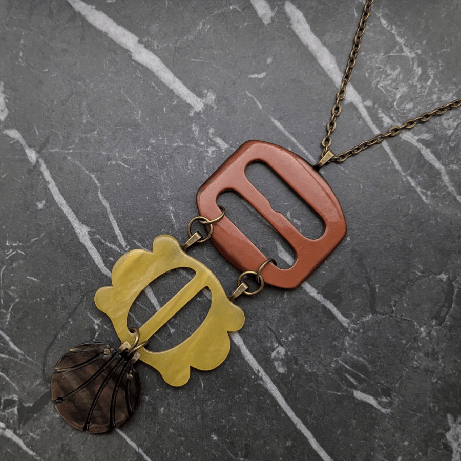 The buckles becomes the focal point of the necklace, suspended like a drop pendant. The buckles are joined by large round jump rings, adding movement and an extra layer of visual interest. The combination of aged metal/plastic, texture, and form creates a piece full of character and history.