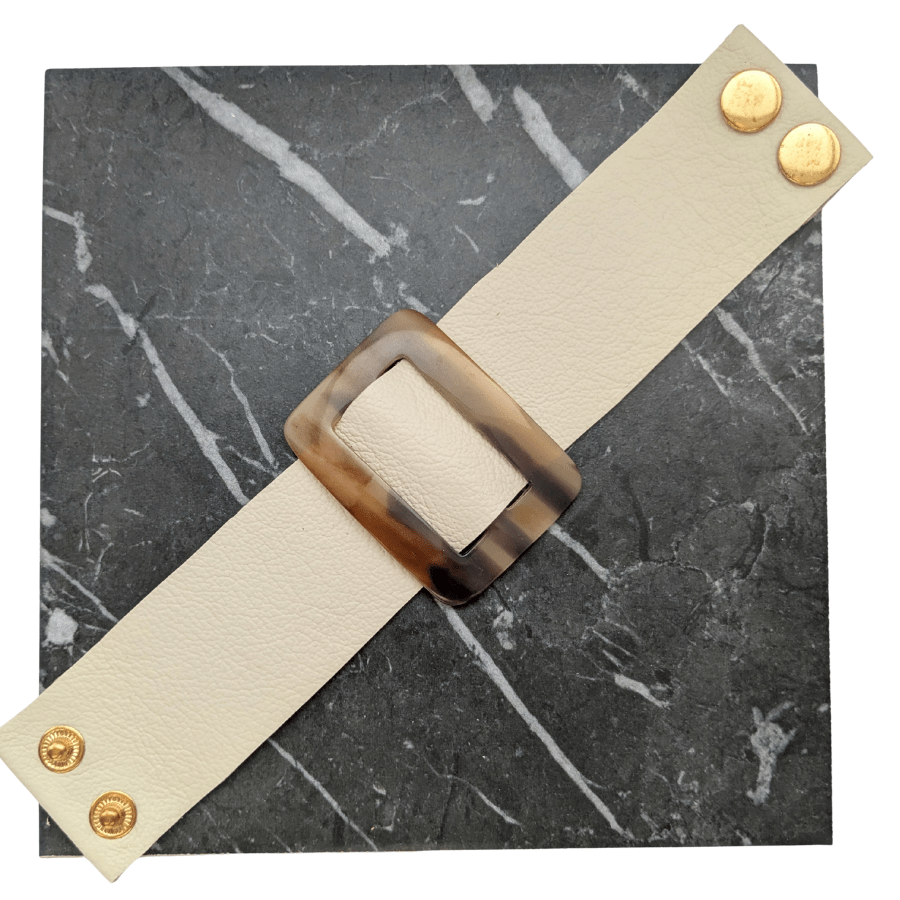 The buckle is slid onto the leather band and becomes the focal point of the bracelet, celebrating the craftsmanship and design of vintage hardware. The bracelet fastens securely with press studs, making it easy to wear while maintaining a clean, stylish finish.