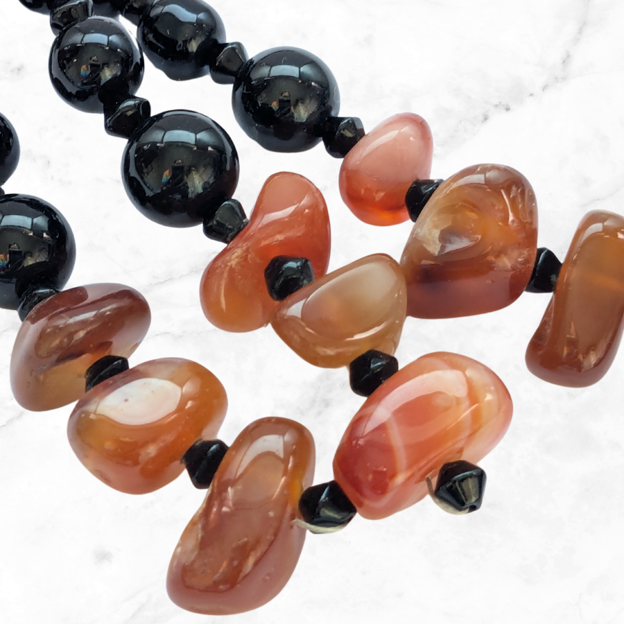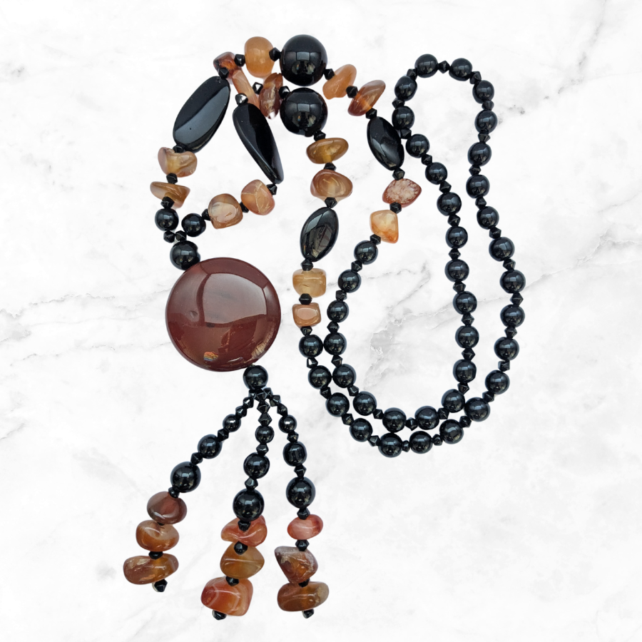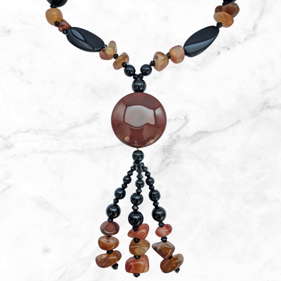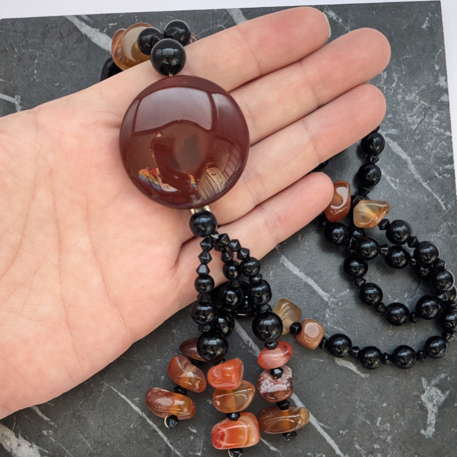 Absolutely stunning vintage gemstone necklace. It features a range of beads including orange carnelian, banded agate and black onyx. The necklace has a large round carnelian pendant with beaded tassel detail.