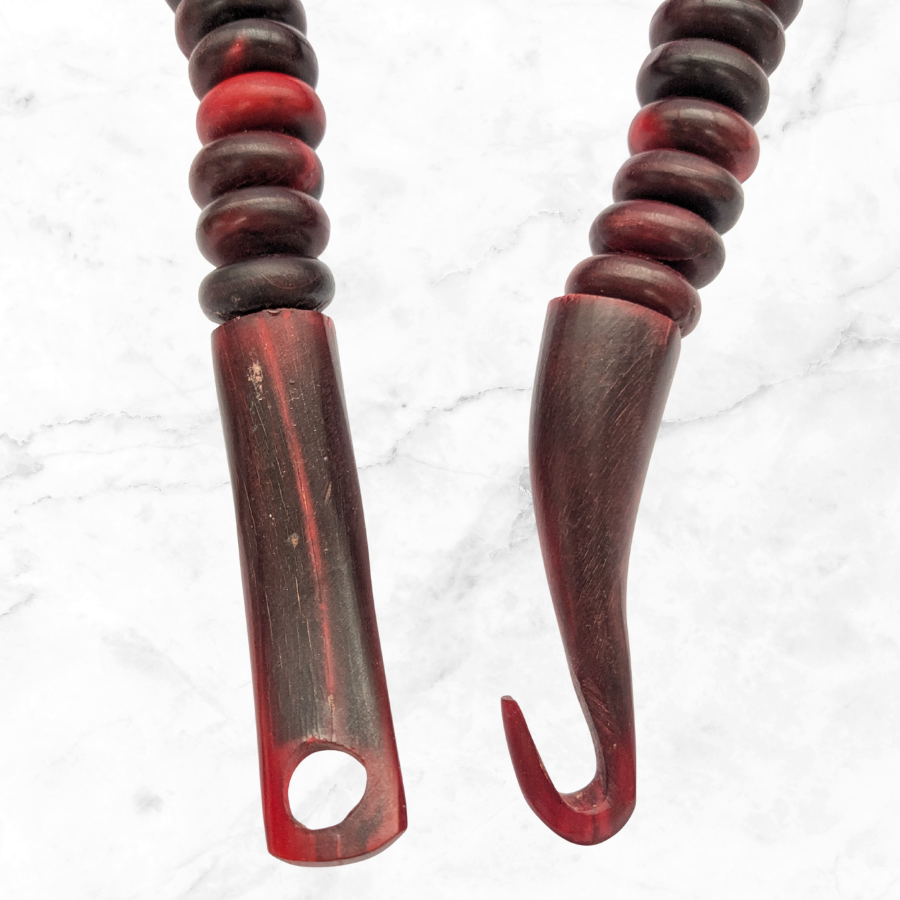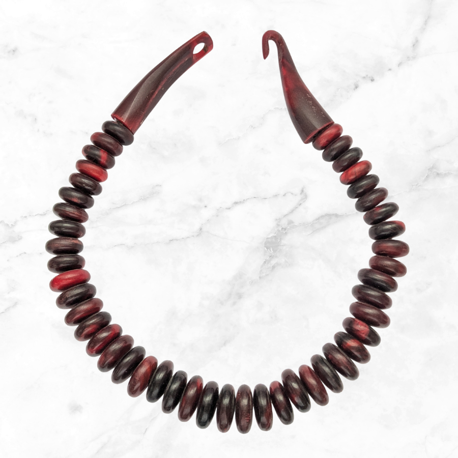 This is a French designer necklace by Catherine Noll. The beads have been dyed a very deep red and are made from buffalo horn. Even the fastening has been carved from horn, a hook and loop design.