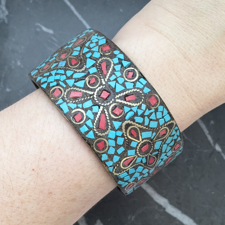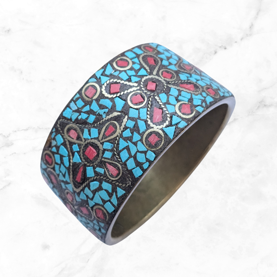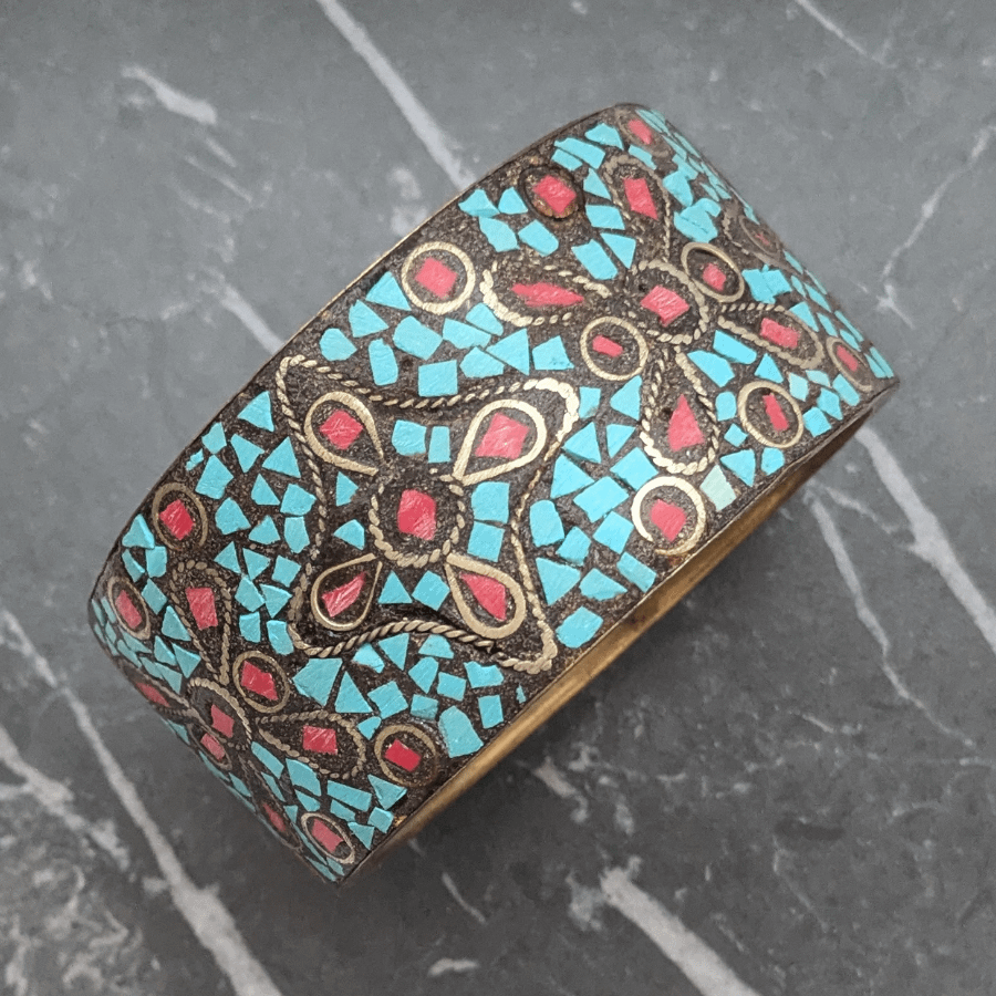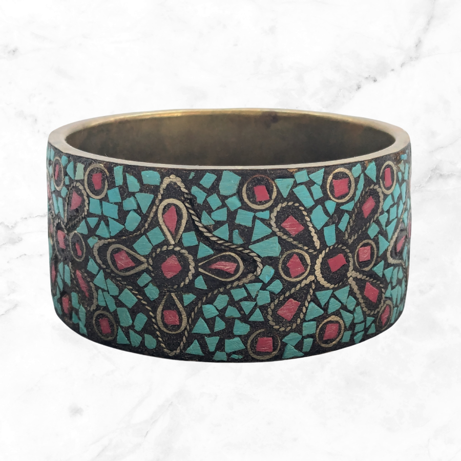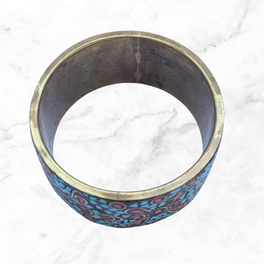 This is a vibrant vintage bangle made from brass and set will small chips of red and blue stone. It would look great as a statement piece or stacked with other bangles.