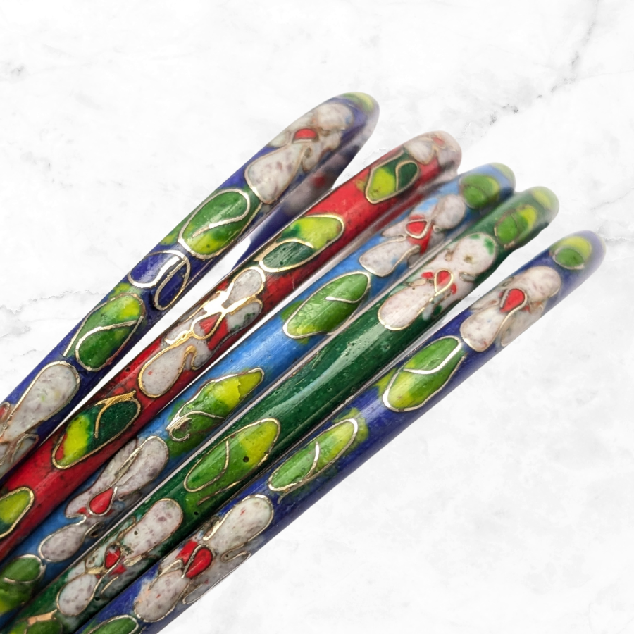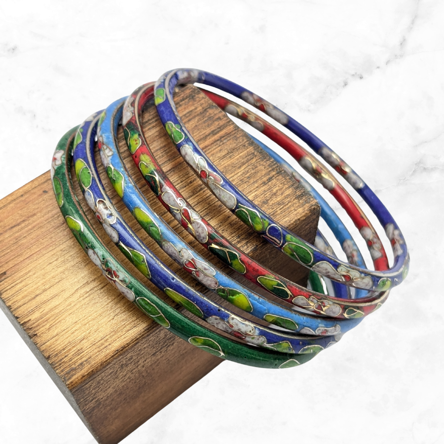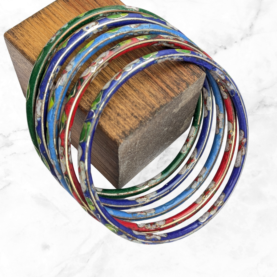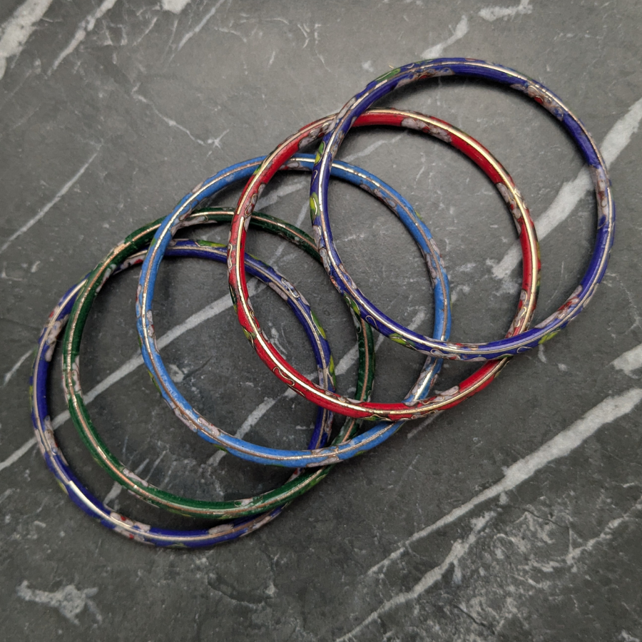 Set of 5x vintage cloisonne bangles. These are great for wearing stacked together or with other bangles. The design is floral and the bangles are red, blue, green and light blue.