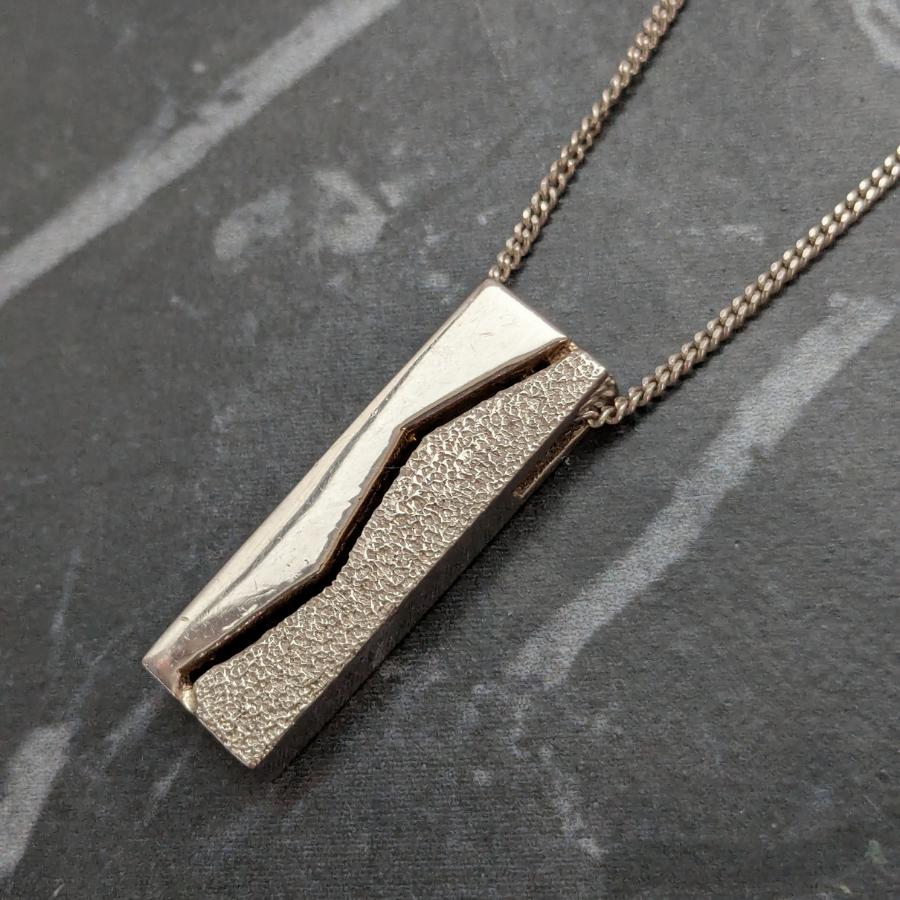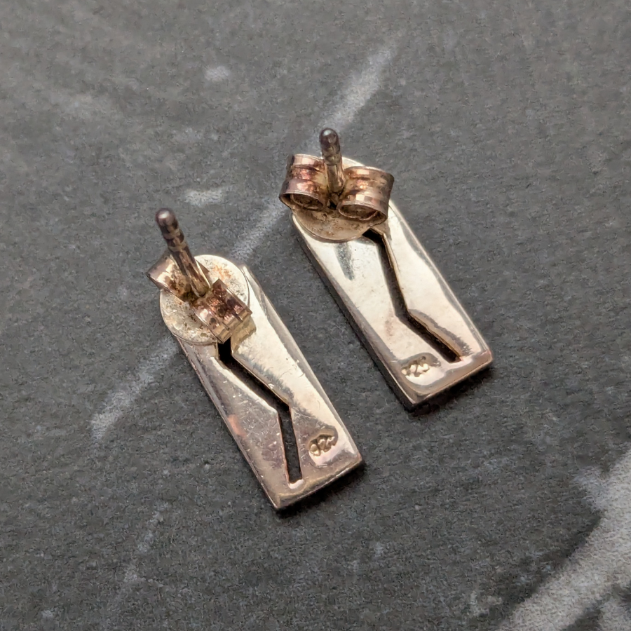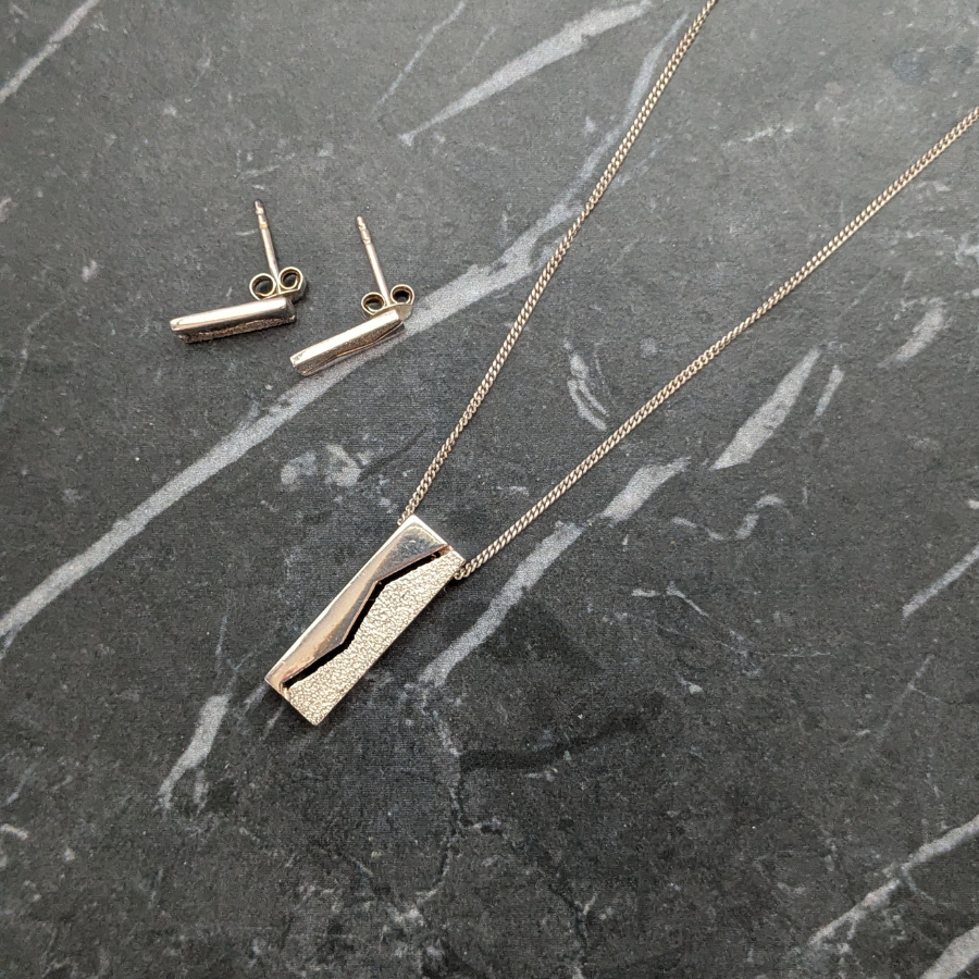 Vintage sterling silver jewellery set by Elizabeth Duke – Argos. The set includes a pair of stud earrings in a rectangular shape and a matching pendant necklace. All stamped 925 for sterling silver.