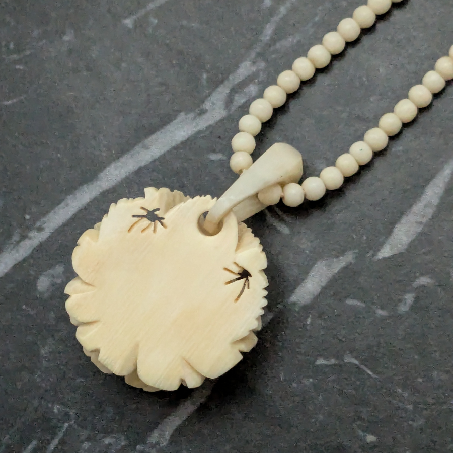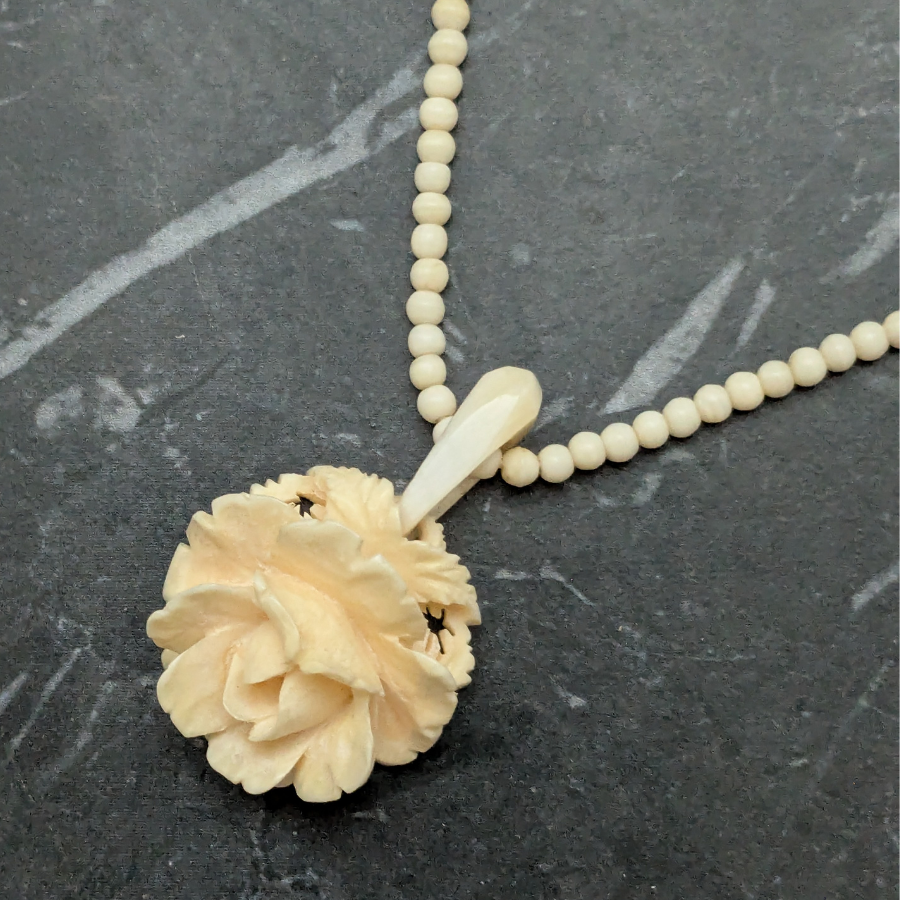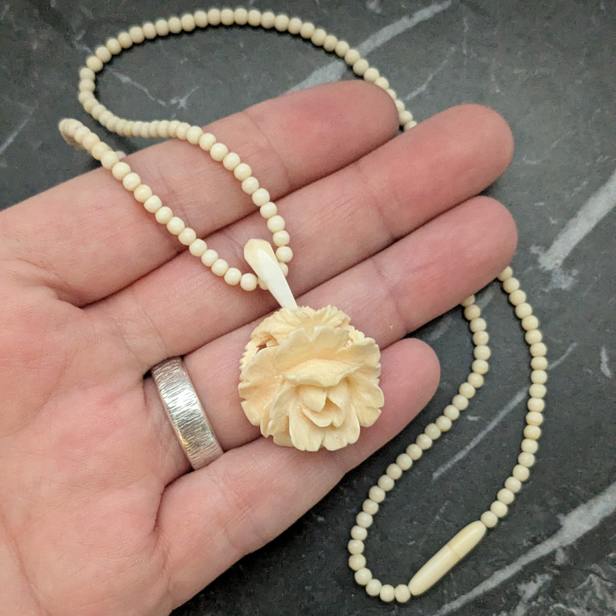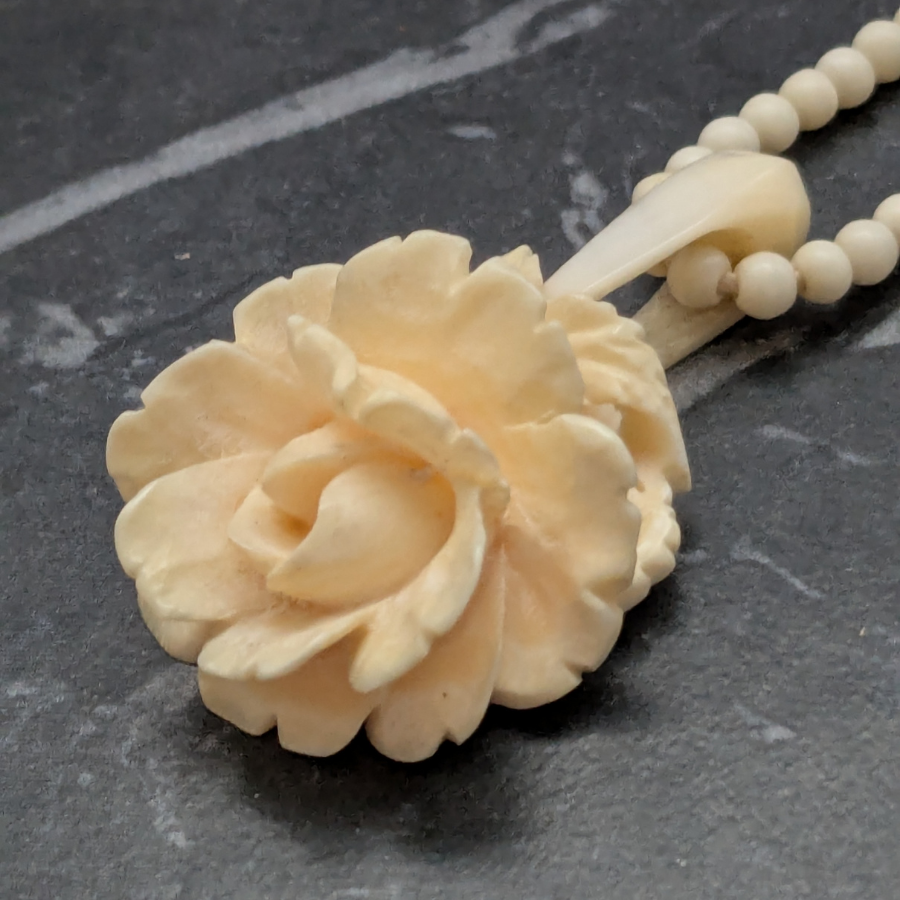 Vintage necklace made from bovine bone. The bone used is often a by-product and has been hand carved in to the shape of small round beads and a rose pendant. Fastens with a barrel clasp.