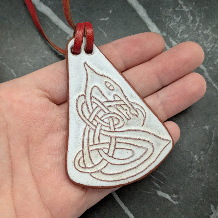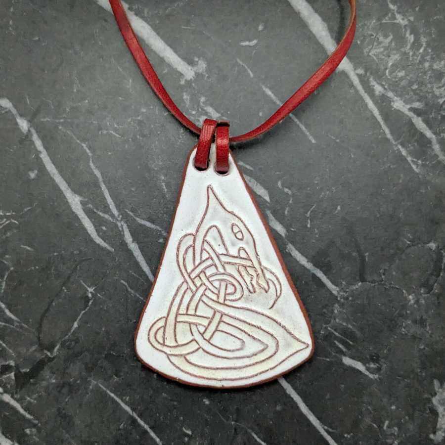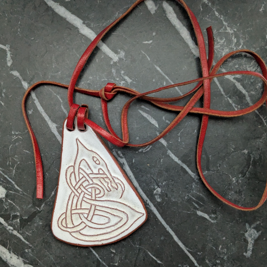 Vintage necklace made from red leather cord and a large terracotta pendant. The pendant has a white glazed surface and the design is of a serpent eating its own tail.