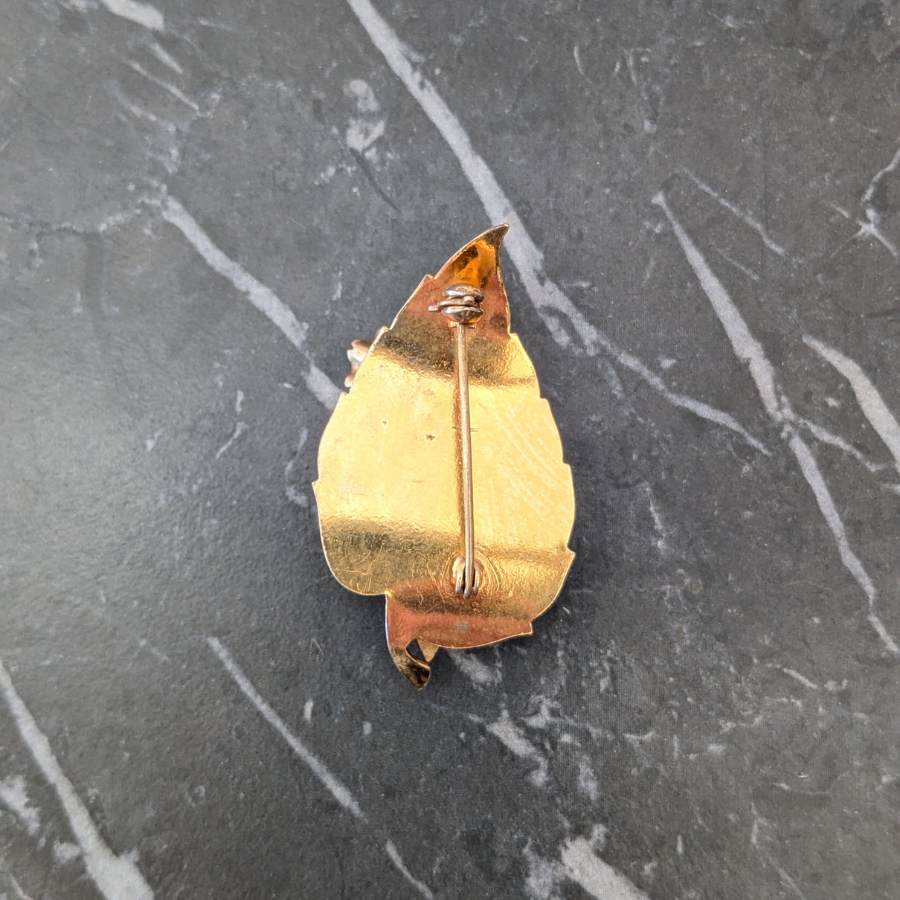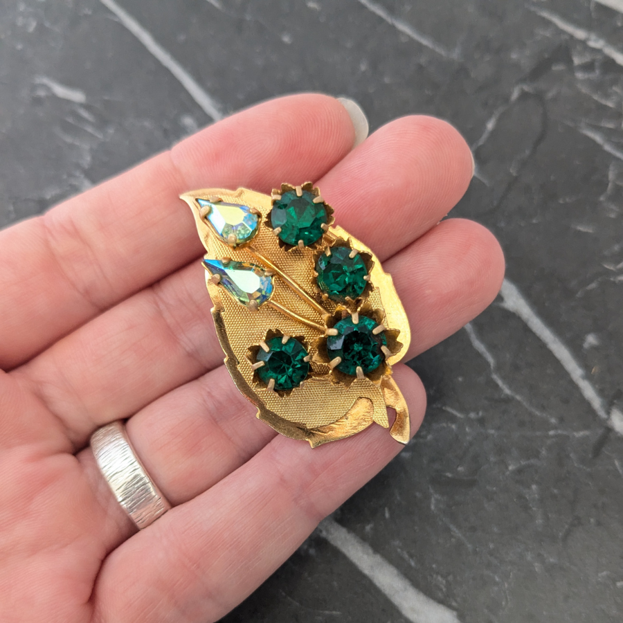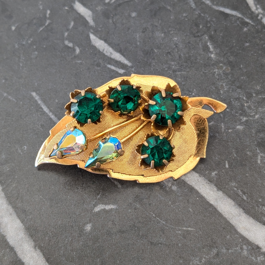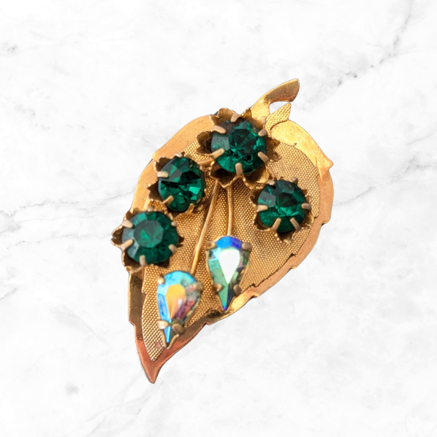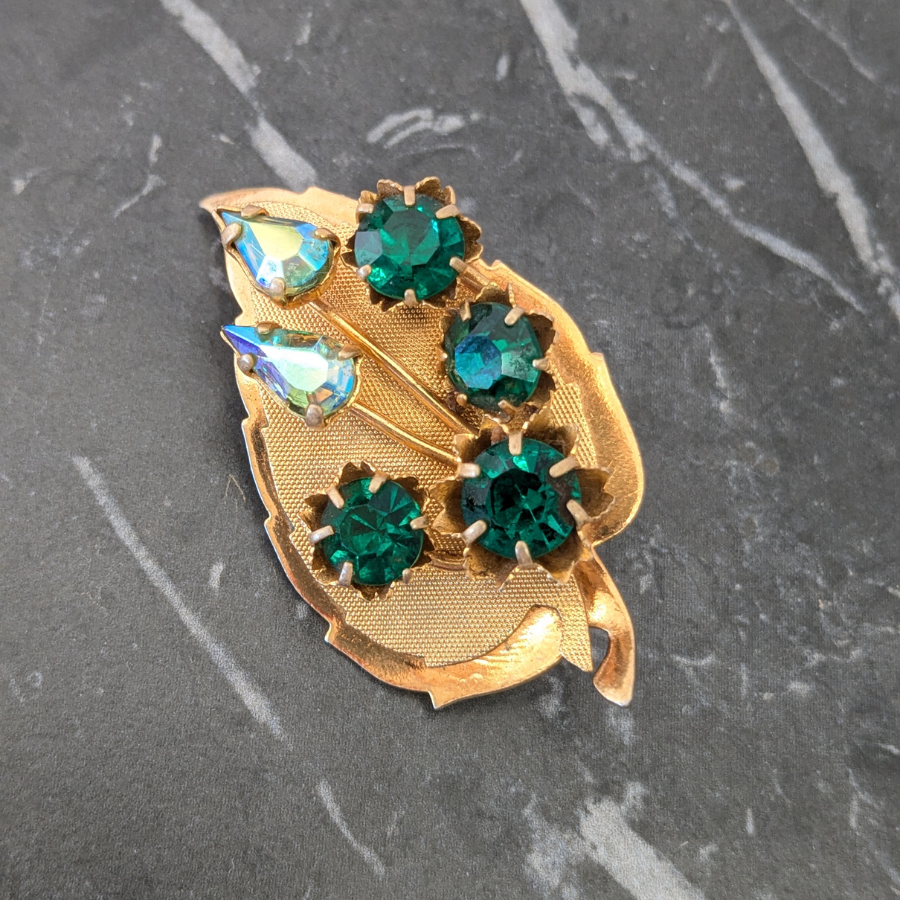 Vintage leaf brooch with a layered design. Made from a gold tone metal, the brooch has a curved shape and has been finished with some emerald green and blue aurora borealis rhinestones.