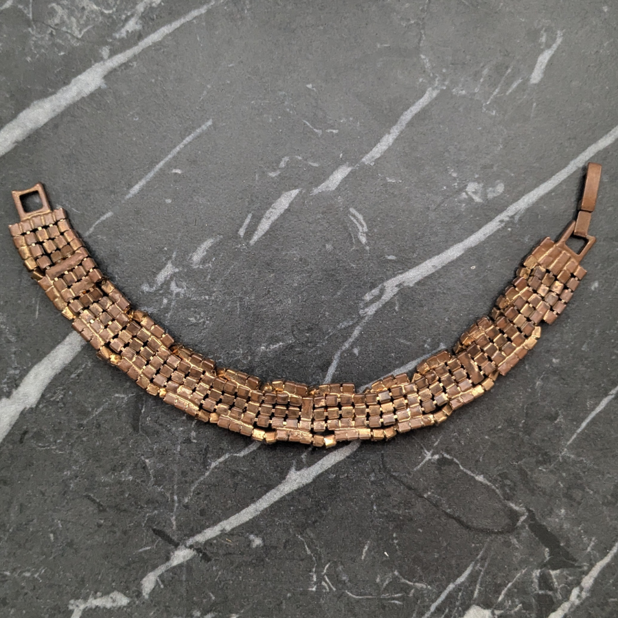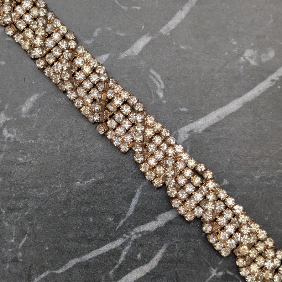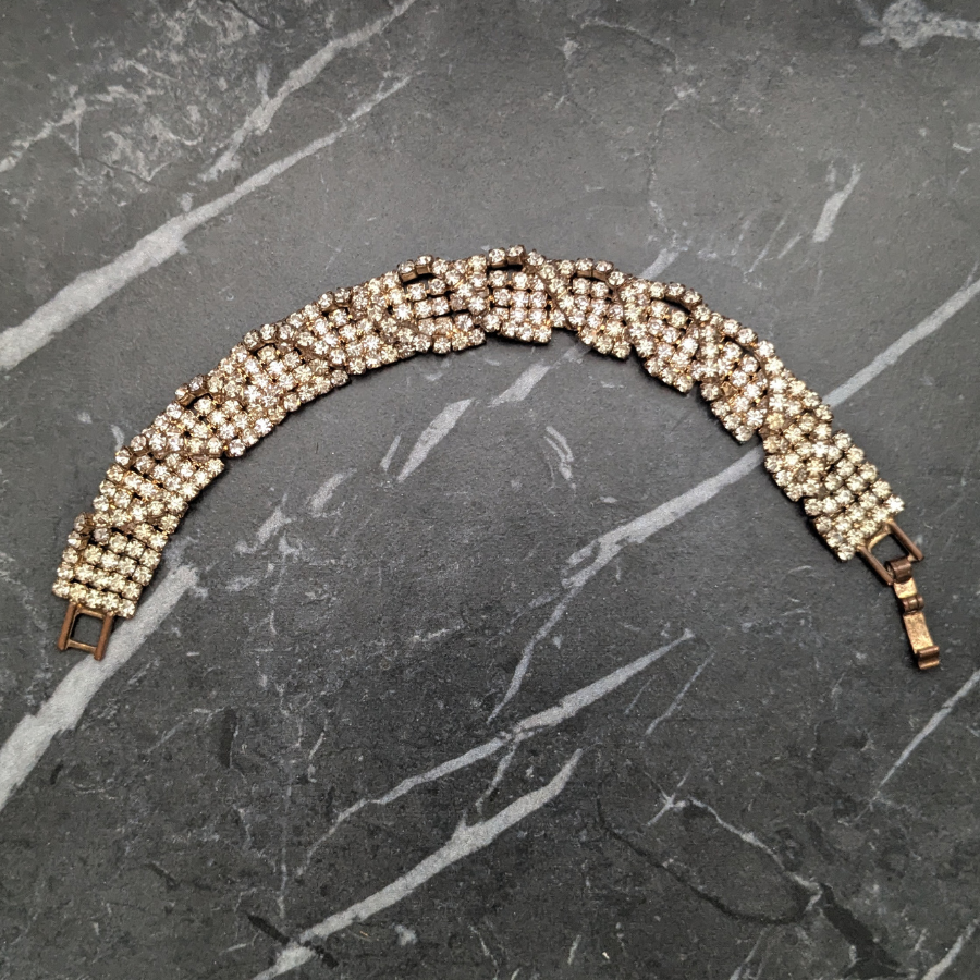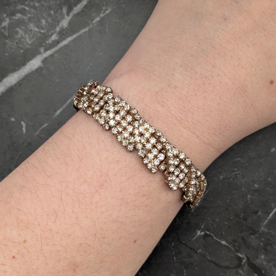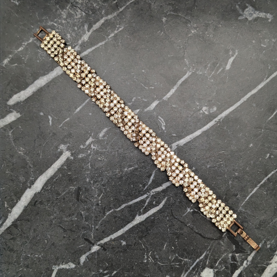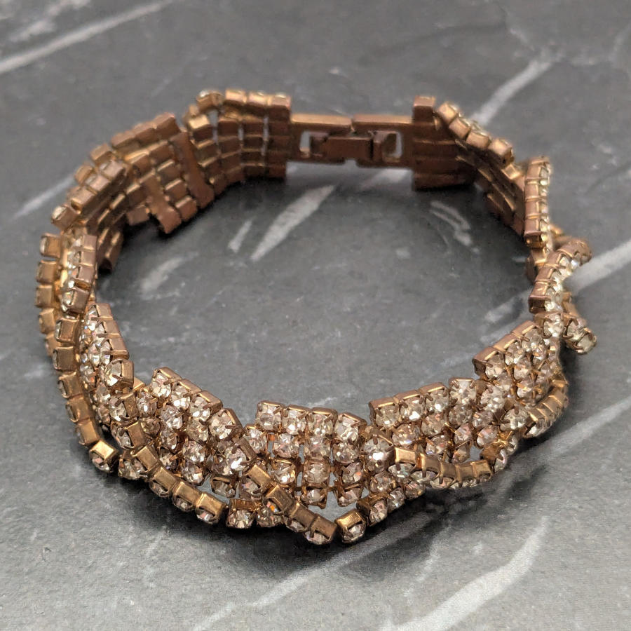 Vintage bracelet from the 1950s. It is made from copper and has a thin gold plating, most of which has worn away over time. It is set with small sparkling rhinestones and has a twist design.