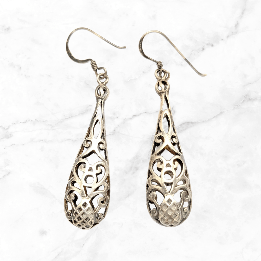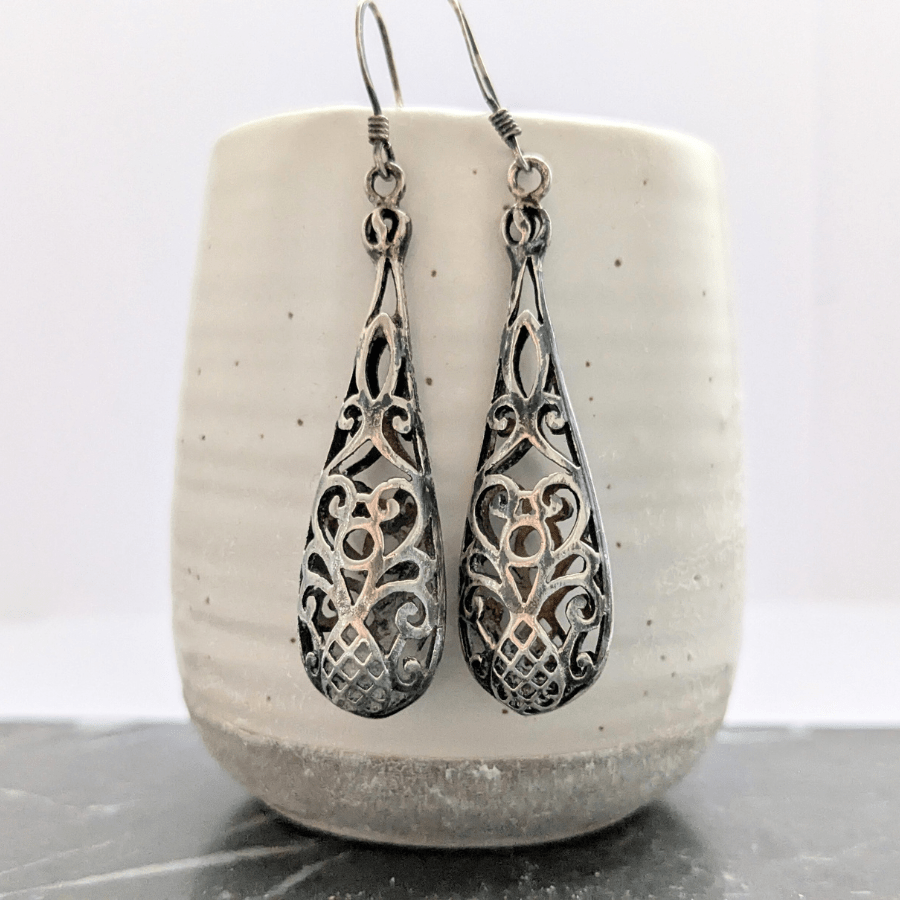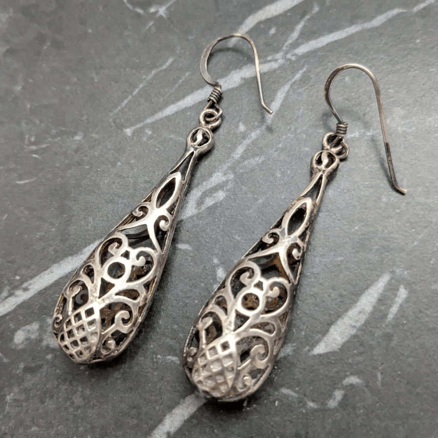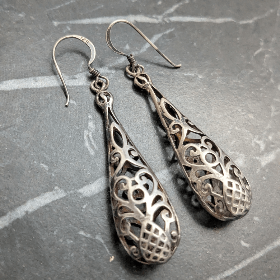 Vintage 1990s earrings in the shape of teardrops. These are made from sterling silver and have open filigree detail. They are stamped 925 and are for pierced ears.