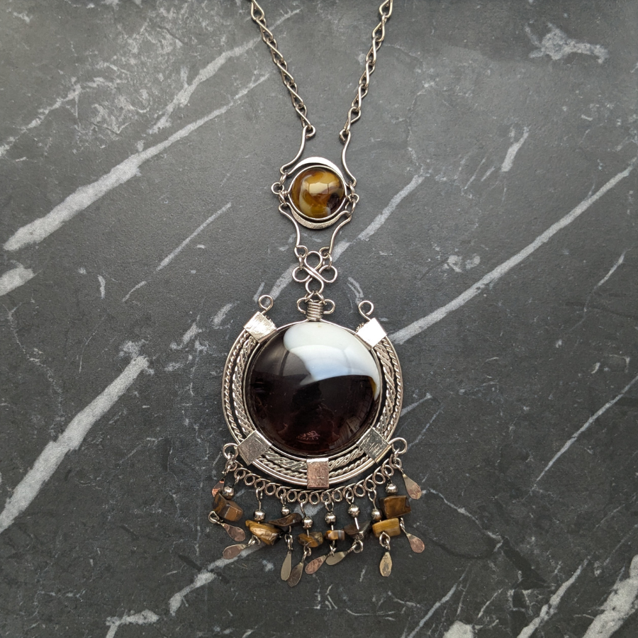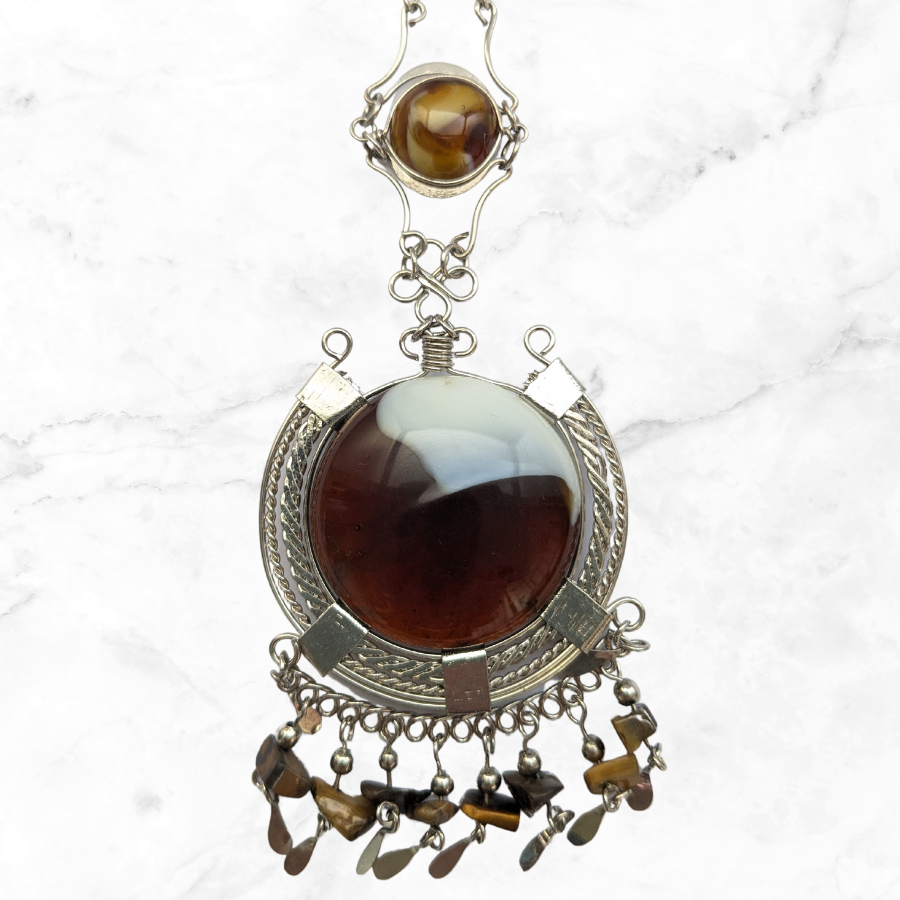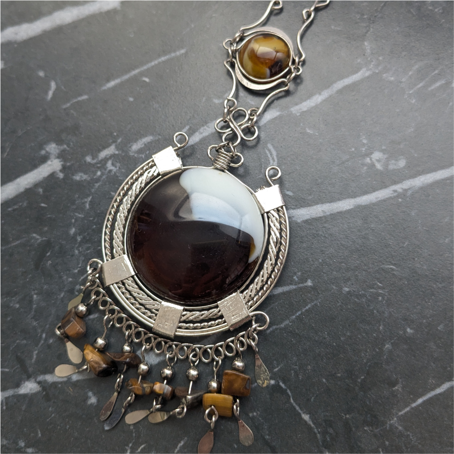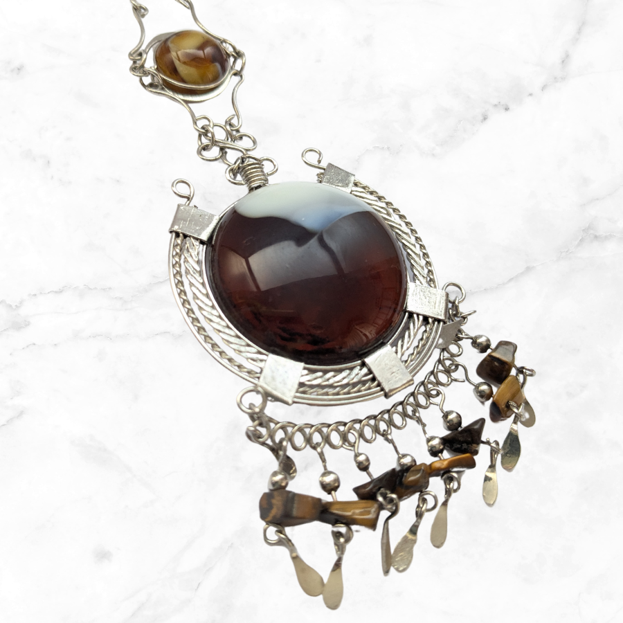 Beautiful vintage, Peruvian style necklace. It features a large glass pendant, root beer and cream in colour. It also has small tigers eye, chip beads dangling down at the bottom and sits on a silver tone chain.