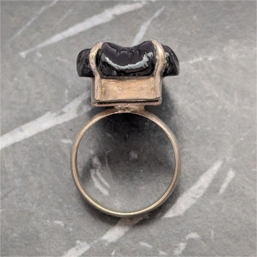 Vintage ring featuring a black glass cabochon, rectangular with a flower design. The glass is held in place by prongs and the body of the ring is made from a white metal (Not Silver).