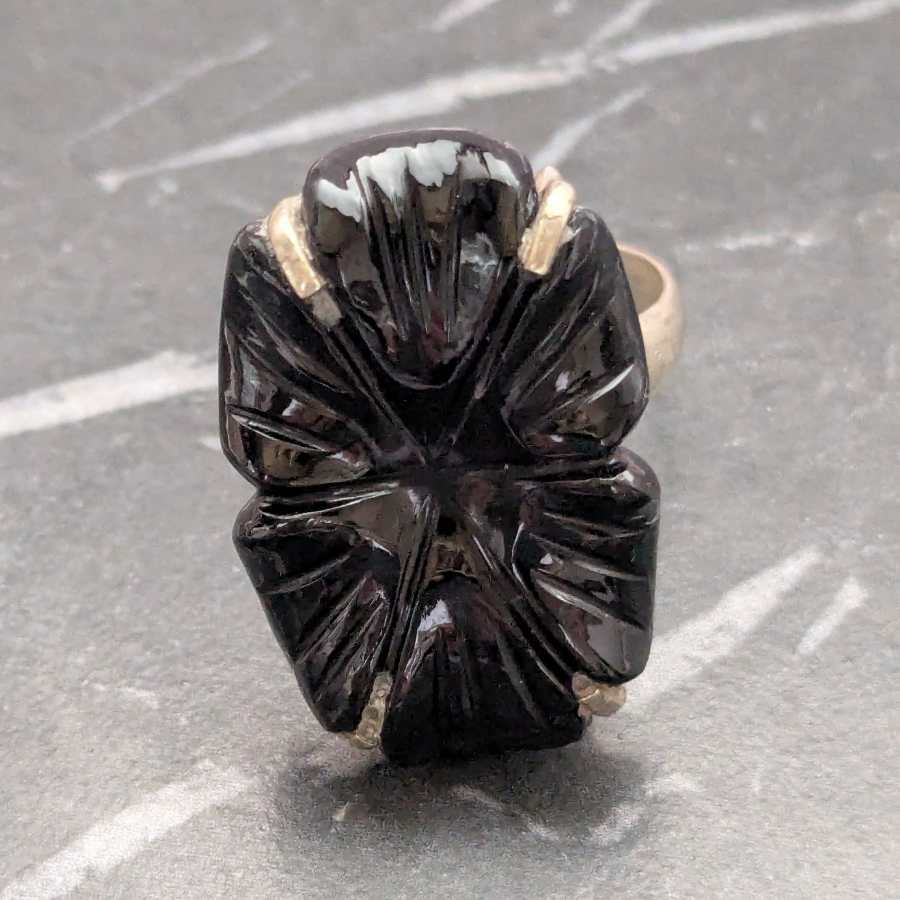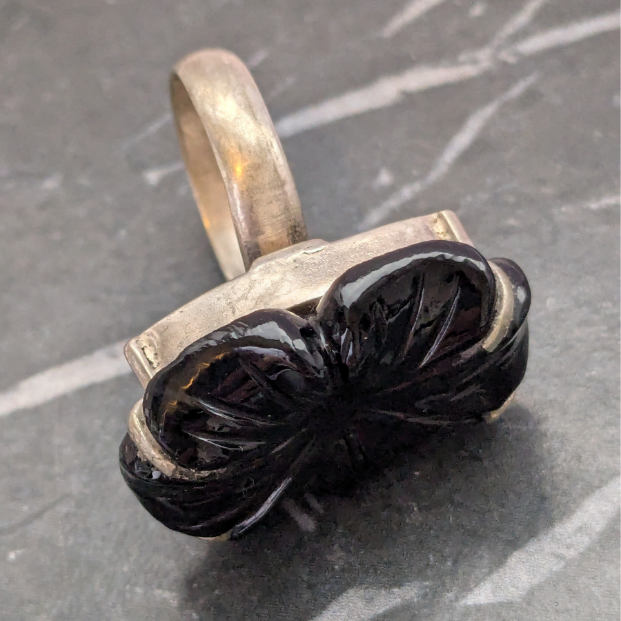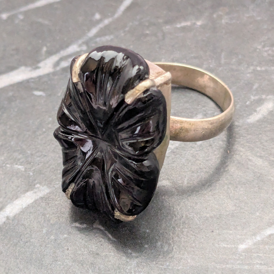 Vintage Ring With Black Glass Flower Cabochon