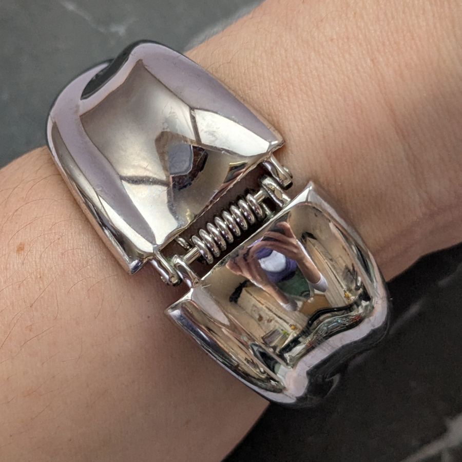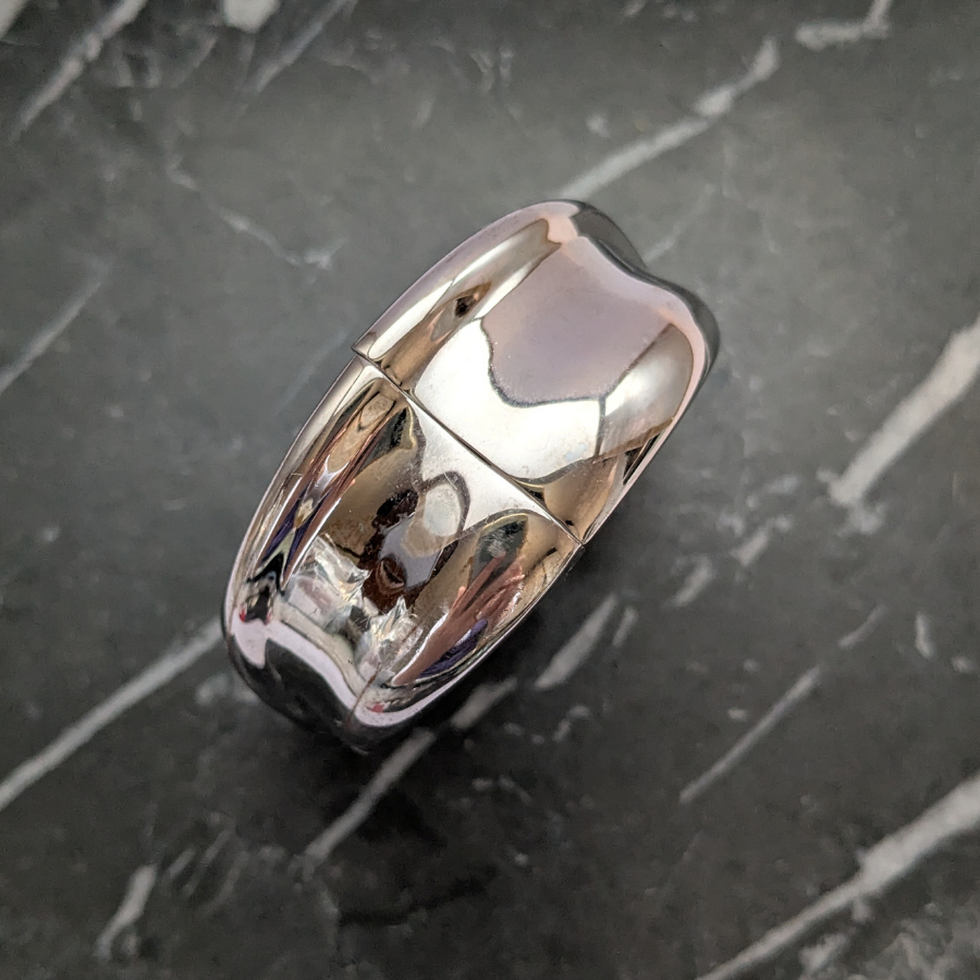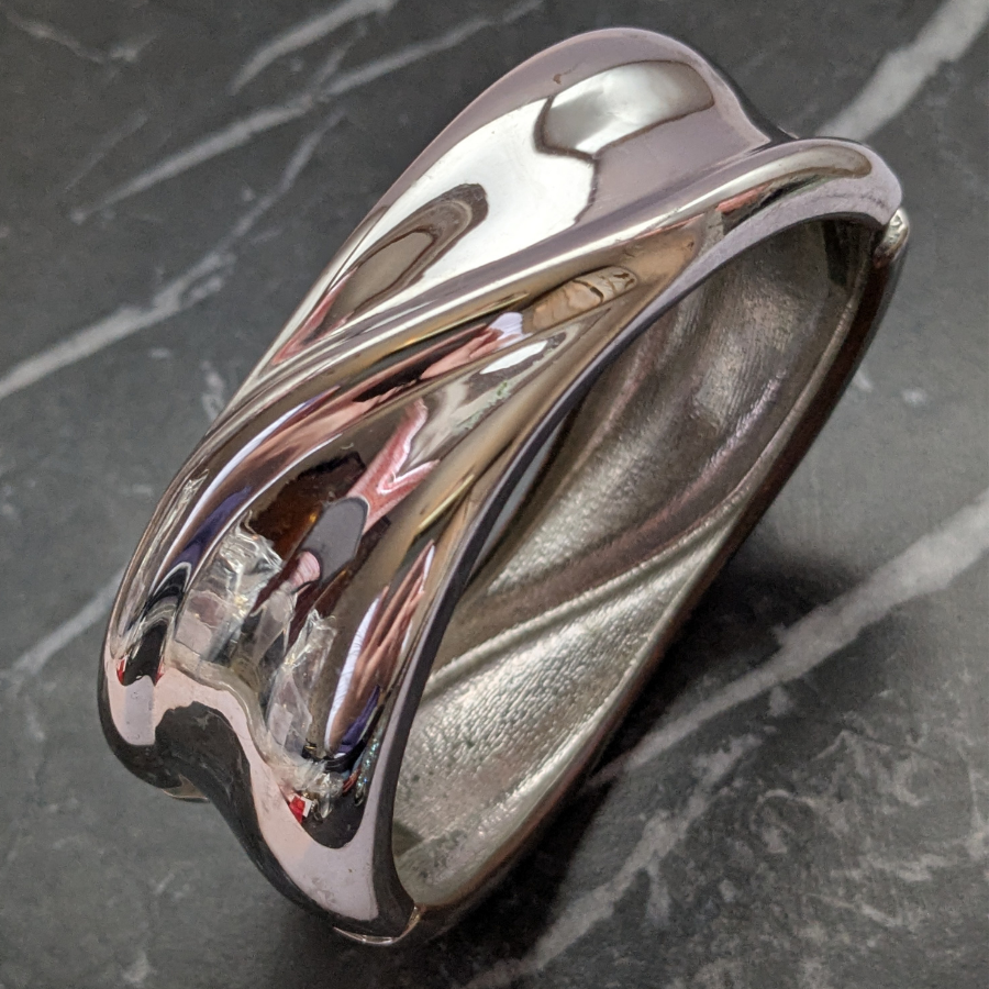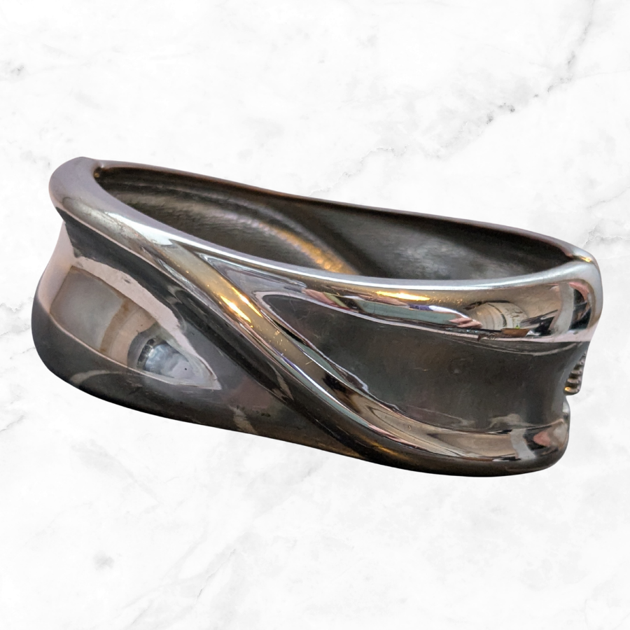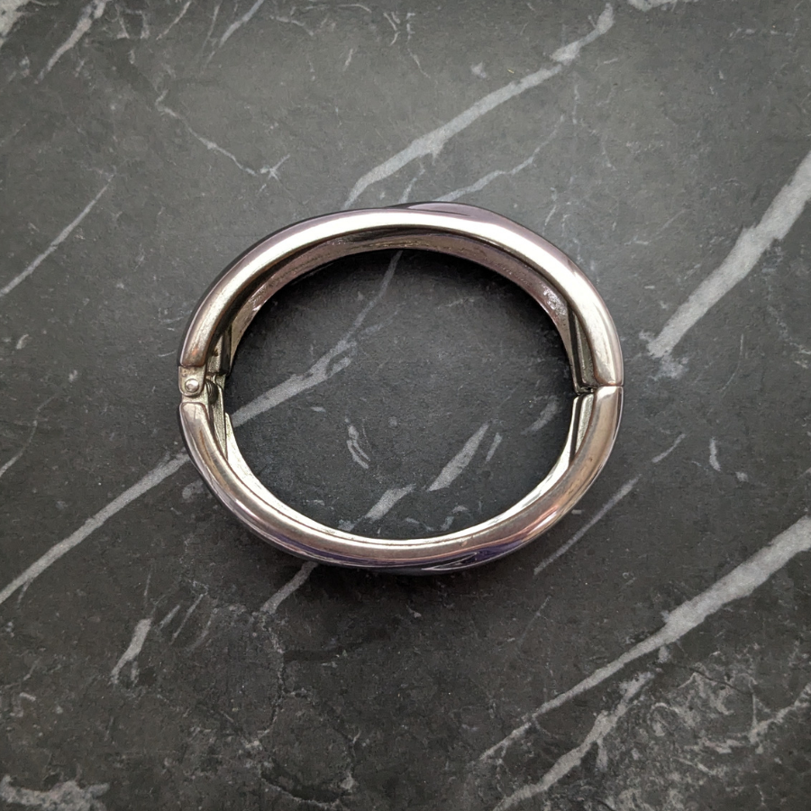 Vintage 1980s chunky silver plated bangle. This one opens on a hinge and polishes up beautifully! Great worn on its own or stacked with other bangles.