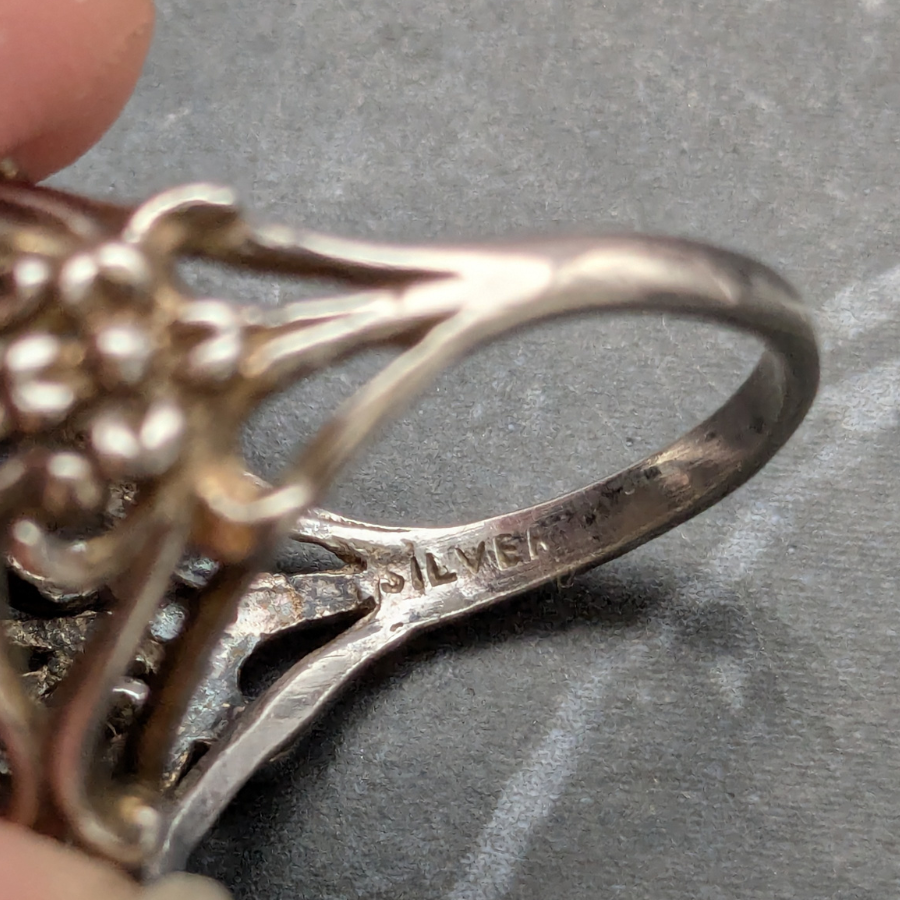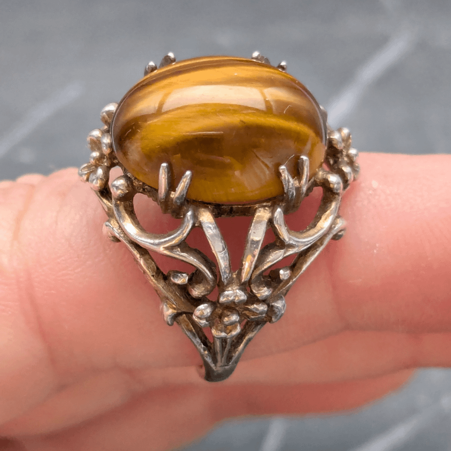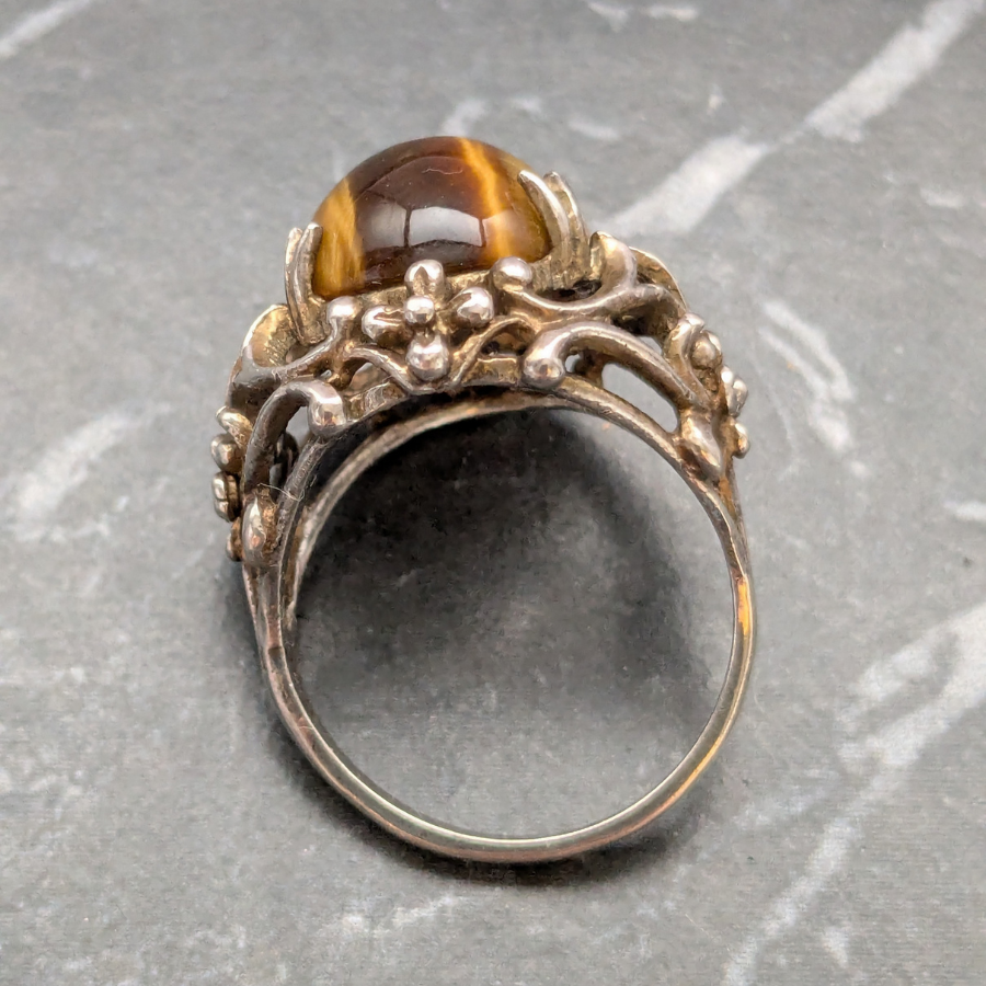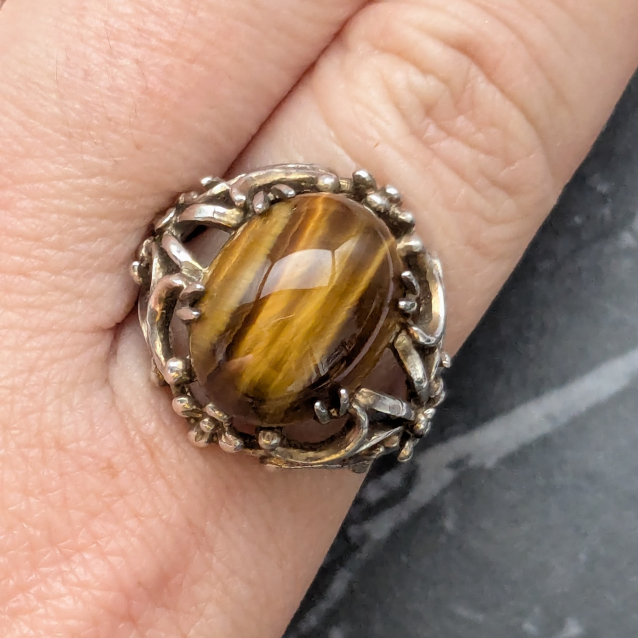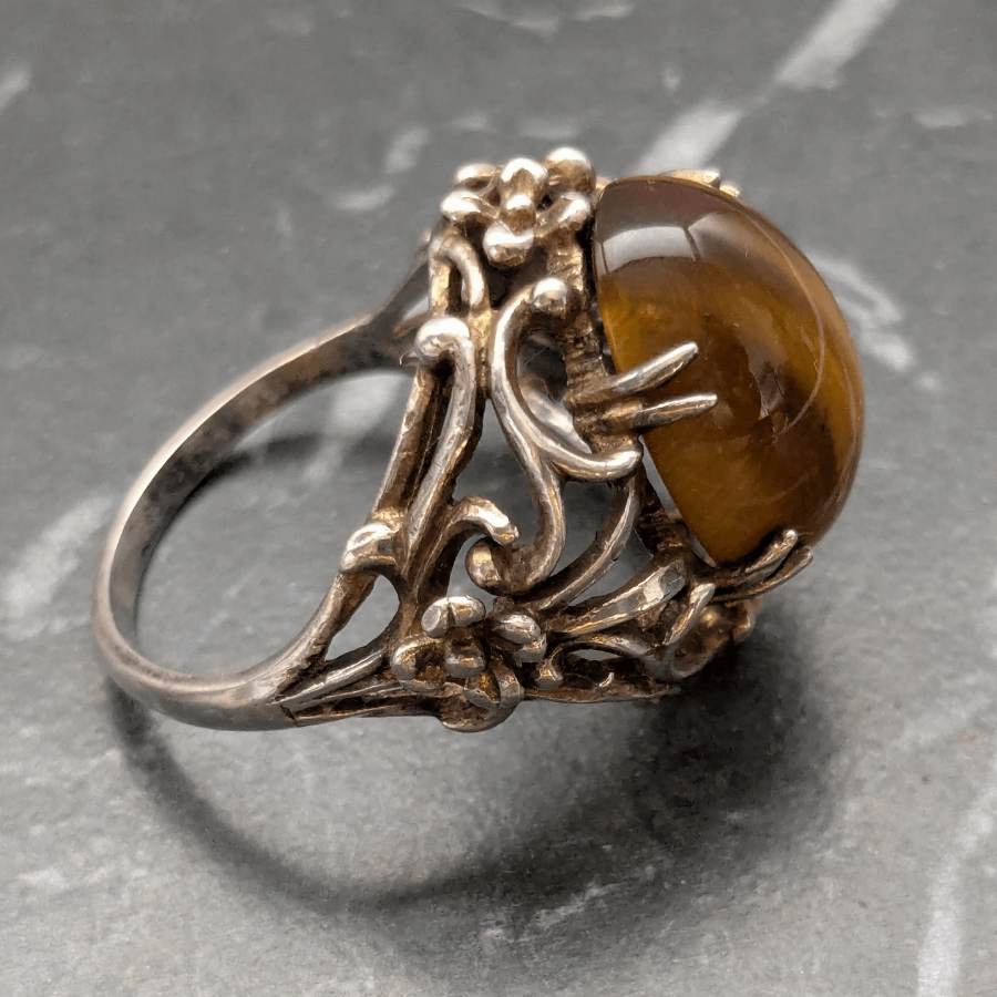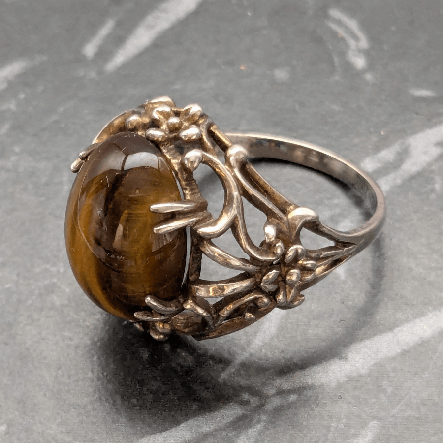 Sterling silver and tigers eye gemstone ring. The gemstone is oval in shape, domed and set into a decorative frame. It is held in place by a set of prongs. Stamped SILVER on the inside of the band.