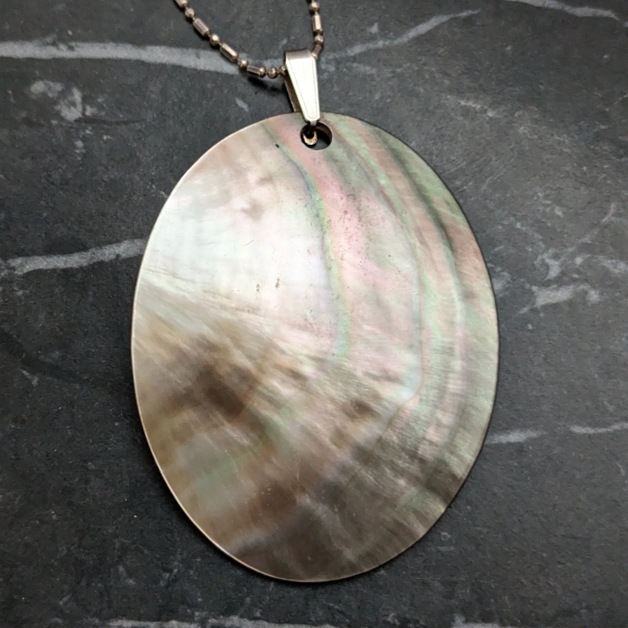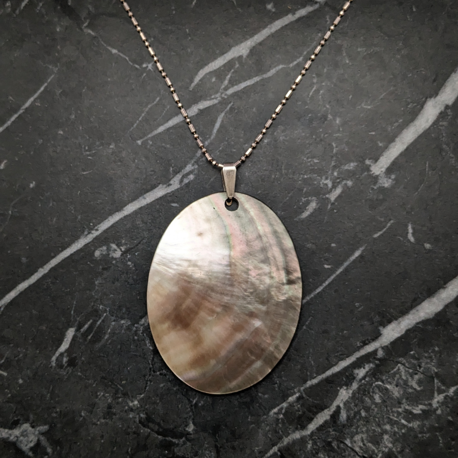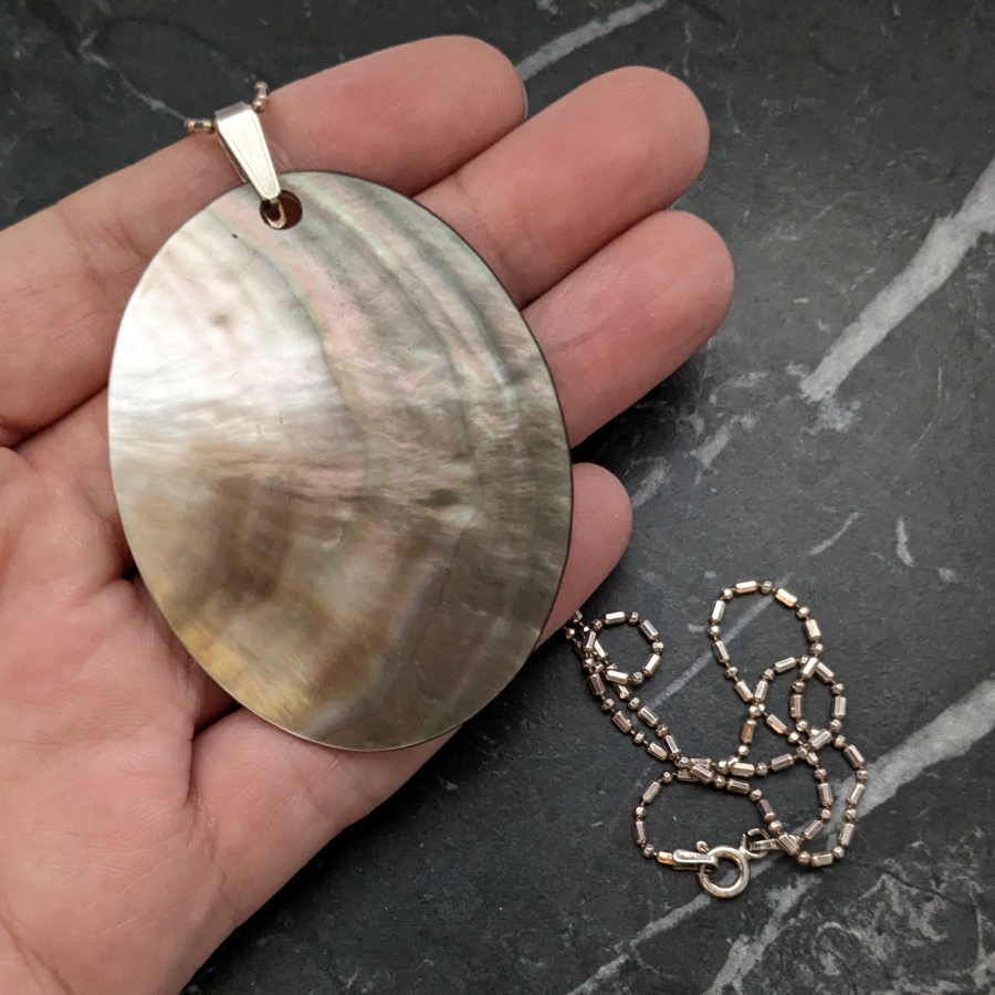 Vintage sterling silver chain with a large Mother of Pearl pendant. The pendant is oval in shape and has a slight curve to it. It shines beautifully and shows flashes of pink, green and blue. Fastens with a spring ring clasp.