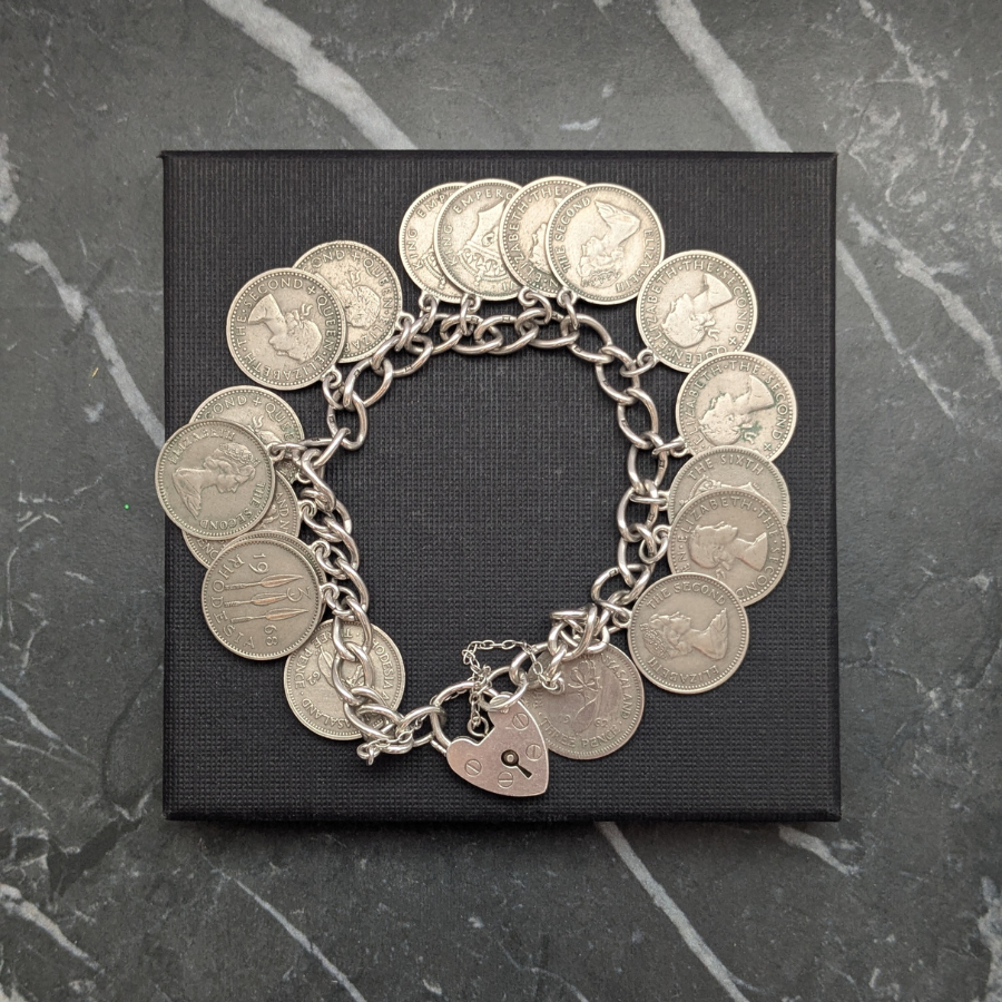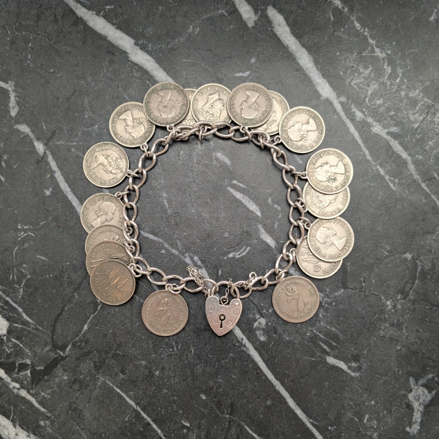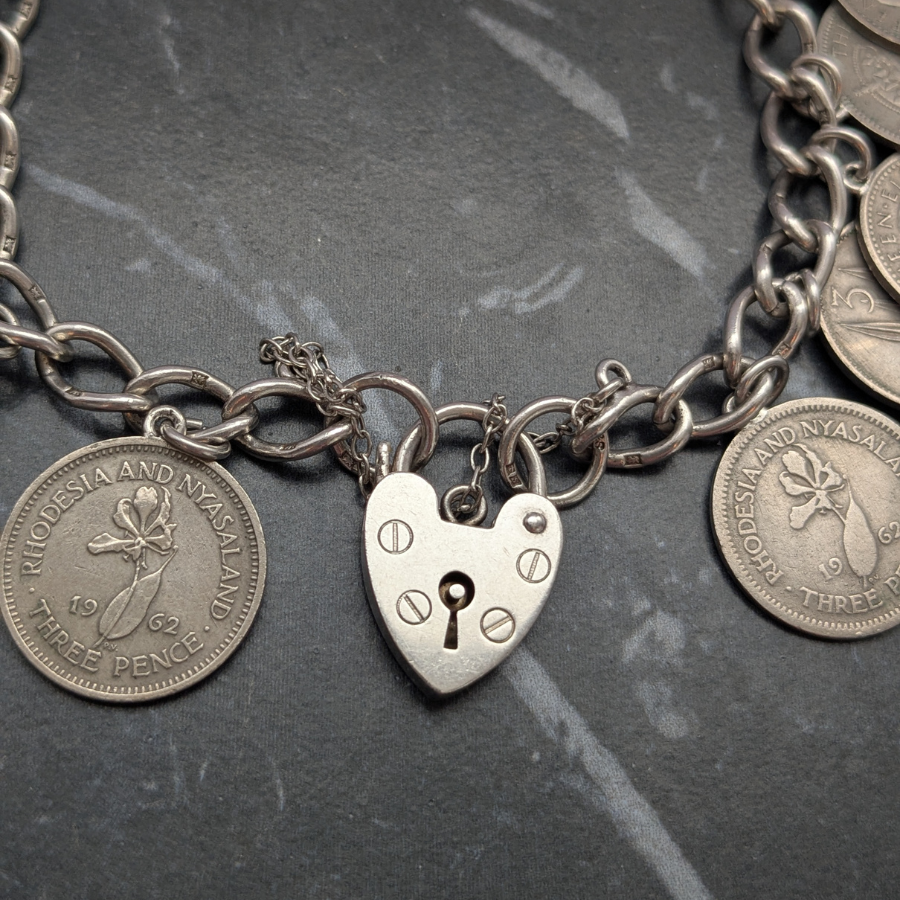Vintage sterling silver charm chain. It fastens with a silver heart locket, signed MG&S and has the stamps for Birmingham, England 1967. Each individual link is stamped and the bracelet has a dainty safety chain.