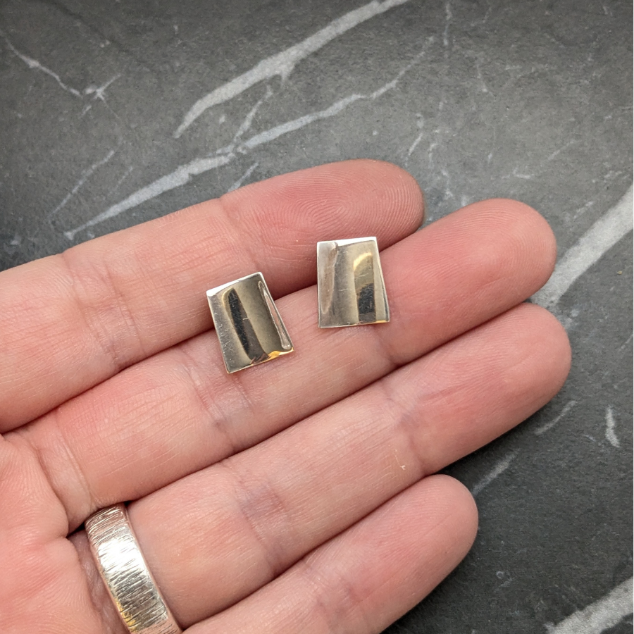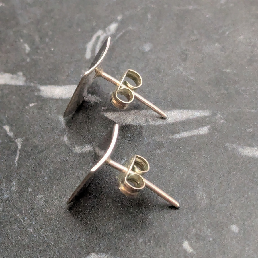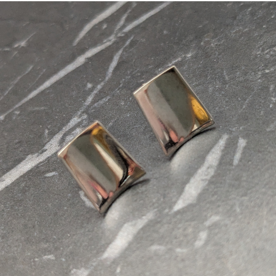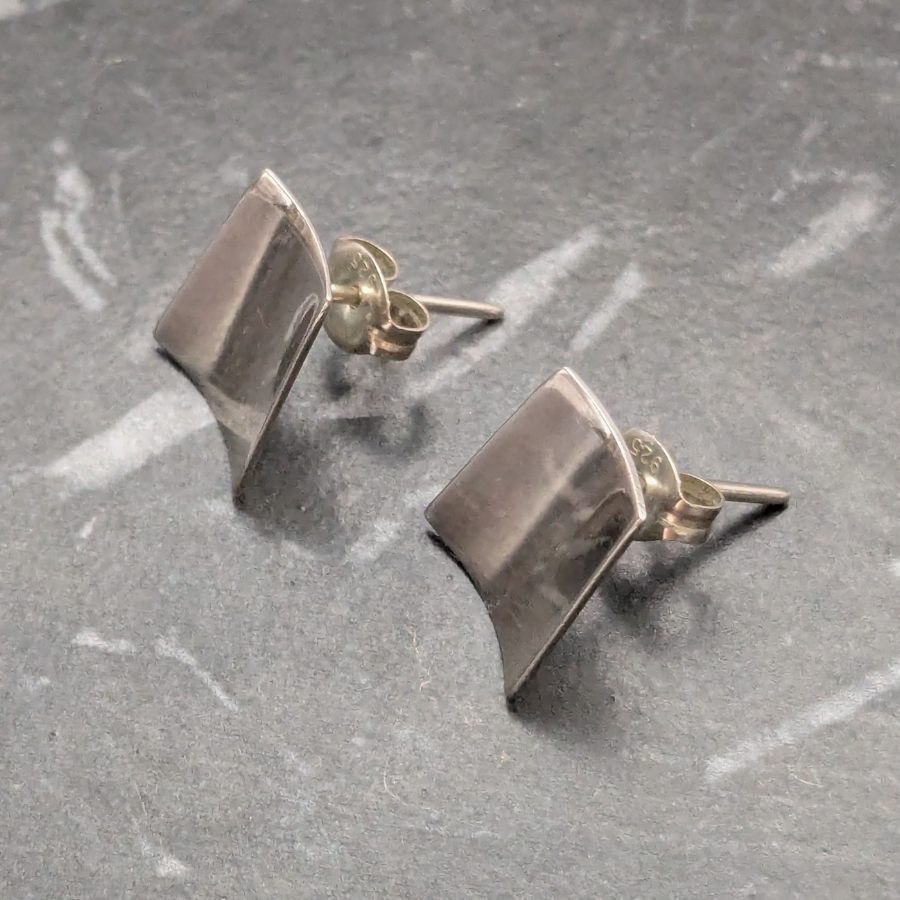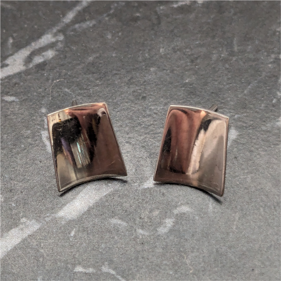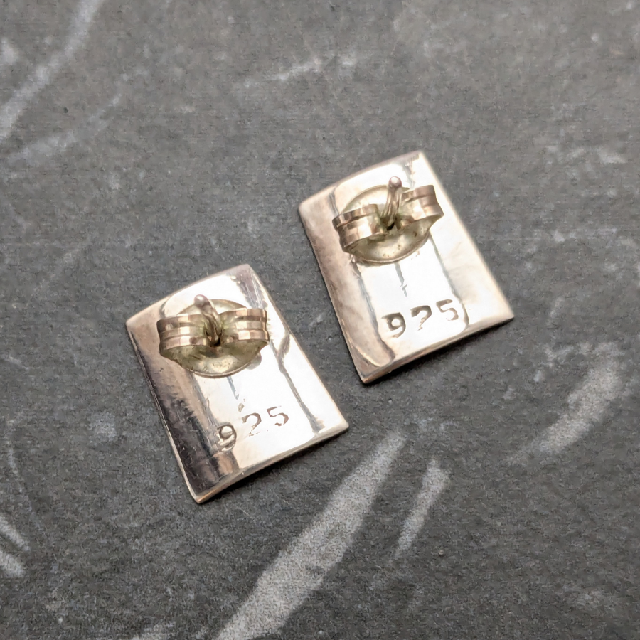 Pair of vintage sterling silver stud earrings. The shape is a curved rectangle and they’re stamped 925 for silver on the back. Comes with silver butterfly backs.