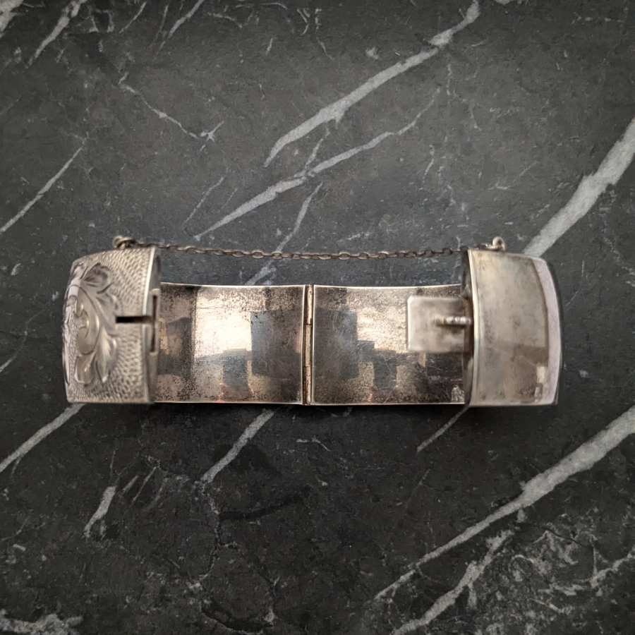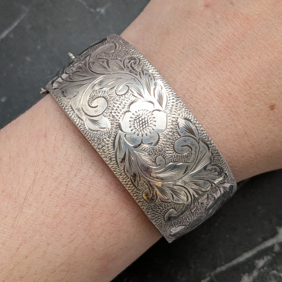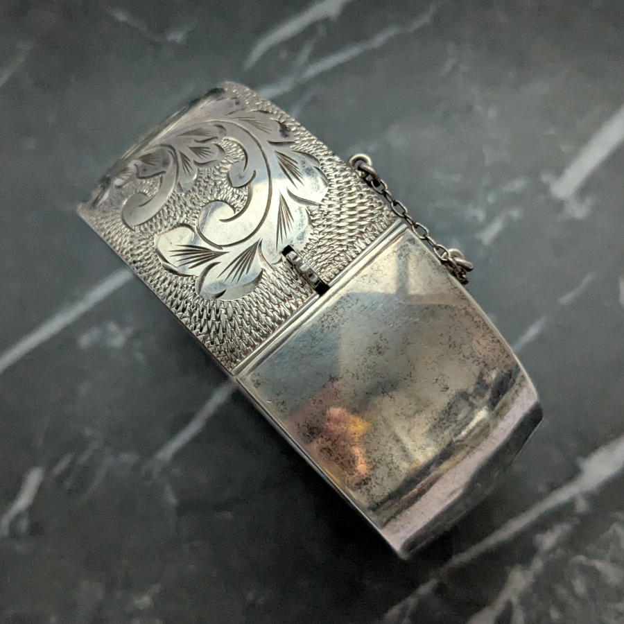 Vintage bangle made from sterling silver and engraved with a flowers and leaves. It opens on a hinge and has a safety chain. It is stamped on the inside: