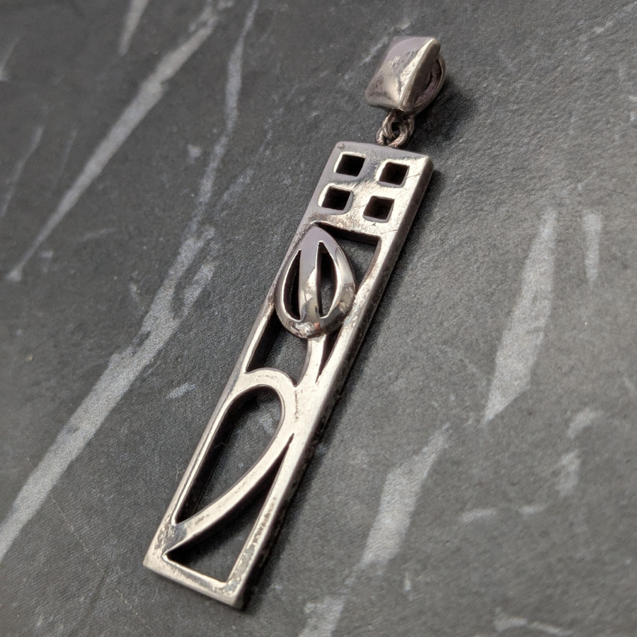 Vintage Rennie Mackintosh style pendant. Made from sterling silver in a rectangular shape with a Tulip flower design and cut out detail.